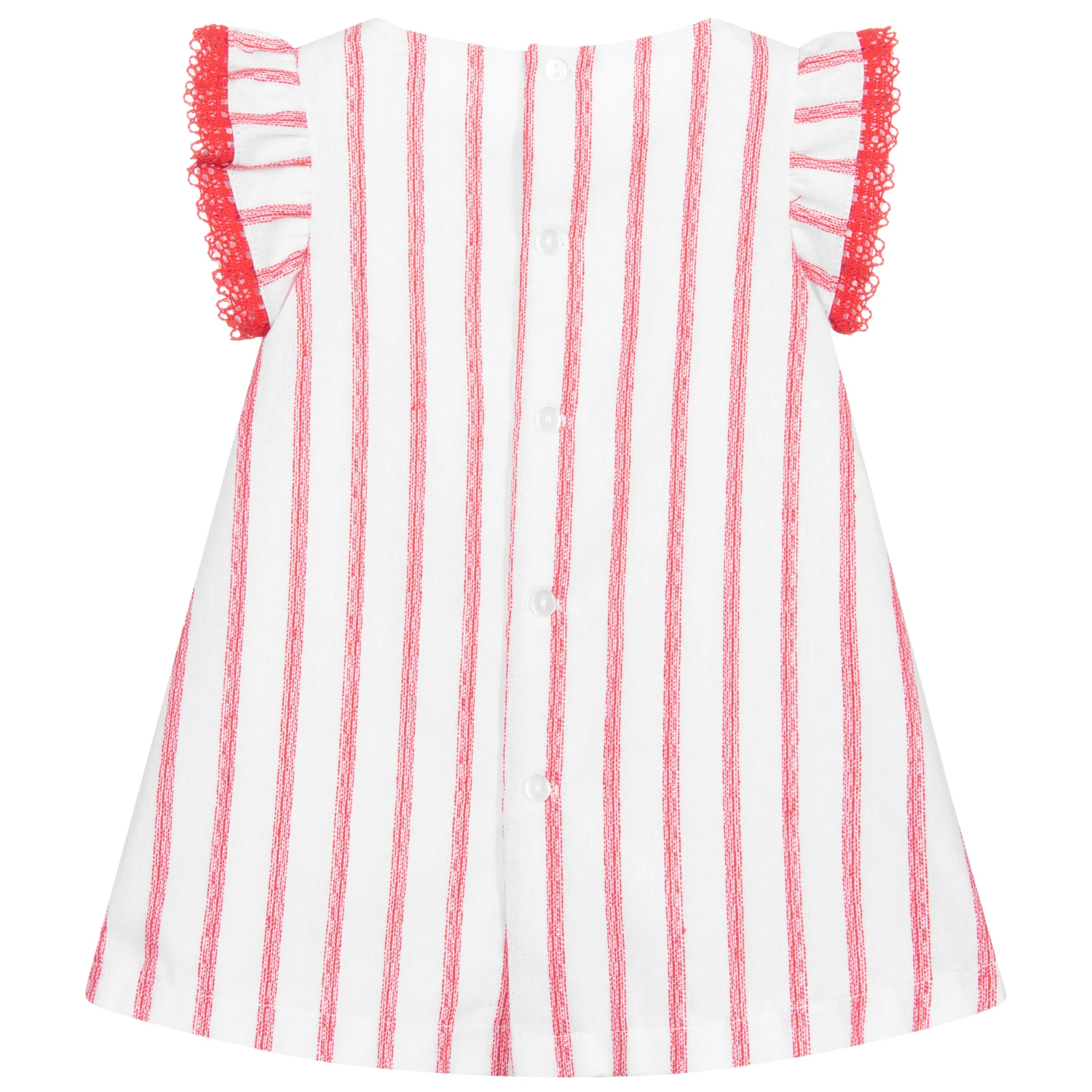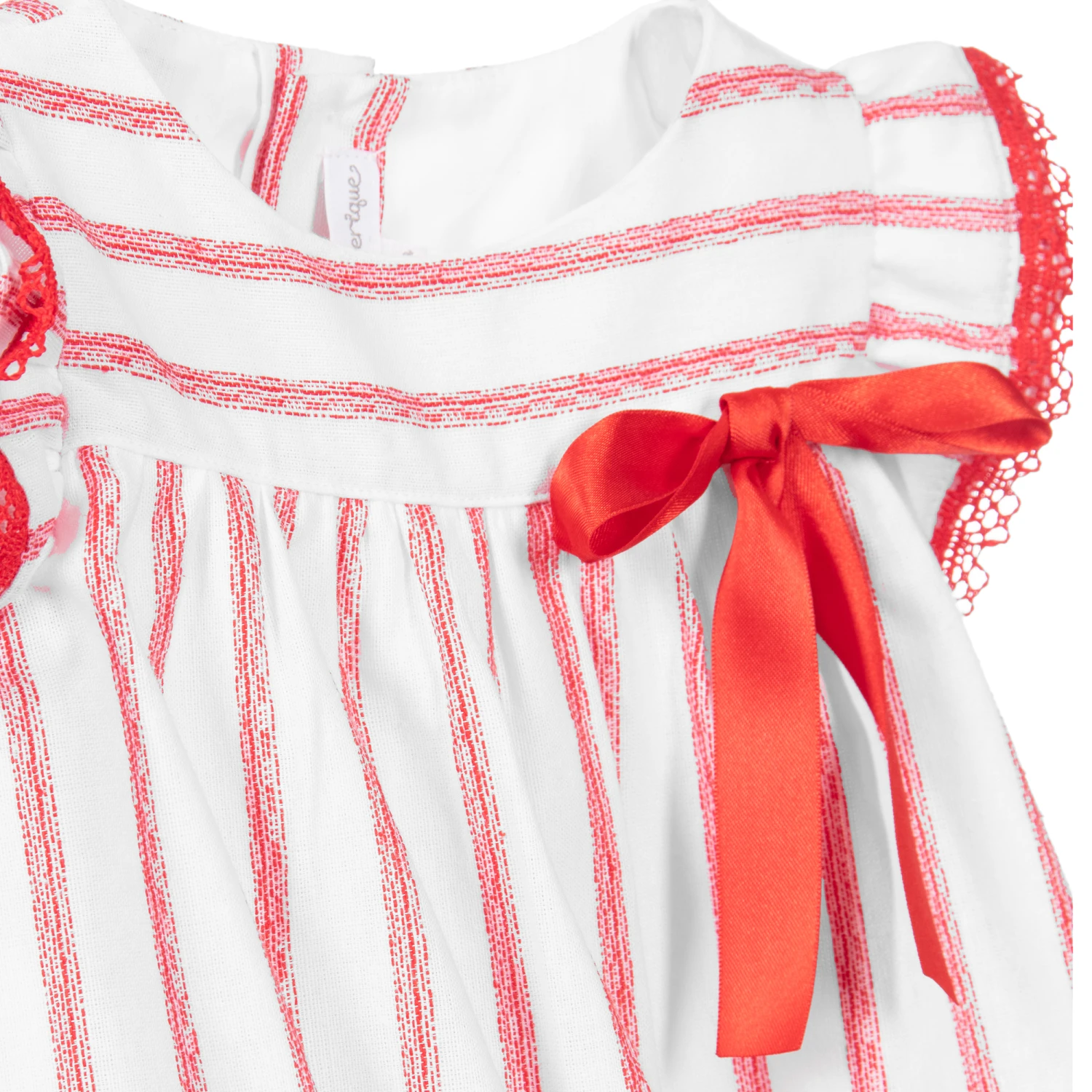 Baby girls white cotton dress with red stripes by Fina Ejerique. Soft, mid-weight and fully lined, it has ruffled sleeves trimmed with red lace and a red satin bow on the bodice.