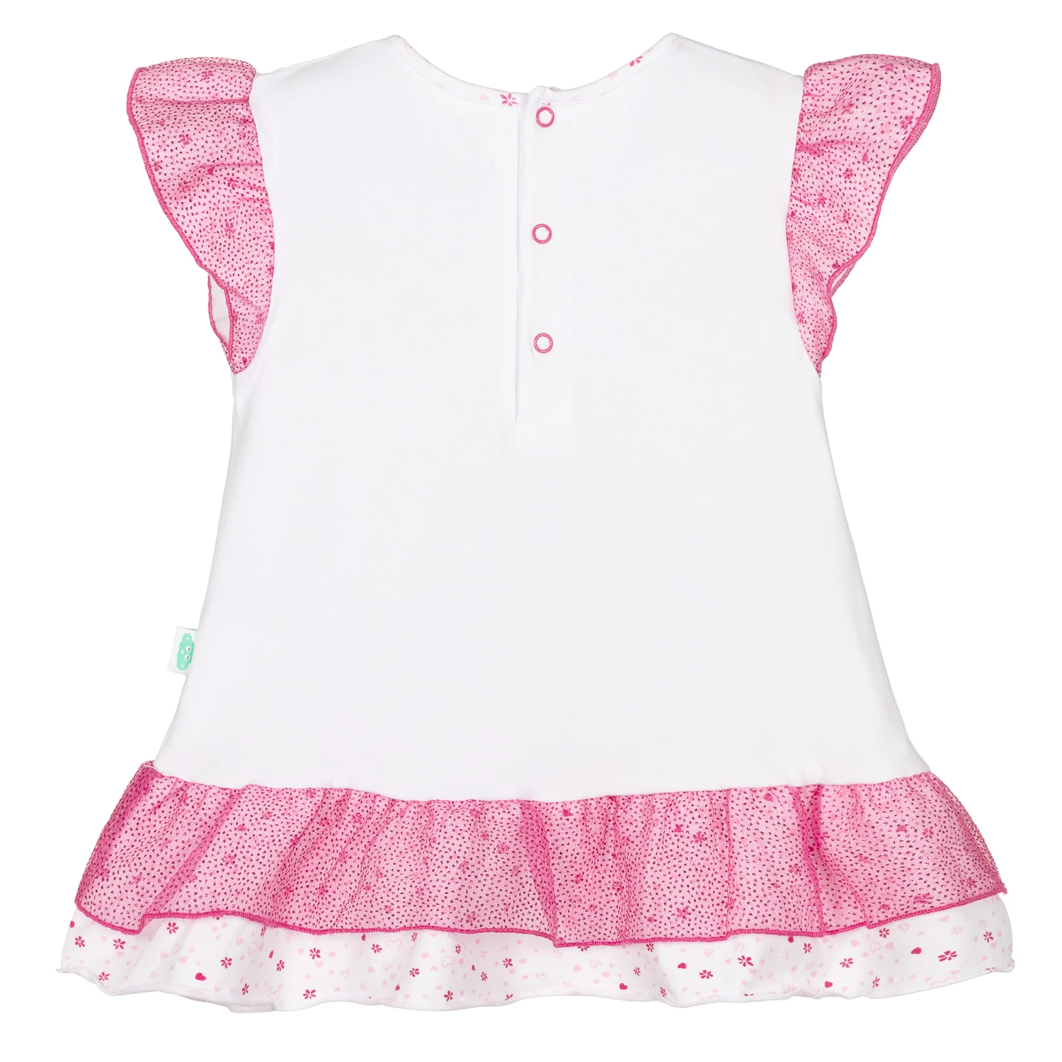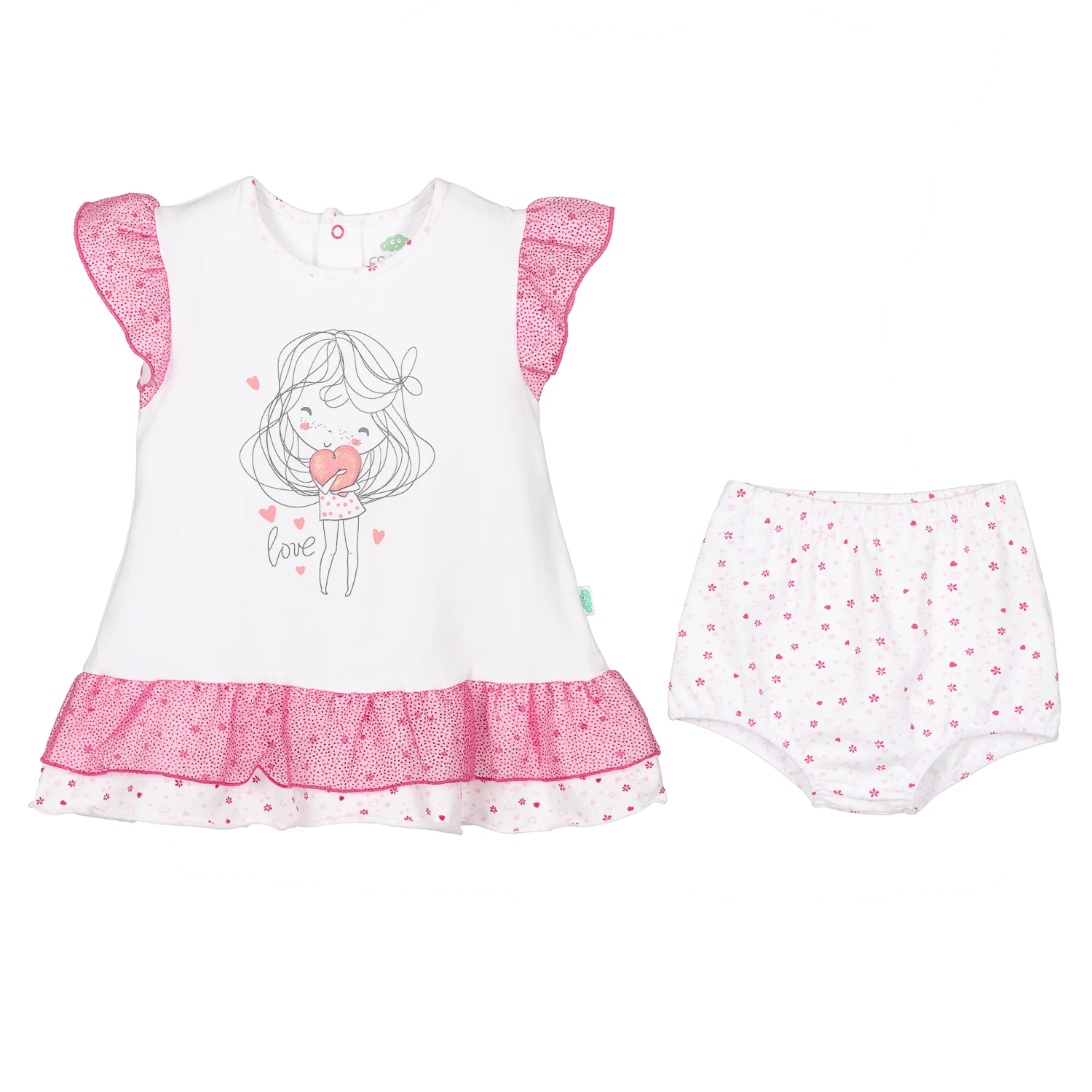 White and pink dress and knickers set for baby girls from FS Baby. Made in soft cotton jersey, the dress has a cute girl motif in pink and grey, with a glittery heart and the word ‘love’. The flutter sleeves and frilled hem have a pink hearts and flowers pattern, and a pink chiffon overlay with glittery pink dots. The matching knickers are gently elasticated.