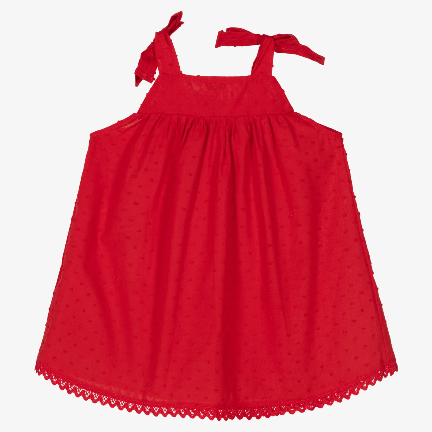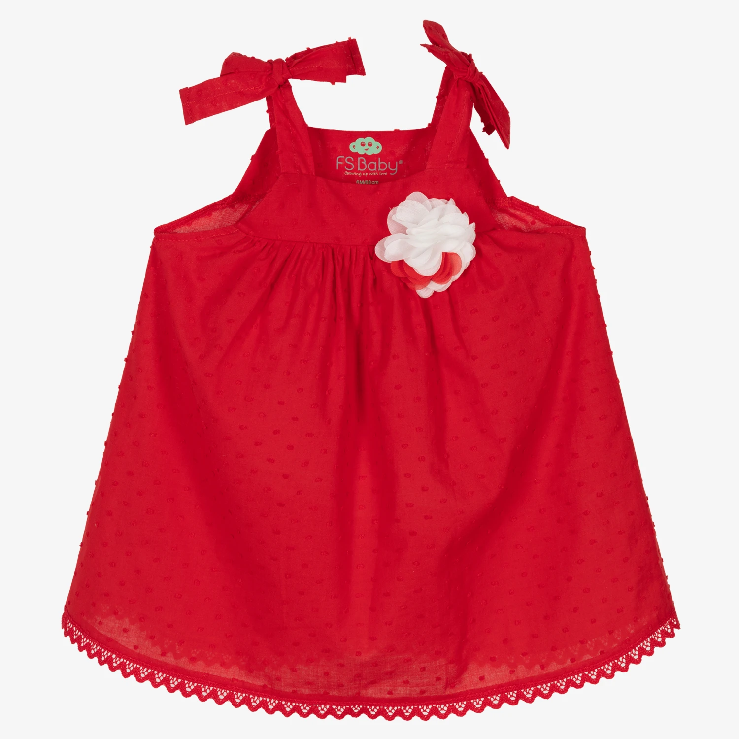 Lovely red sundress for baby girls from FS Baby, made in soft and lightweight cotton. There is a gorgeous white and red 3D floral appliqué on the chest and a pretty lace trim on the hem. The tie-fastening shoulder straps ensure a comfortable fit.
