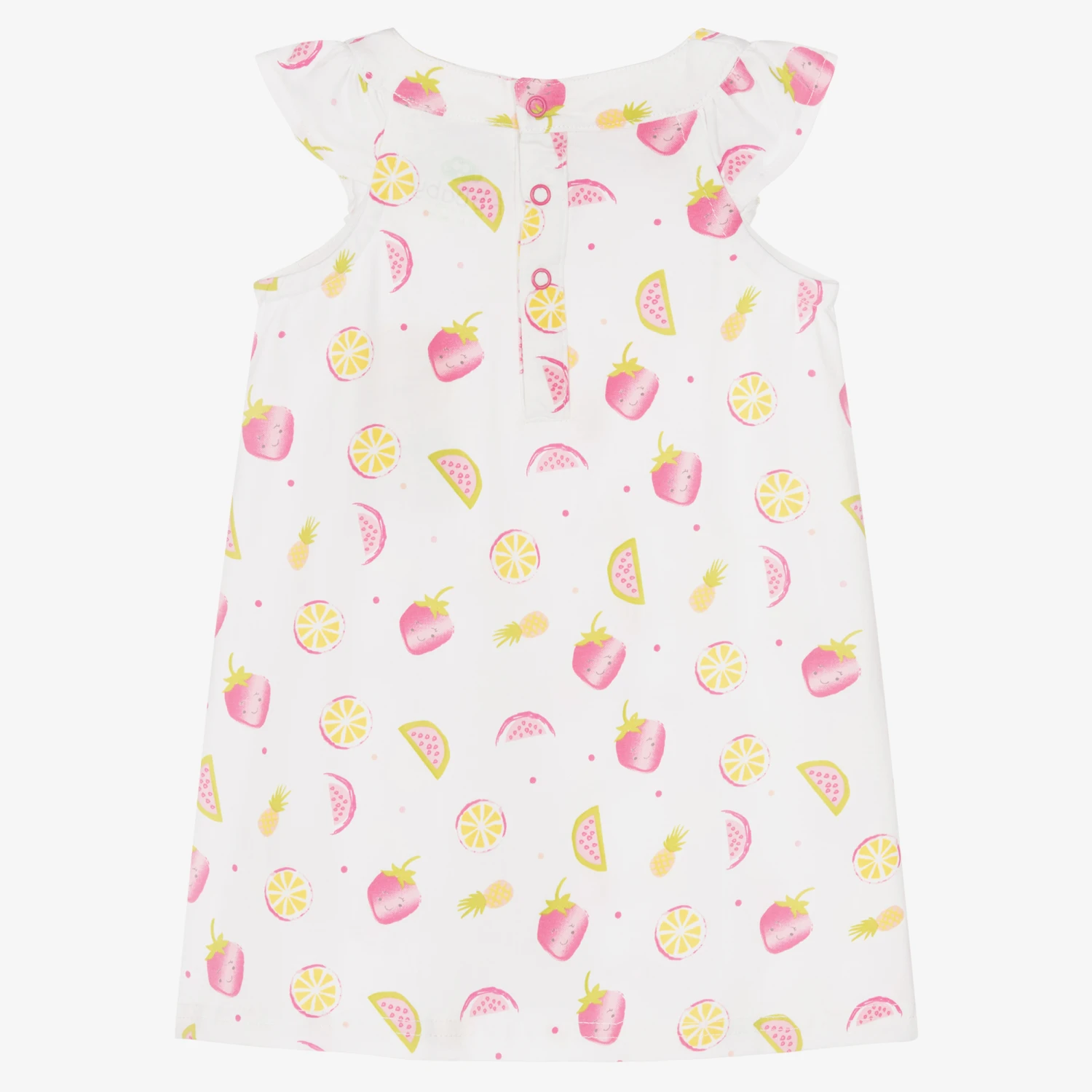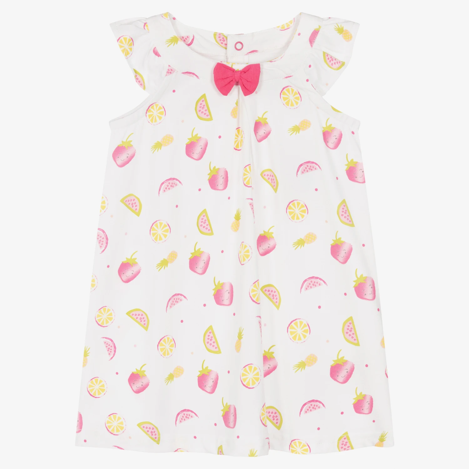 So lovely for baby girls, a white jersey dress from FS Baby, made with organic cotton. Soft and comfortable, it has a pink, yellow and green fruit print with cute character strawberries. There are pretty ruffles over the shoulders and a pink bow appliqué on the front. Popper fastenings on the back assist with dressing and the dress has a gentle A-line shape.