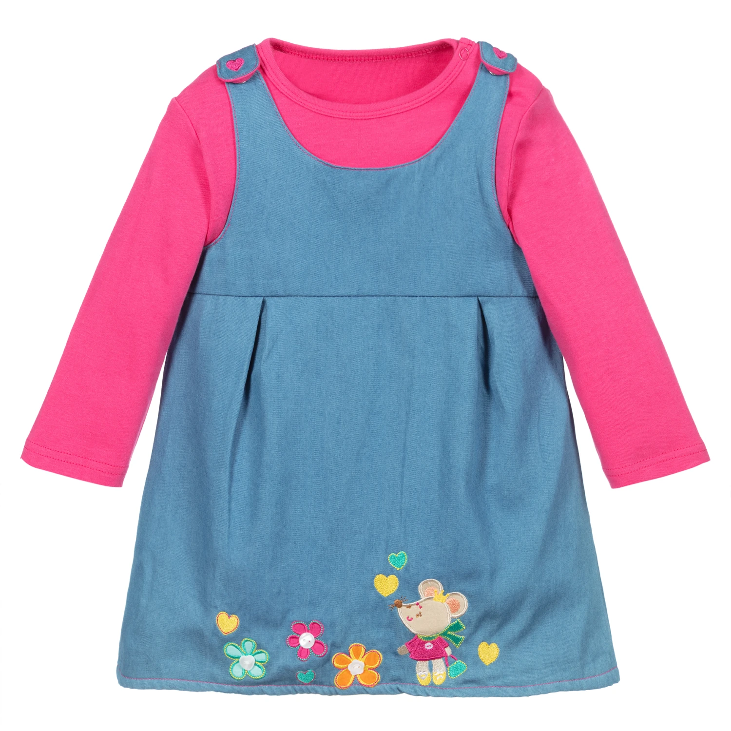 A sweet two piece dress set for baby girls by FS Baby, with adorable mouse appliqué. The fuchsia pink top is made from soft cotton jersey, with popper fastenings on one shoulder. The blue pinafore dress in made in soft cotton twill, with a comfortable jersey lining. There are popper fastenings on the shoulders, with embroidered pink hearts.