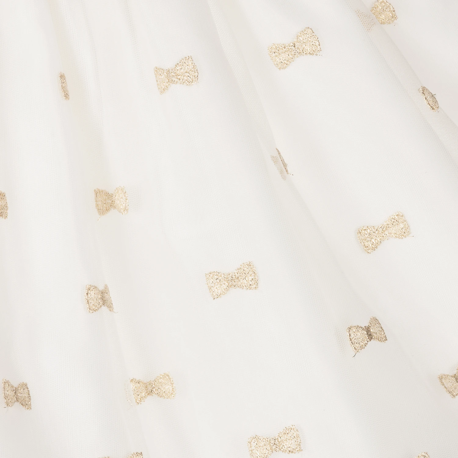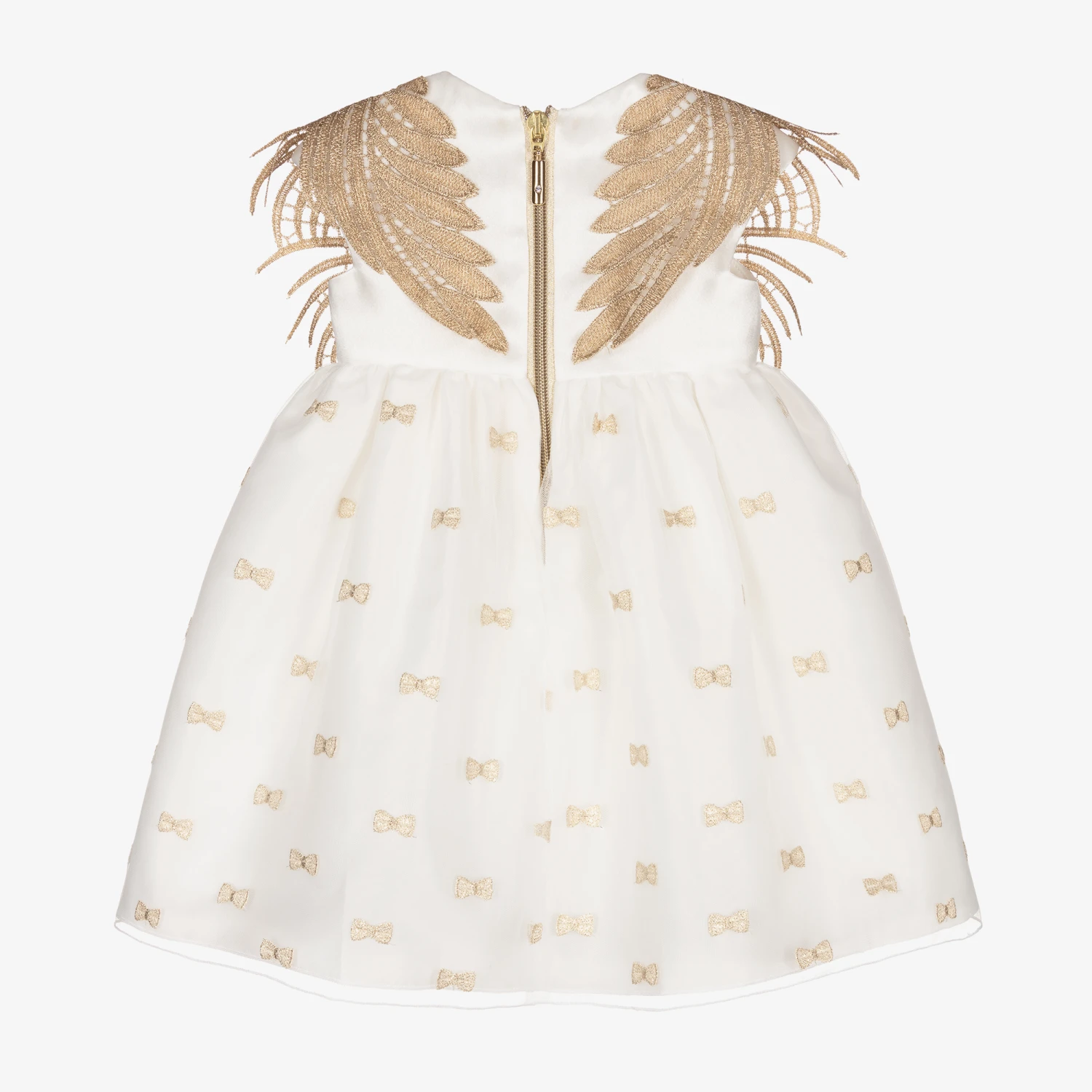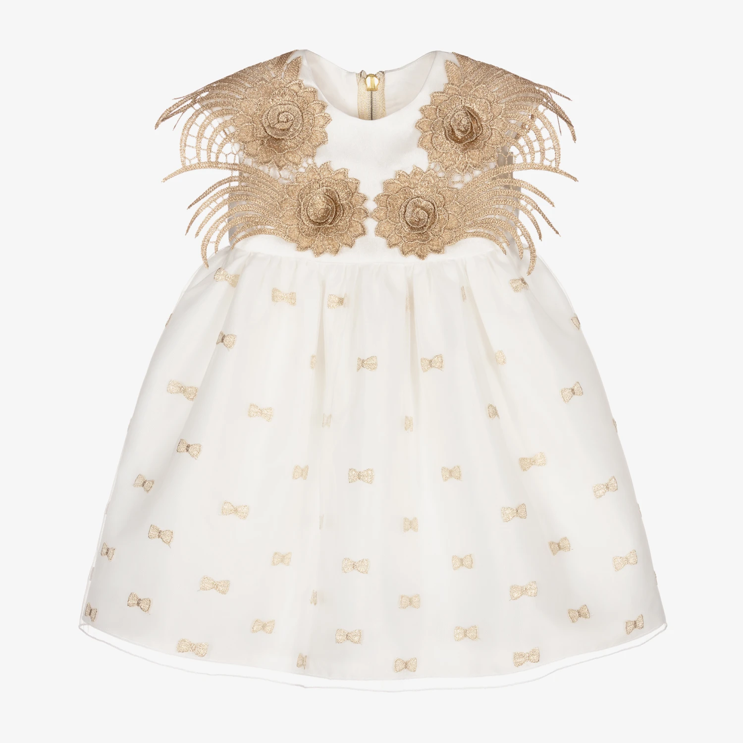 Ivory special occasion dress for baby girls by Graci, with eye-catching embroidered gold floral ‘wings’ on the shoulders. The bodice is made in sheer organza and the sleeves and skirt are made in soft fine tulle with a sparkly gold bow pattern. There is a soft satin underlayer and a soft cotton voile lining for comfort. The dress fastens with a visible gold zip on the back.