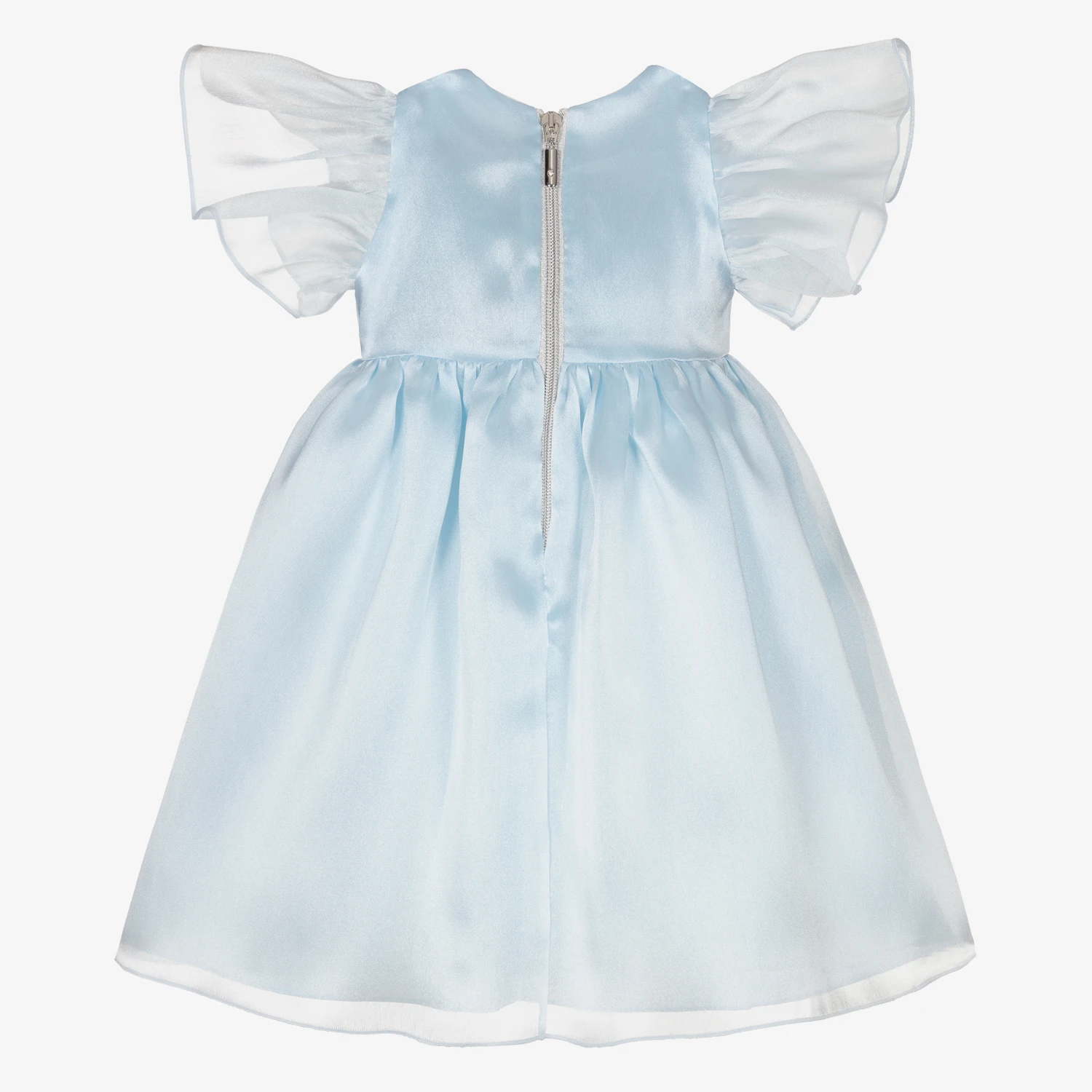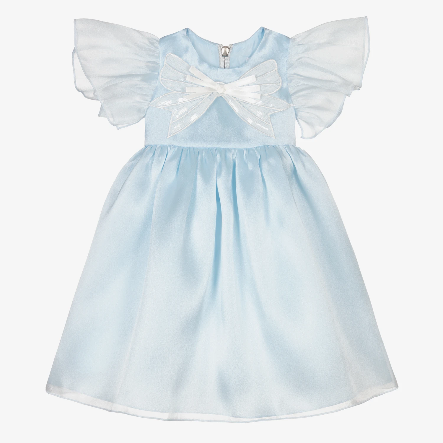 Baby girls blue organza special occasion dress by Graci, with a pretty white sequin and ribbon bow. Soft and lightweight, this elegant dress has beautiful sheer fluted sleeves and a cool cotton lining. There are layers of net underneath for added volume and a silver zip fastening on the back, with a delicate diamanté detailed zipper.