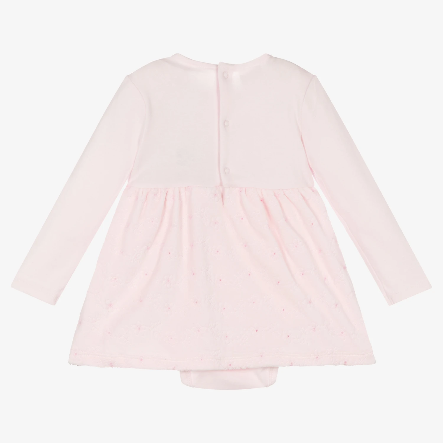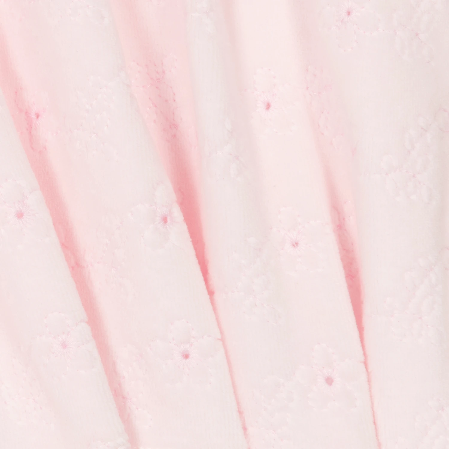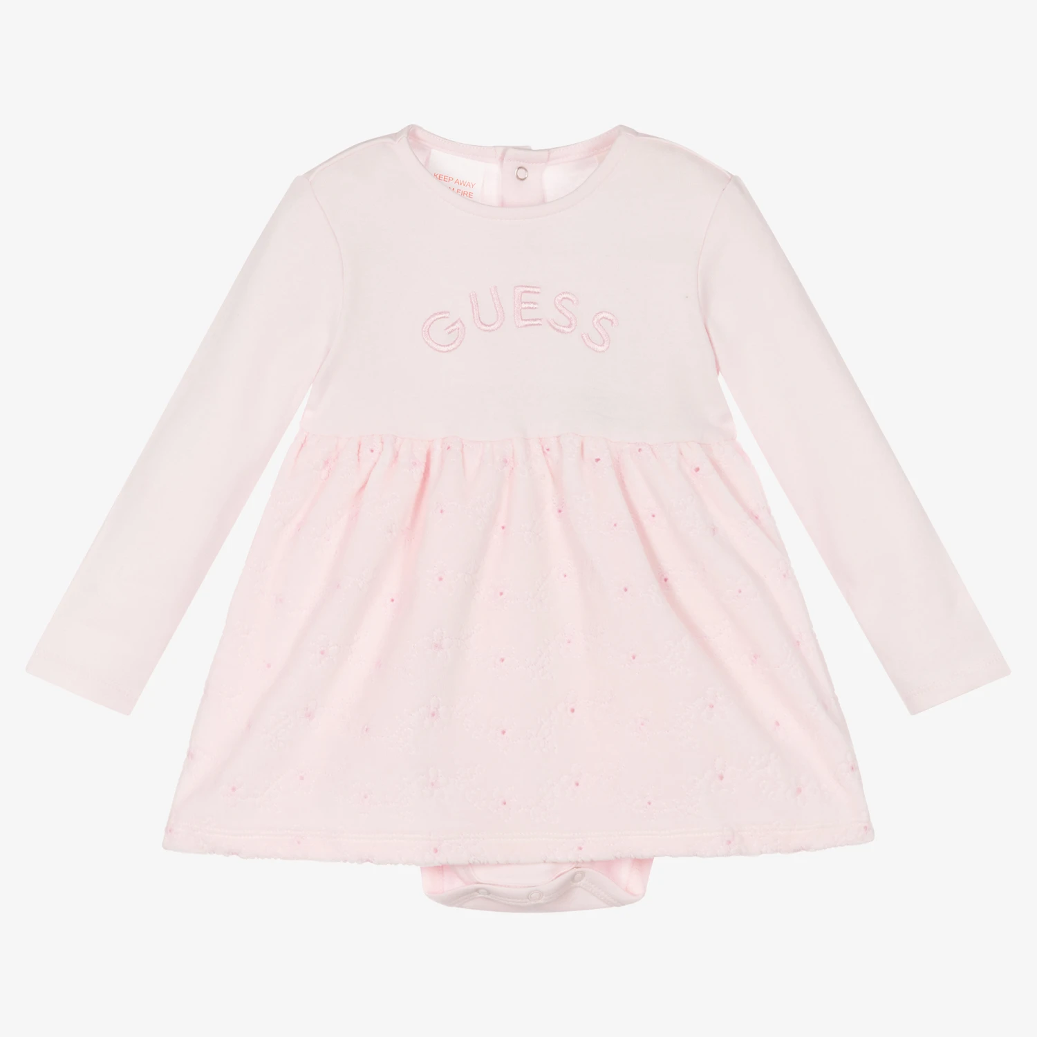 Sweet pale pink dress for baby girls, by Guess. Made in soft cotton jersey, this bodice has a delicate pink logo embroidery and the velour skirt has a pretty floral embroidery with cut-out details. The internal bodysuit fastens with poppers on the back and between the legs for easy dressing. It comes with a colourful branded box, making a great gift for a special baby girl.