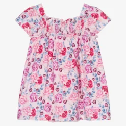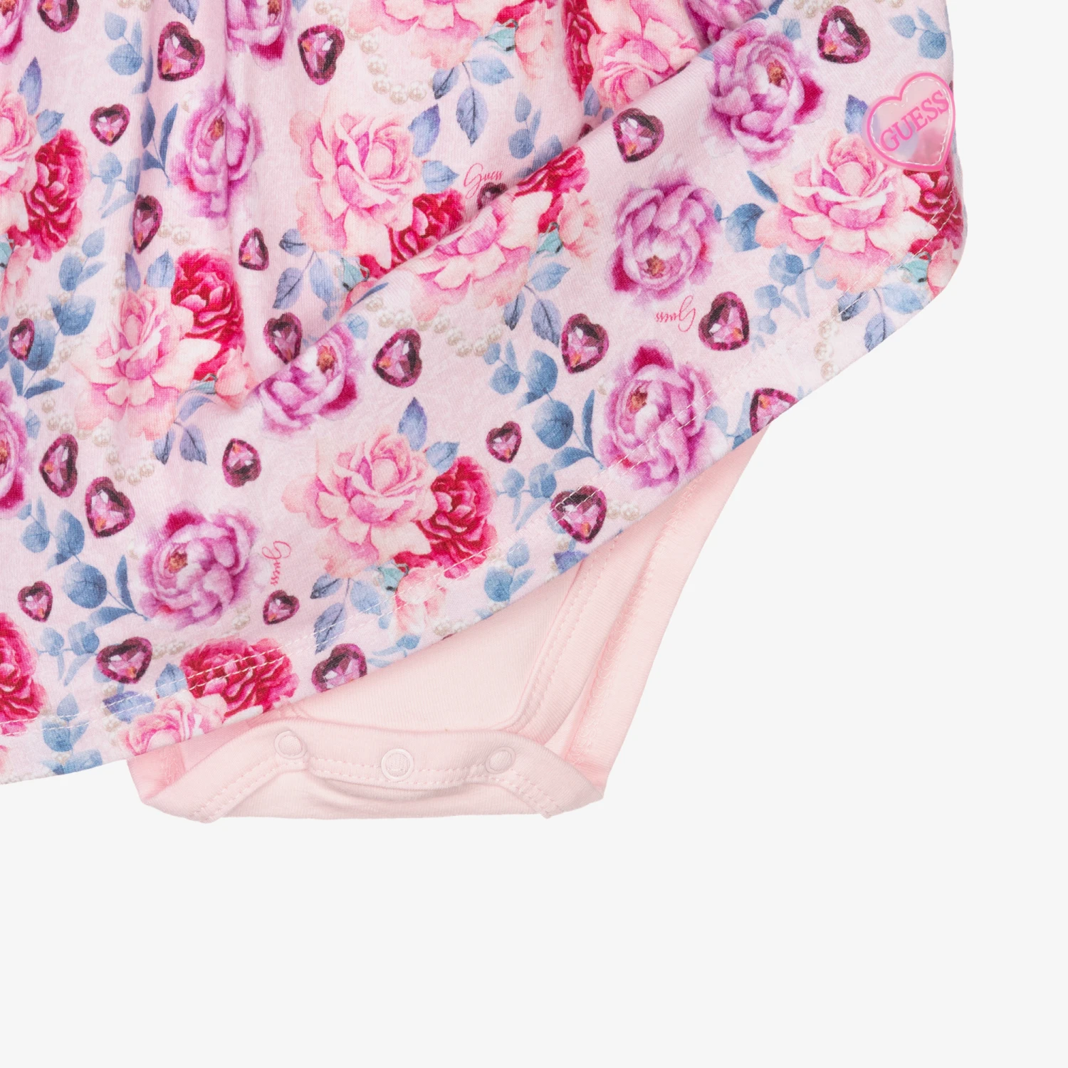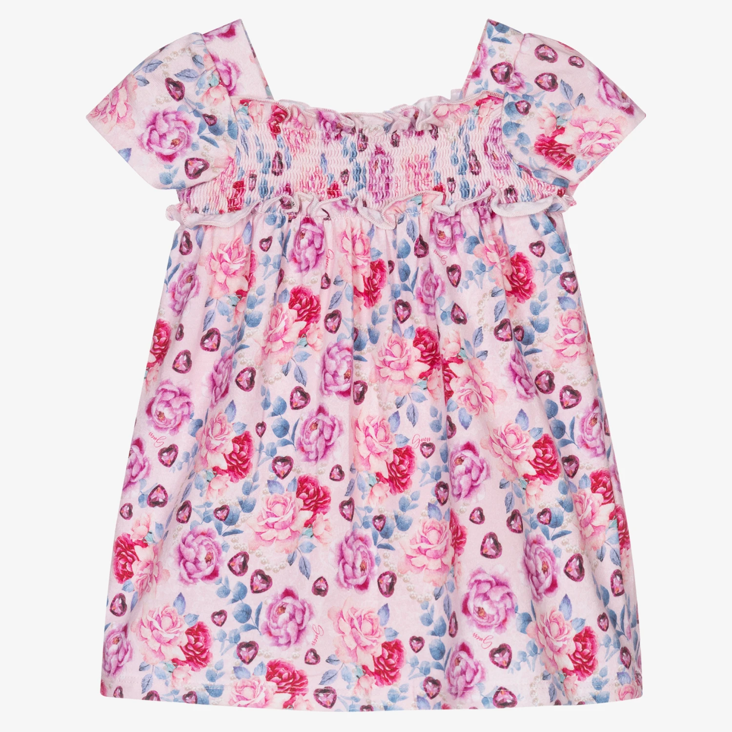 Baby girls pink floral dress and attached bodyvest from Guess, made in soft organic cotton jersey. It has a ruched bodice and back, with sweet ruffle trims. There are popper fastenings between the legs and pretty capped sleeves.
