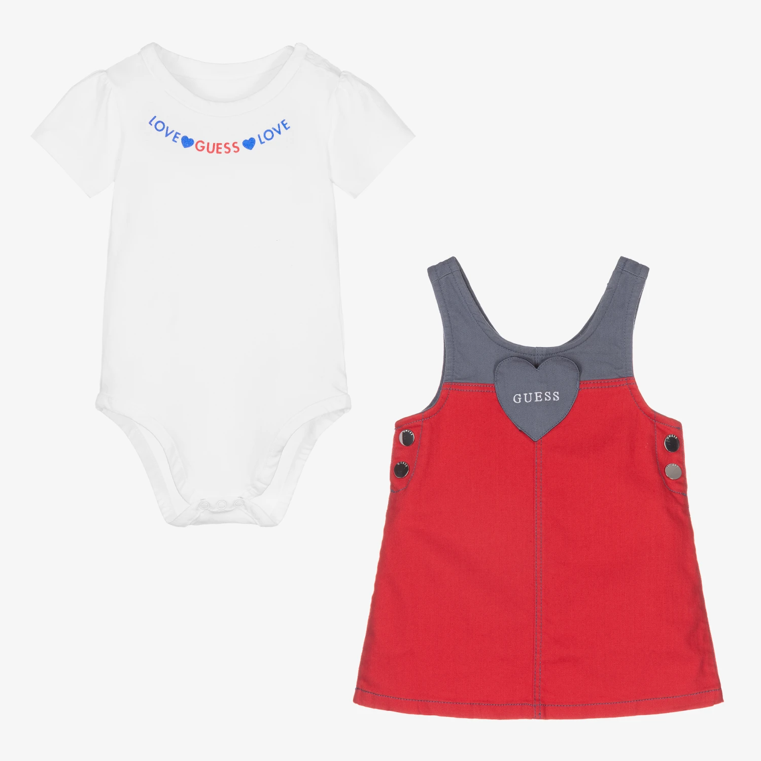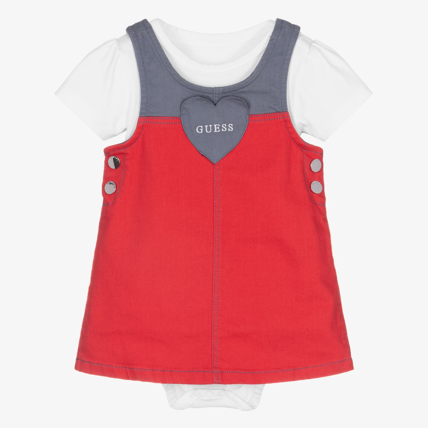 Cute white and red dress set for baby girls, by Guess. Made in soft and stretchy cotton denim, the dress has a pretty heart on the front with white embroidered logo on the front, and popper fastenings on the sides. The back of the dress has two little pockets with the iconic Triangle logo. It also comes with a white bodyvest with puffed sleeves, and a blue and red logo print on the front.