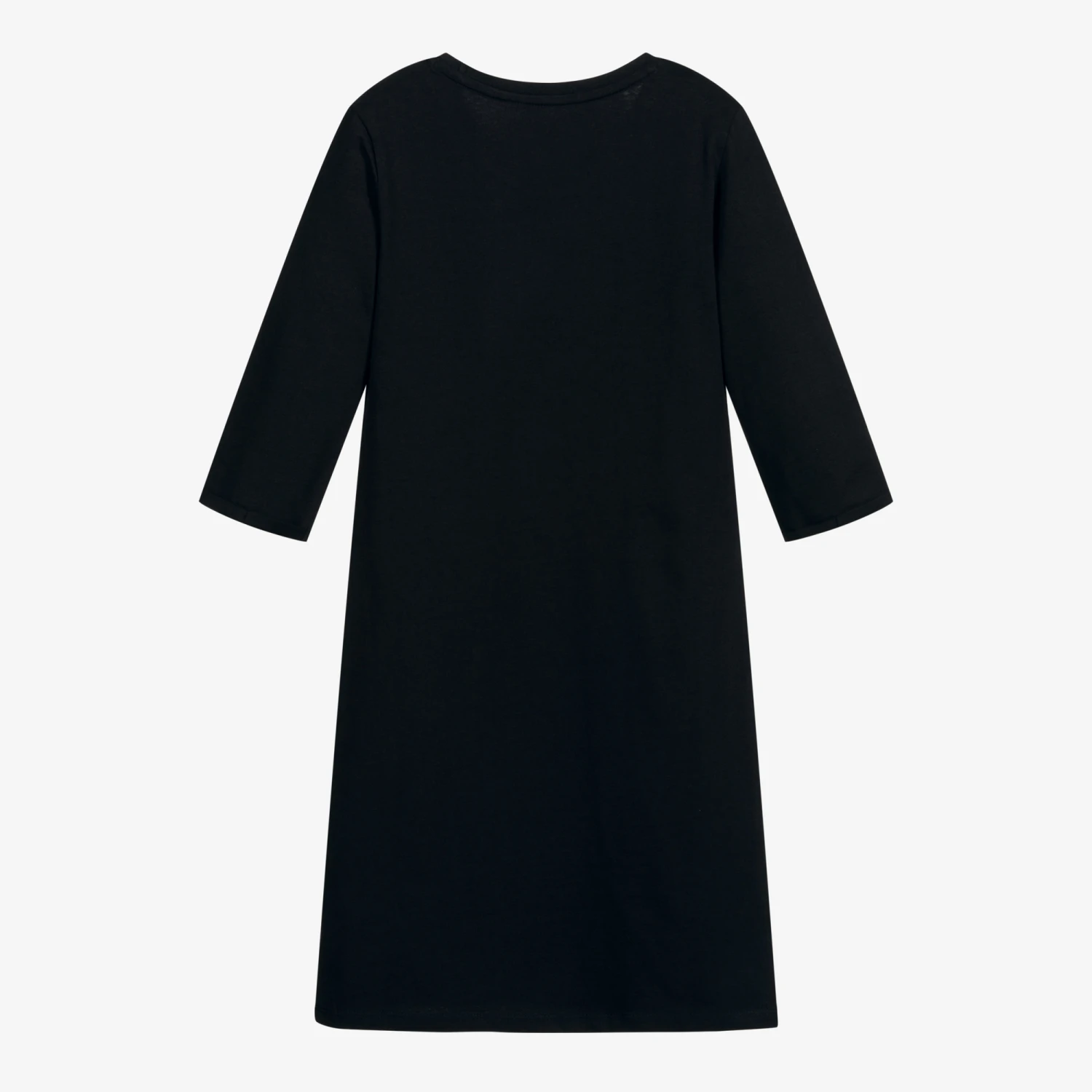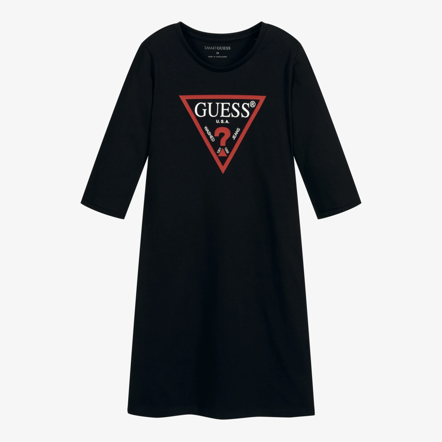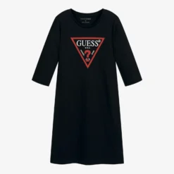 Easy-wearing black organic cotton jersey dress for teen girls by Guess. In a classic cut, it has the brand’s unmistakeable large Triangle logo print on the front.
