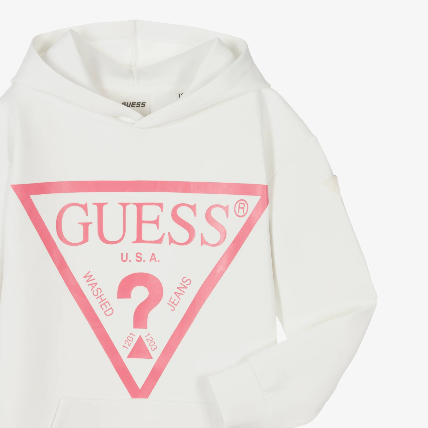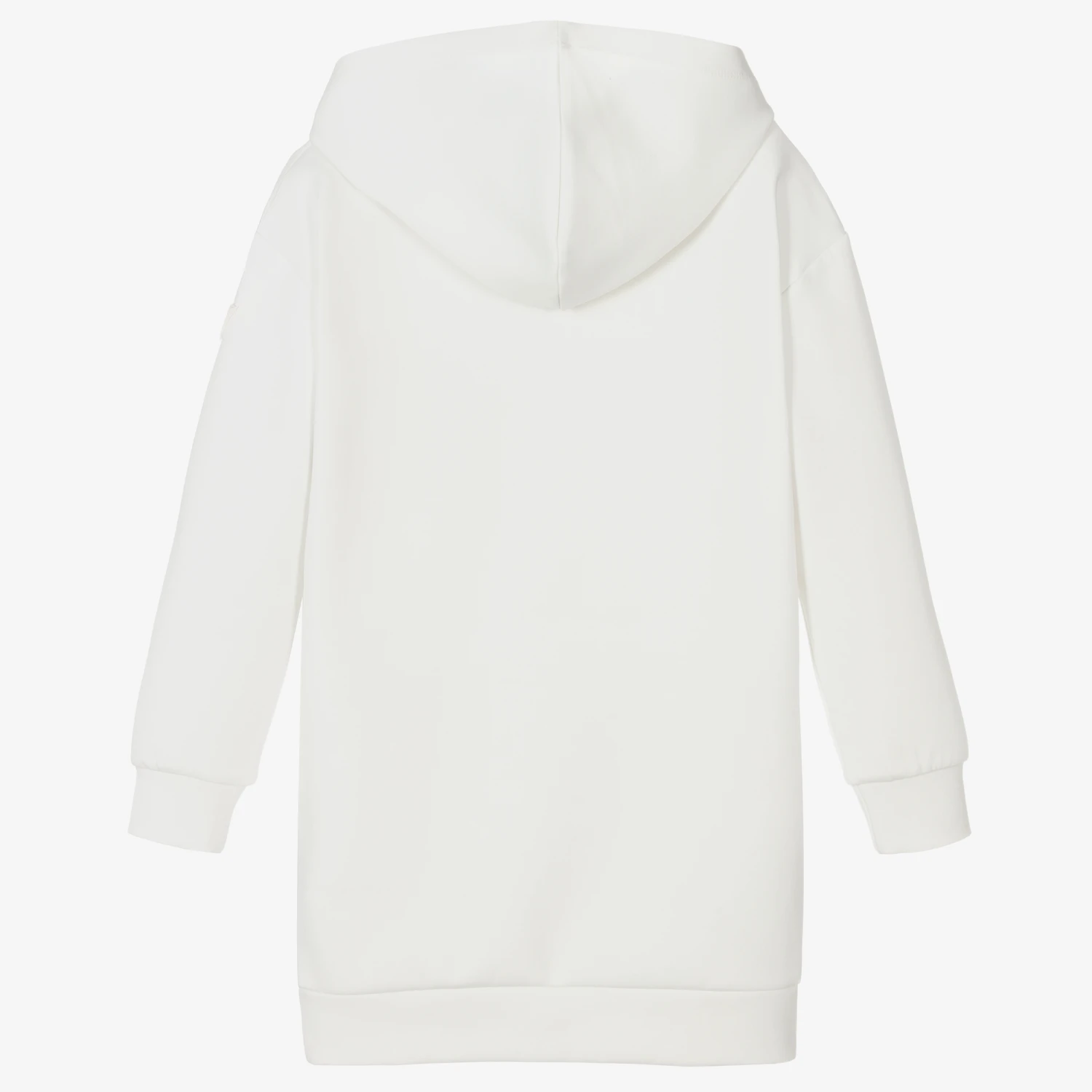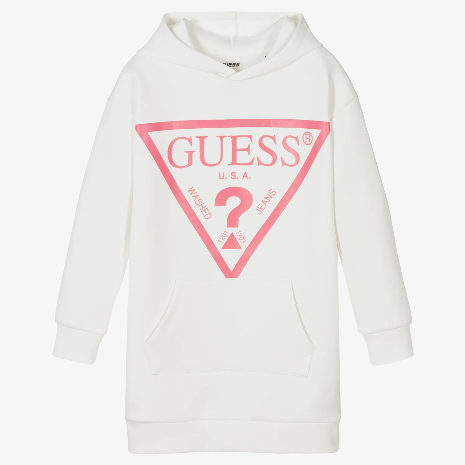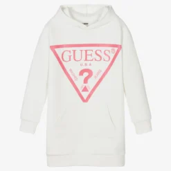 Casual ivory hoodie dress for teen girls by Guess, made in mid-weight scuba jersey. It has a useful front pouch pocket and the brand’s pink Triangle logo print on the front, with a silicone logo on one sleeve. This garment contains organic cotton fibres.