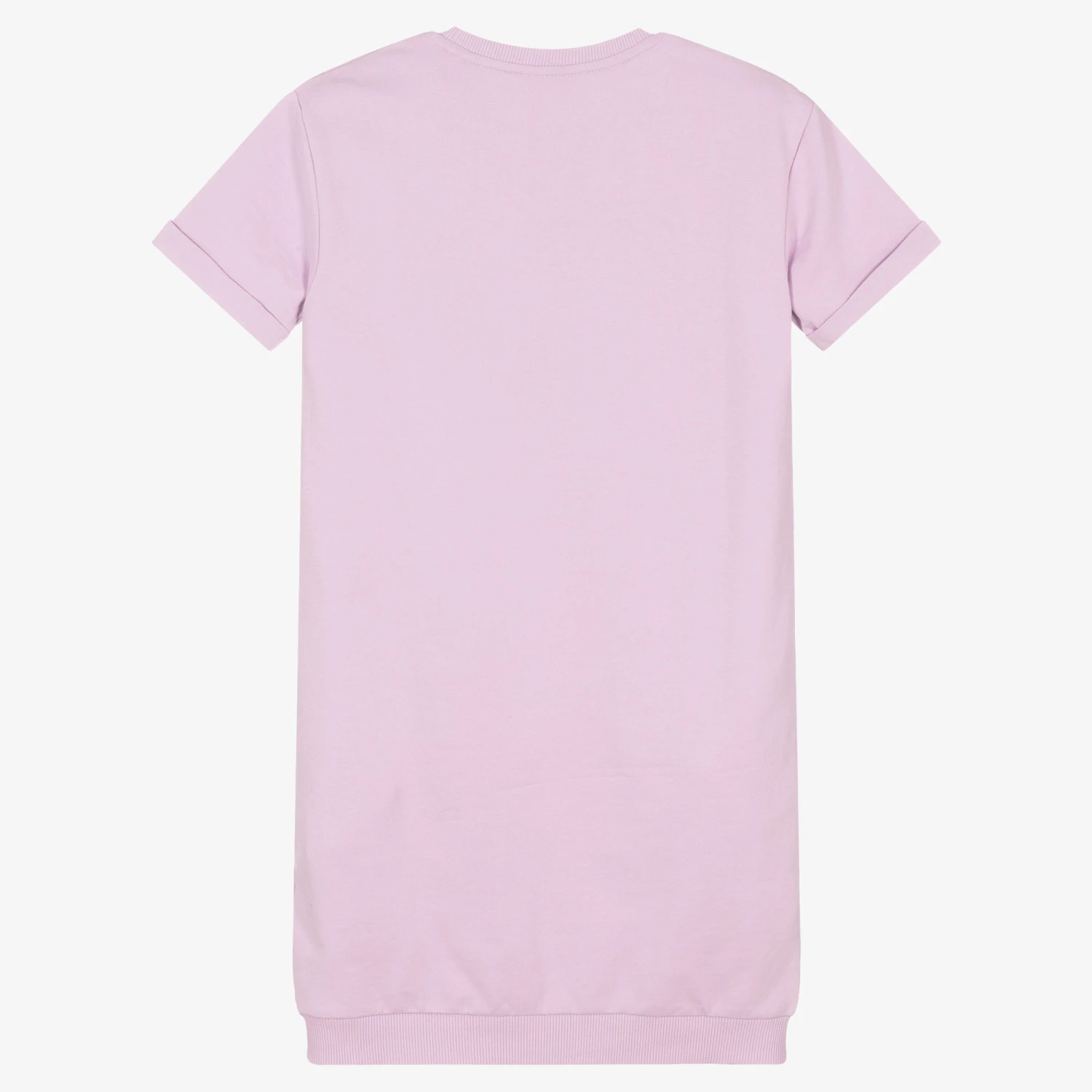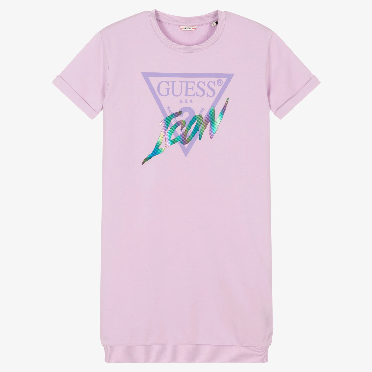 Teen girls lilac purple cotton dress by Guess, printed with the designer’s signature purple Triangle logo. For an edgy look, it has iridescent ‘Icon’ slogan stamped on the front for a seasonal twist. Easy-to-wear, it has a casual crew neckline and turned-up cuffs. This item contains organic cotton fibres.