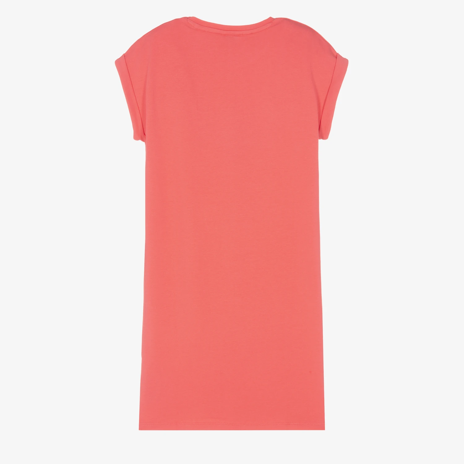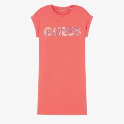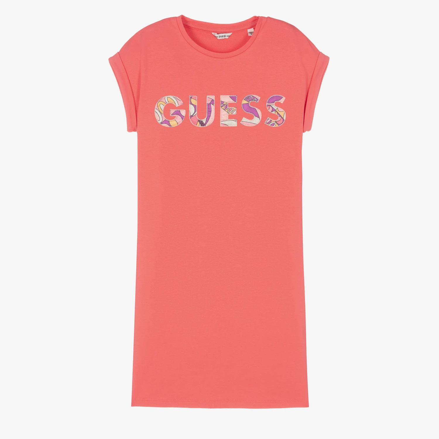 From American brand Guess, a comfortable coral pink T-shirt dress for teen girls. Casual and stylish, it has the designer’s logo across the chest in patterned letter appliqués. It is made in soft cotton jersey and has seamless capped sleeves with turn-up cuffs.