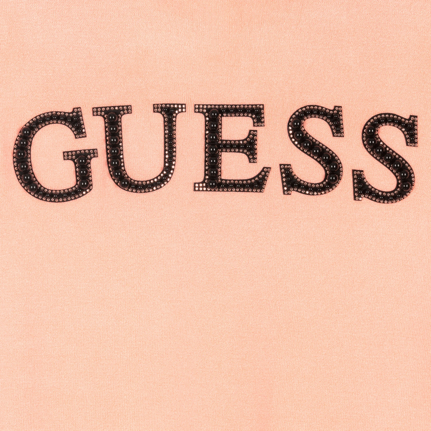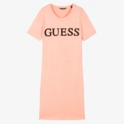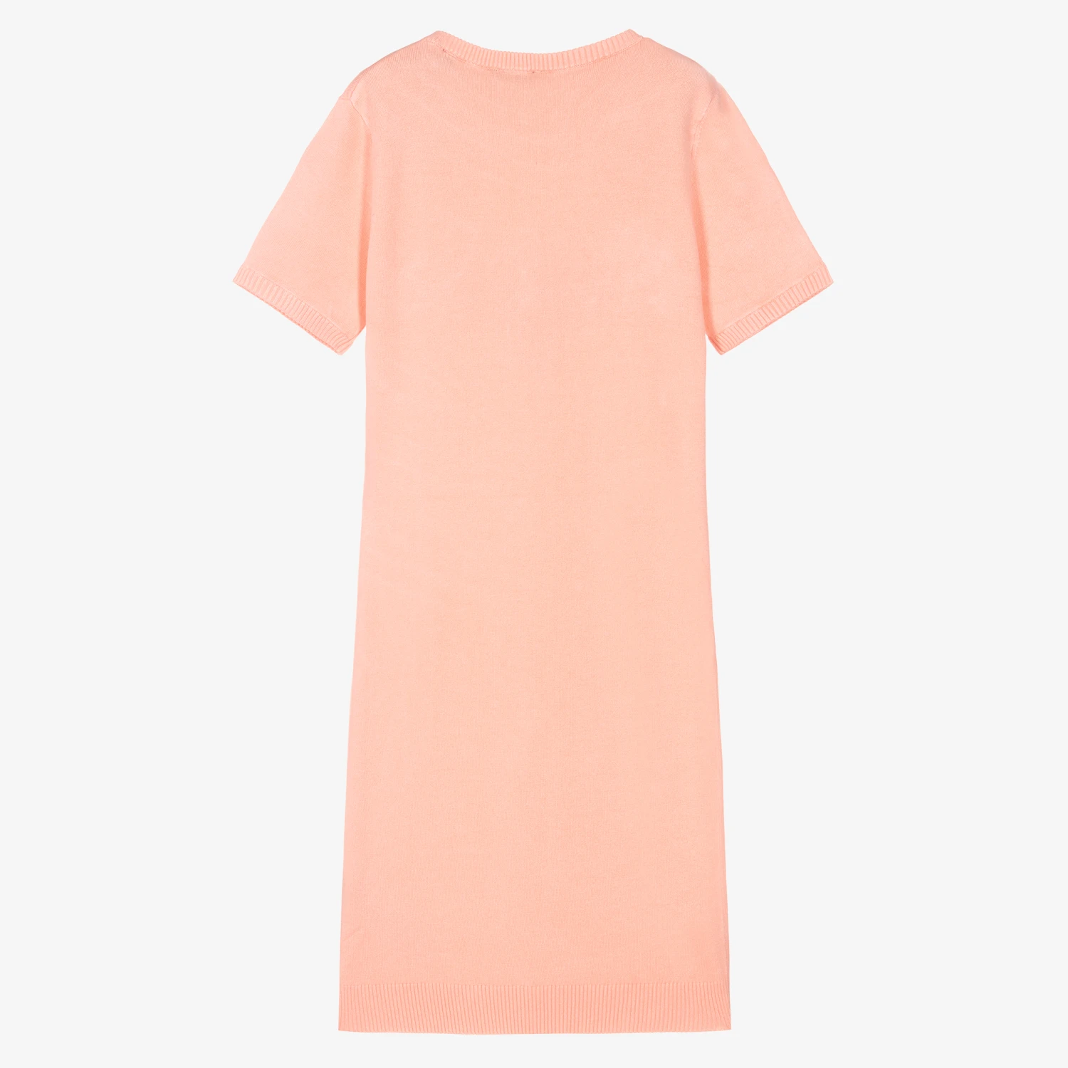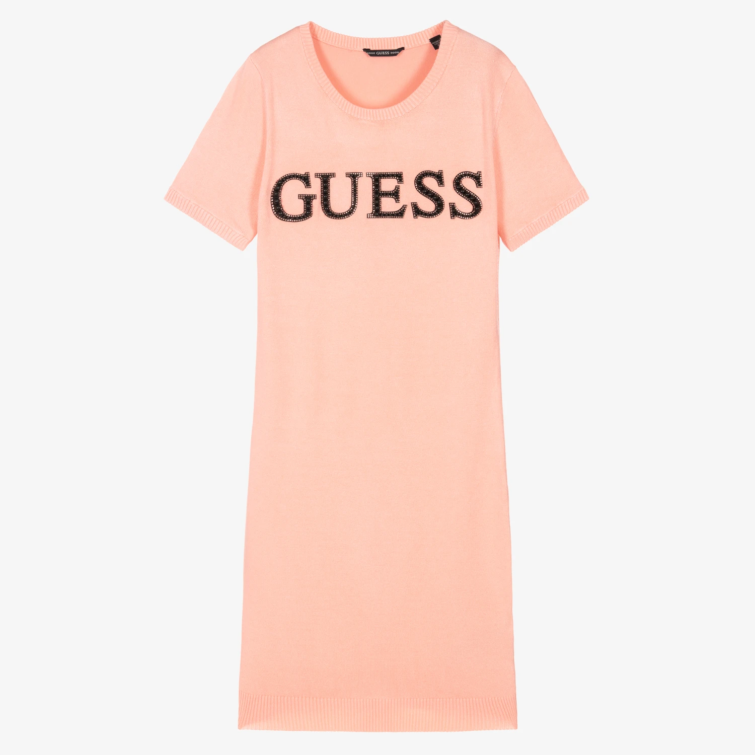 Soft knitted sweater dress for teen girls by Guess in a warm shade of pink. This stretchy design has a warm feel and a close fit. The front is embroidered with a hand-beaded logo in black and gold. This dress is made with Lenzing EcoVeroâ„¢ viscose, which is derived from sustainable wood sources.