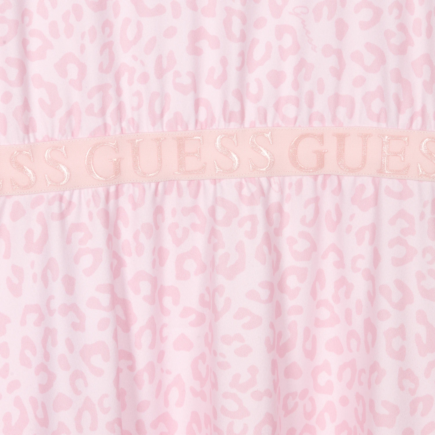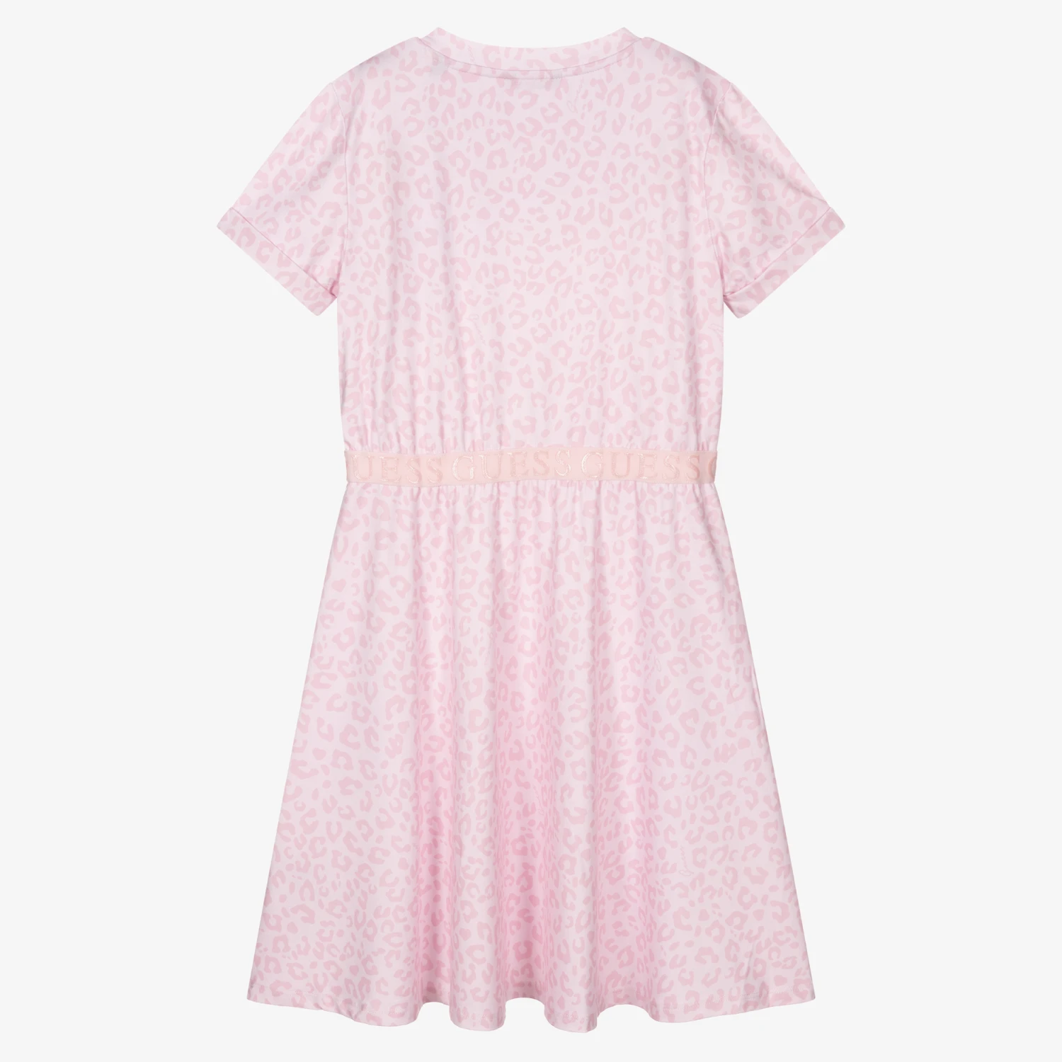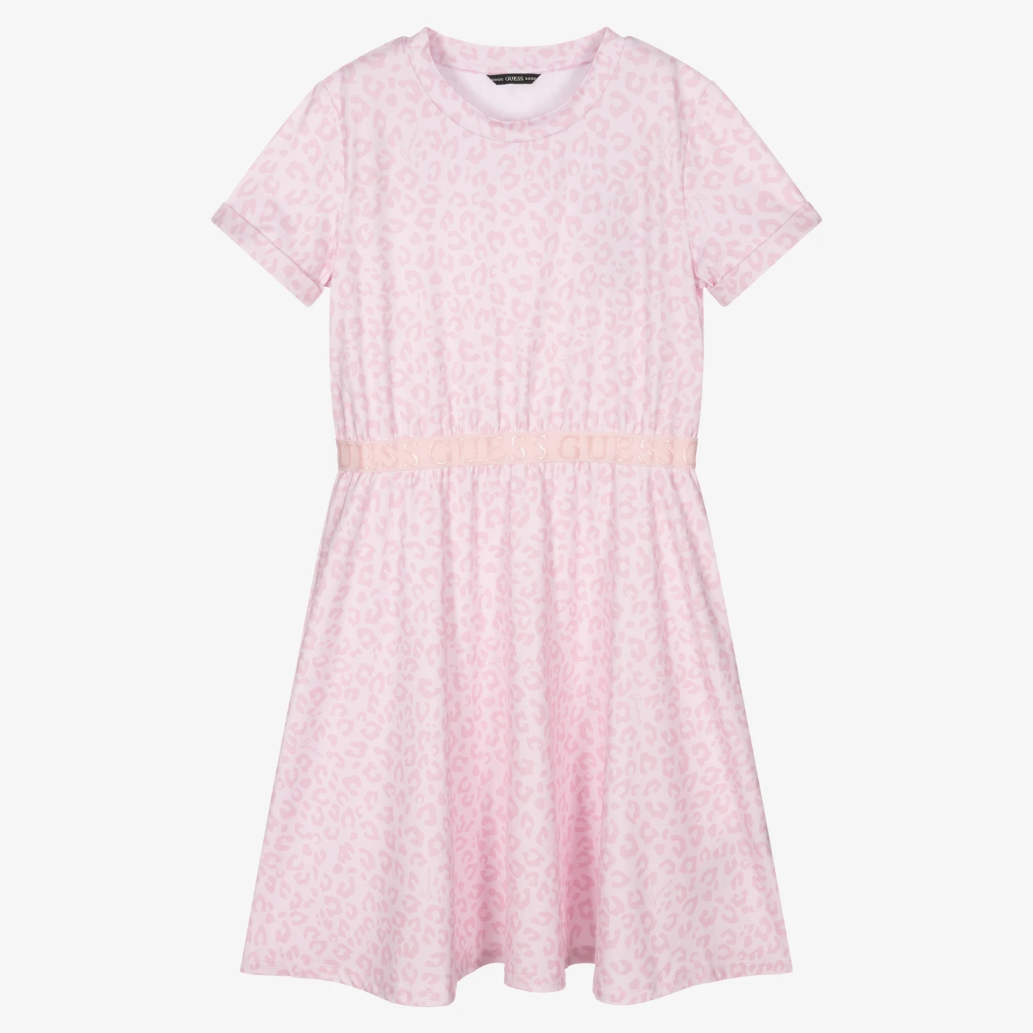 Pale pink leopard print dress for teen girls by American brand Guess, made in soft and comfortable jersey. An ideal casual staple, this relaxed style has a logo embossed waistband and a floaty skirt.