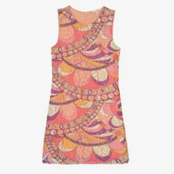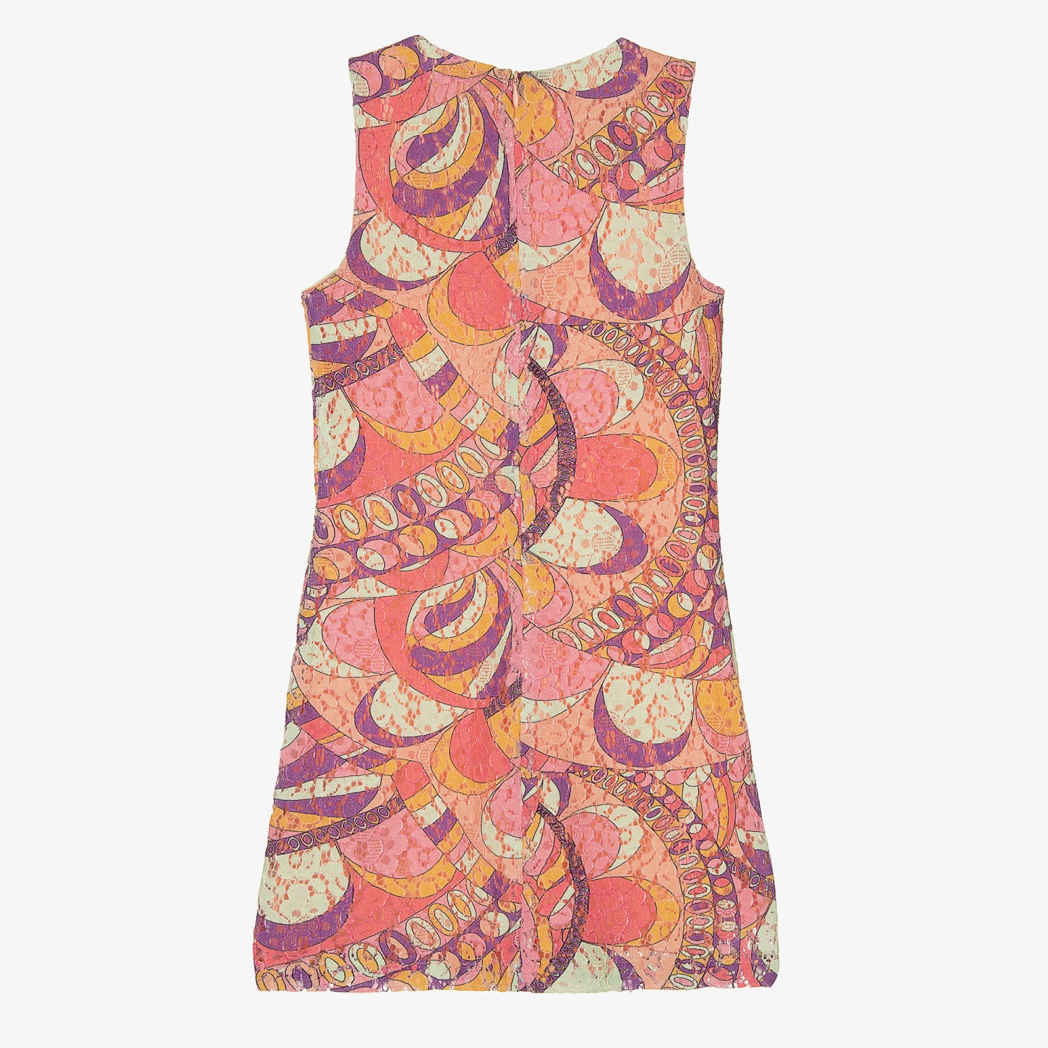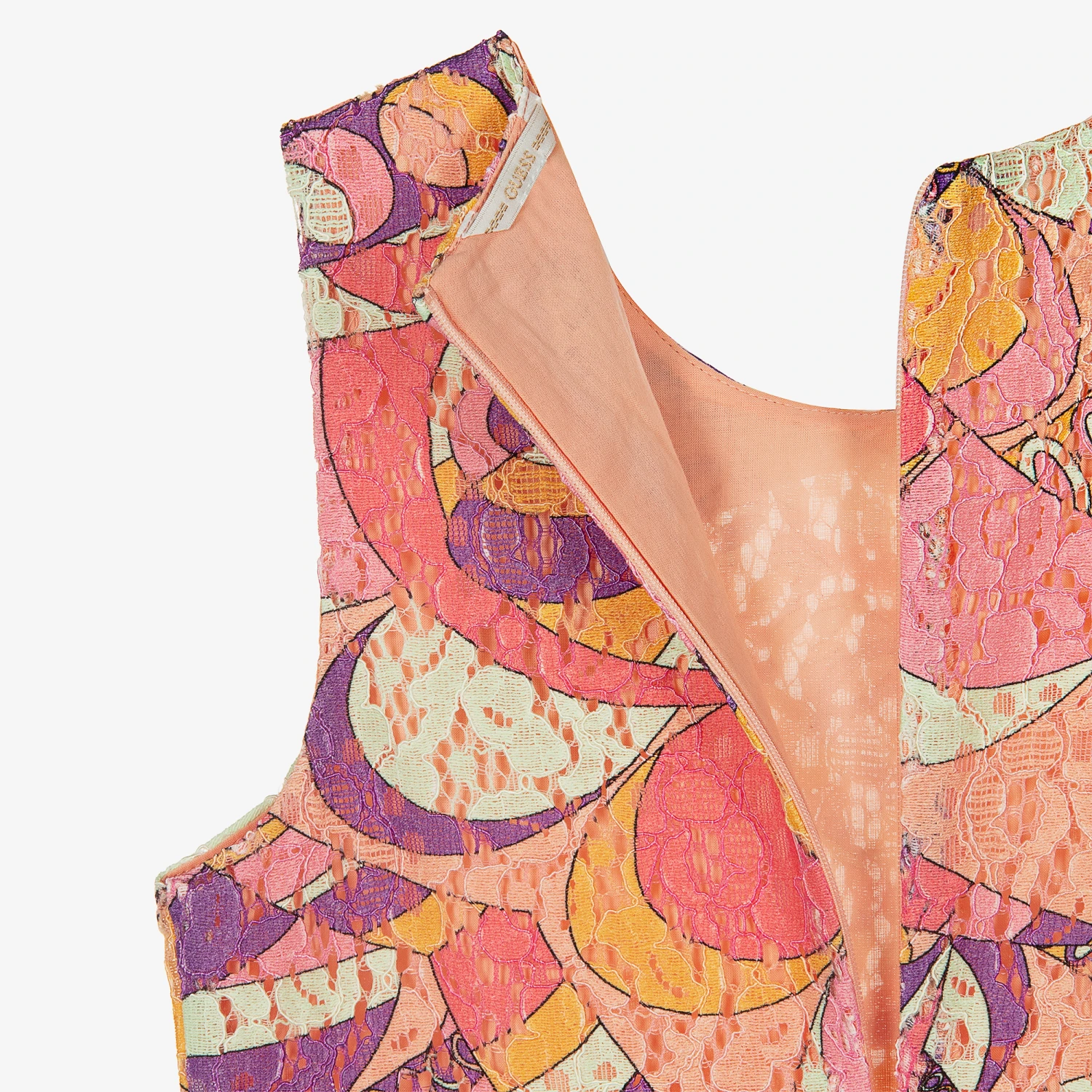 Super stylish lace dress for teen girls by American brand Guess, with an eye-catching, psychedelic pattern in pink, purple and orange. In a simple, sleeveless, shift design, it has a lightweight cotton lining for comfort and fastens neatly with a concealed zip around the back. For a designer touch, the brand’s gold metal logo plate is by the hemline.