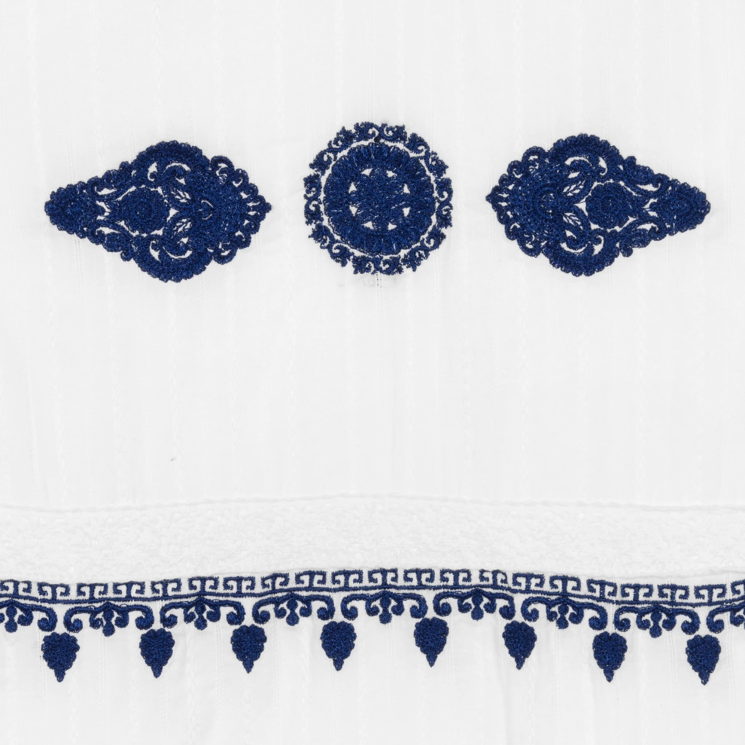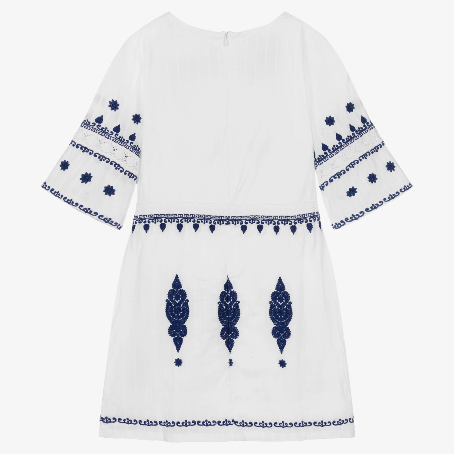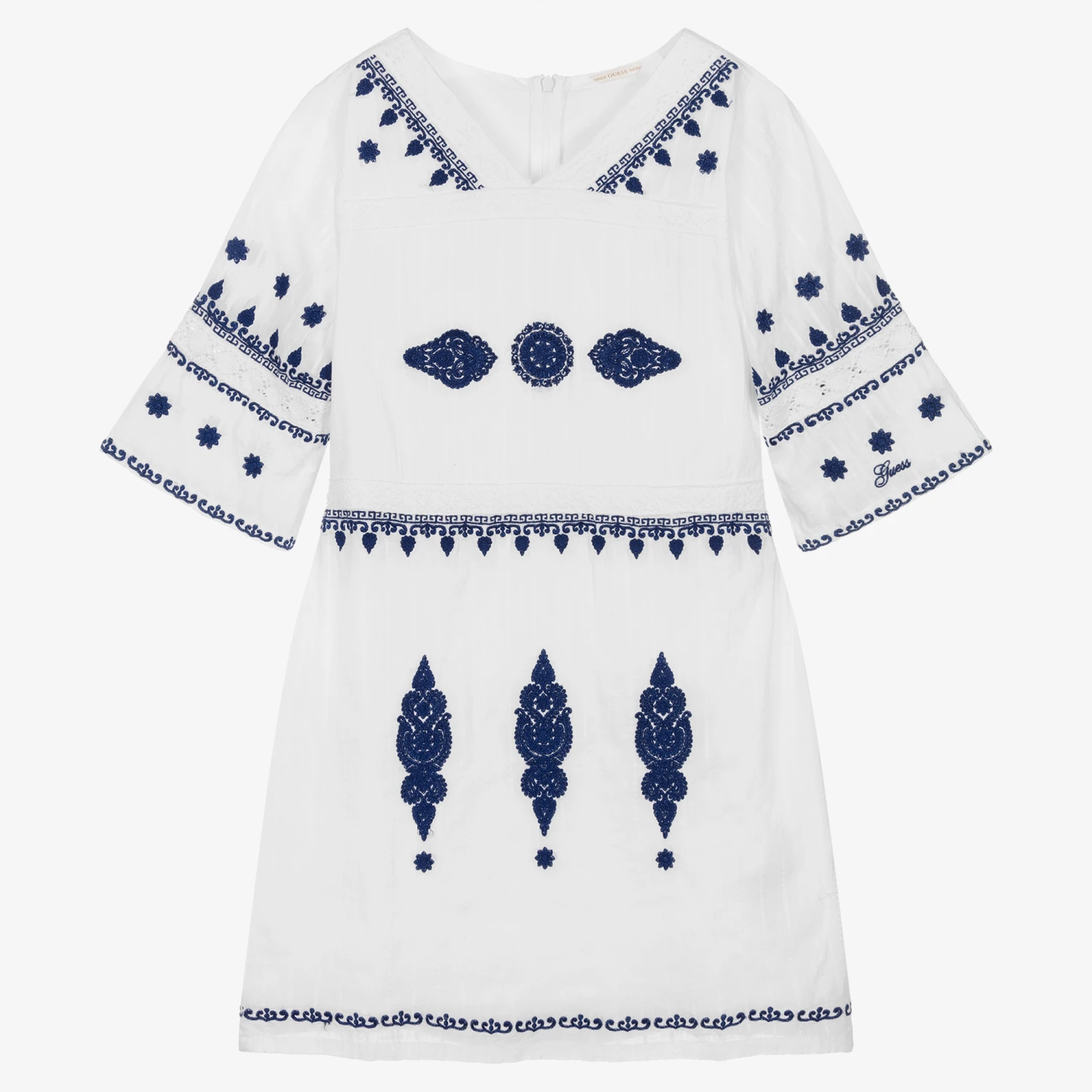 Lovely for teen girls, this white cotton dress from American brand Guess is patterned with beautiful navy blue embroidery. Comfortable and lightweight for warm days, it is made in lightweight dobby cotton with pretty patterned stripes and is fully lined. The dress has wide 3/4 length sleeves and fastens neatly with a concealed zip on the back. Delicate lace trim gives a beautiful finish and the designer’s embroidered logo can be seen on one sleeve.