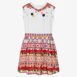 From American brand Guess, white and red dress for teen girls with pretty floral prints and embroidery. The jersey bodice has the brand name embroidered on the chest amongst colourful flowers which coordinate with the eye-catching skirt. The cotton poplin skirt is gathered at the lightly elasticated waist creating volume and a feminine silhouette. A concealed zip fastening on the back makes dressing fuss-free.