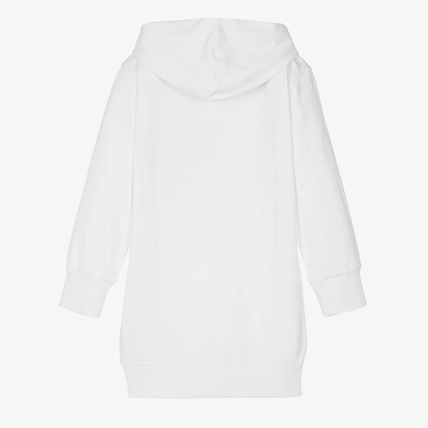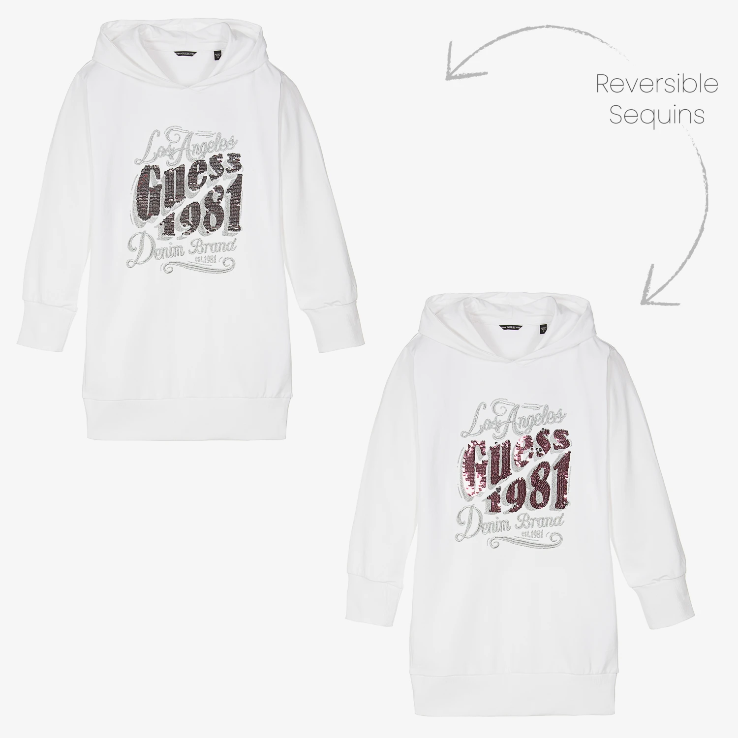 Teen girls casual white cotton hoodie dress by Guess, with a noughties inspired reversible sequin logo on the front, sparkling in pink and silver. This cool design is made in stretchy, medium-weight jersey, and simply slips on over the head, with softly ribbed trims to add a little extra comfort.