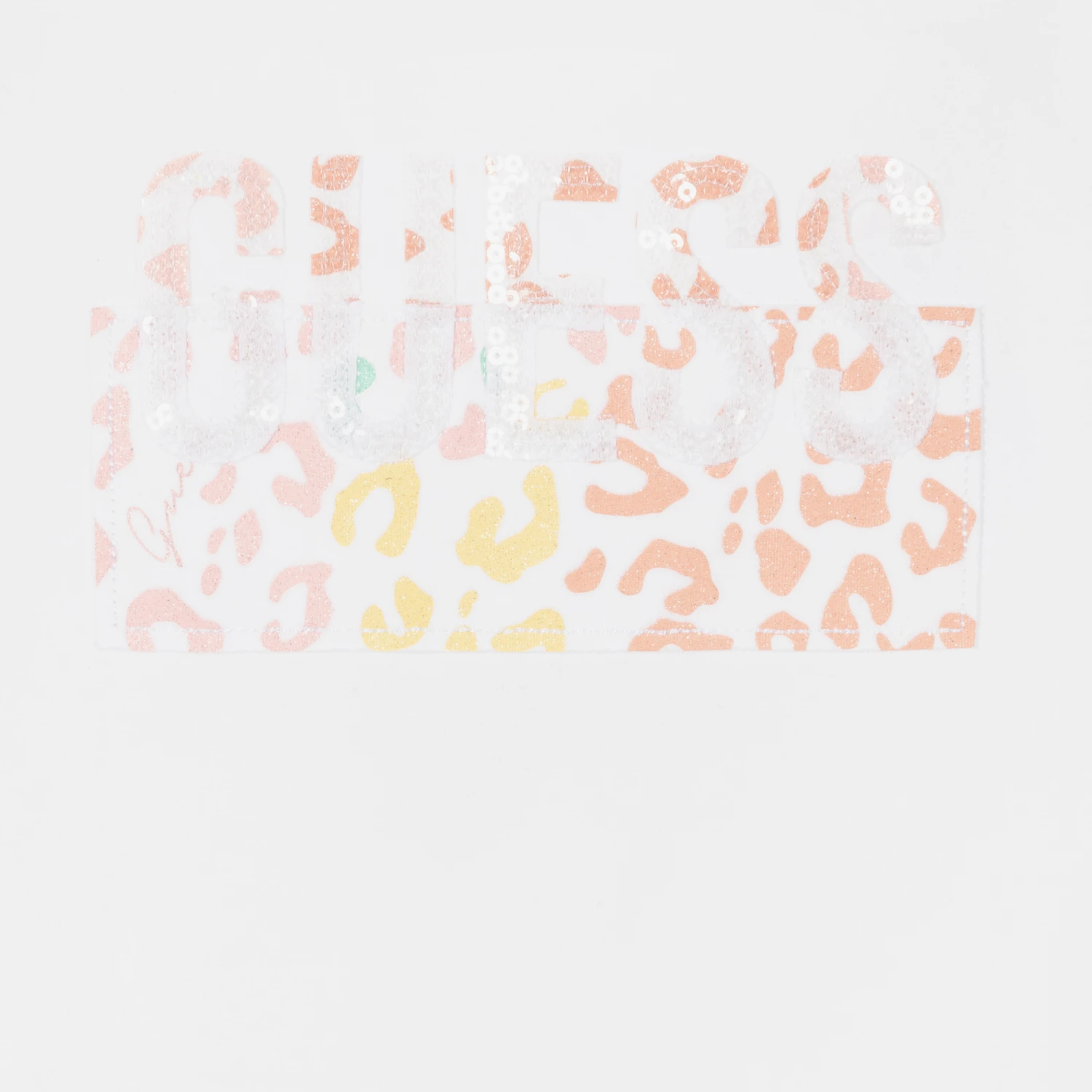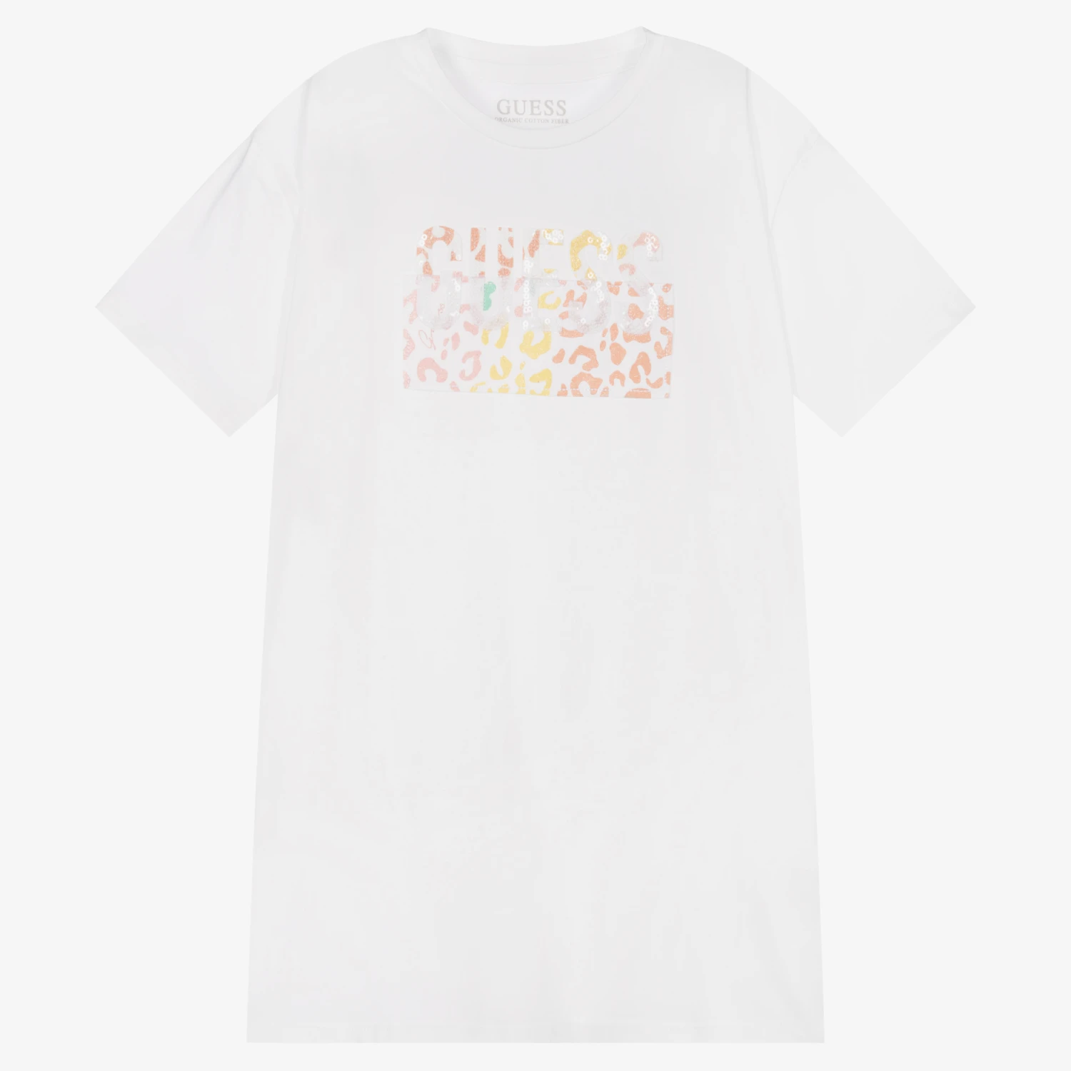 Casual white cotton T-shirt dress for teen girls by Guess. The front is embellished with a pink and yellow leopard print logo on the front with shimmering sequins. It is made in soft organic cotton jersey for a relaxed fit.