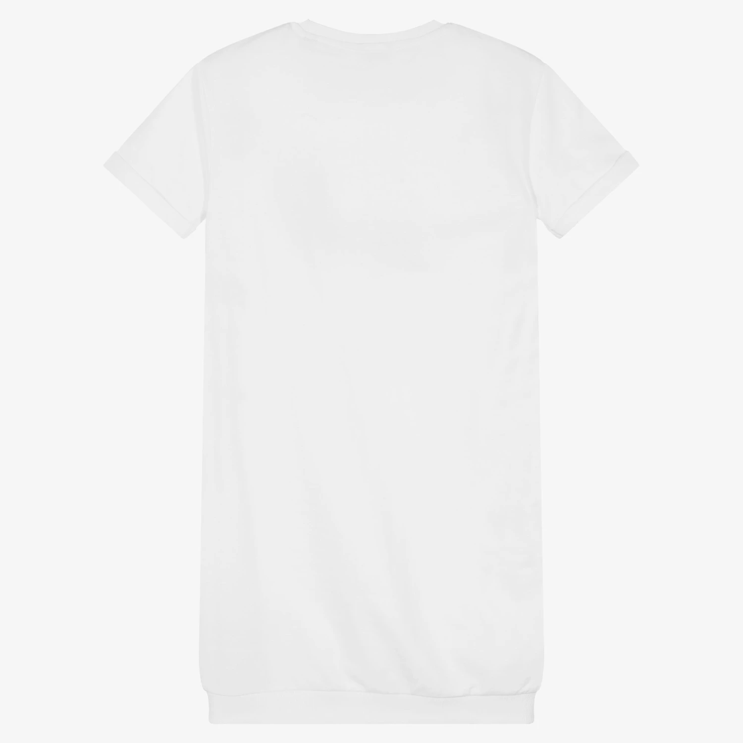 Teen girls white cotton dress by Guess, printed with the designer’s signature black Triangle logo. For an edgy look, it has iridescent ‘Icon’ slogan stamped on the front for a seasonal twist. Easy-to-wear, it has a casual crew neckline and turned-up cuffs. This item contains organic cotton fibres.