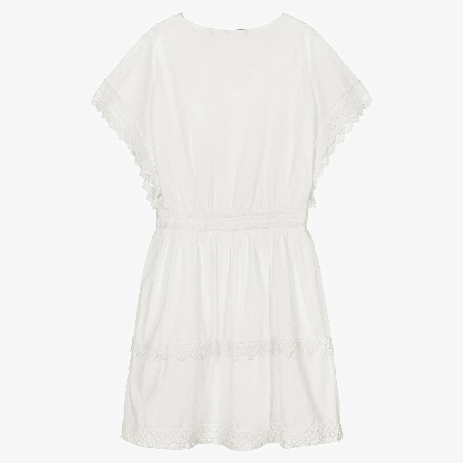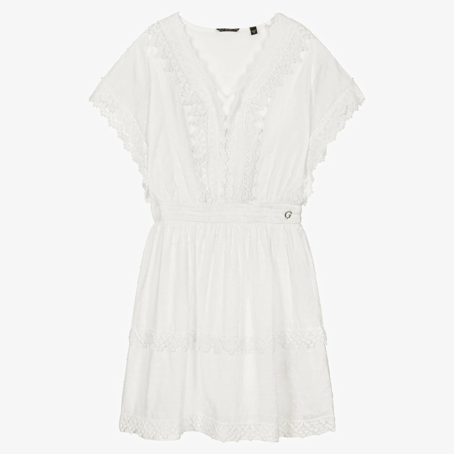 Summery white cotton dress for teen girls with a festival vibe by American brand Guess, as seen in the adult collection. Made in lined, lightweight cotton voile with plumetis, it has lovely lace trims on the neckline, sleeves and skirt. It has a comfortable, elasticated waist with a silver logo ‘G’ charm sewn on one side. Easy to wear, it simply pulls on.
