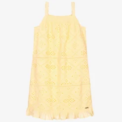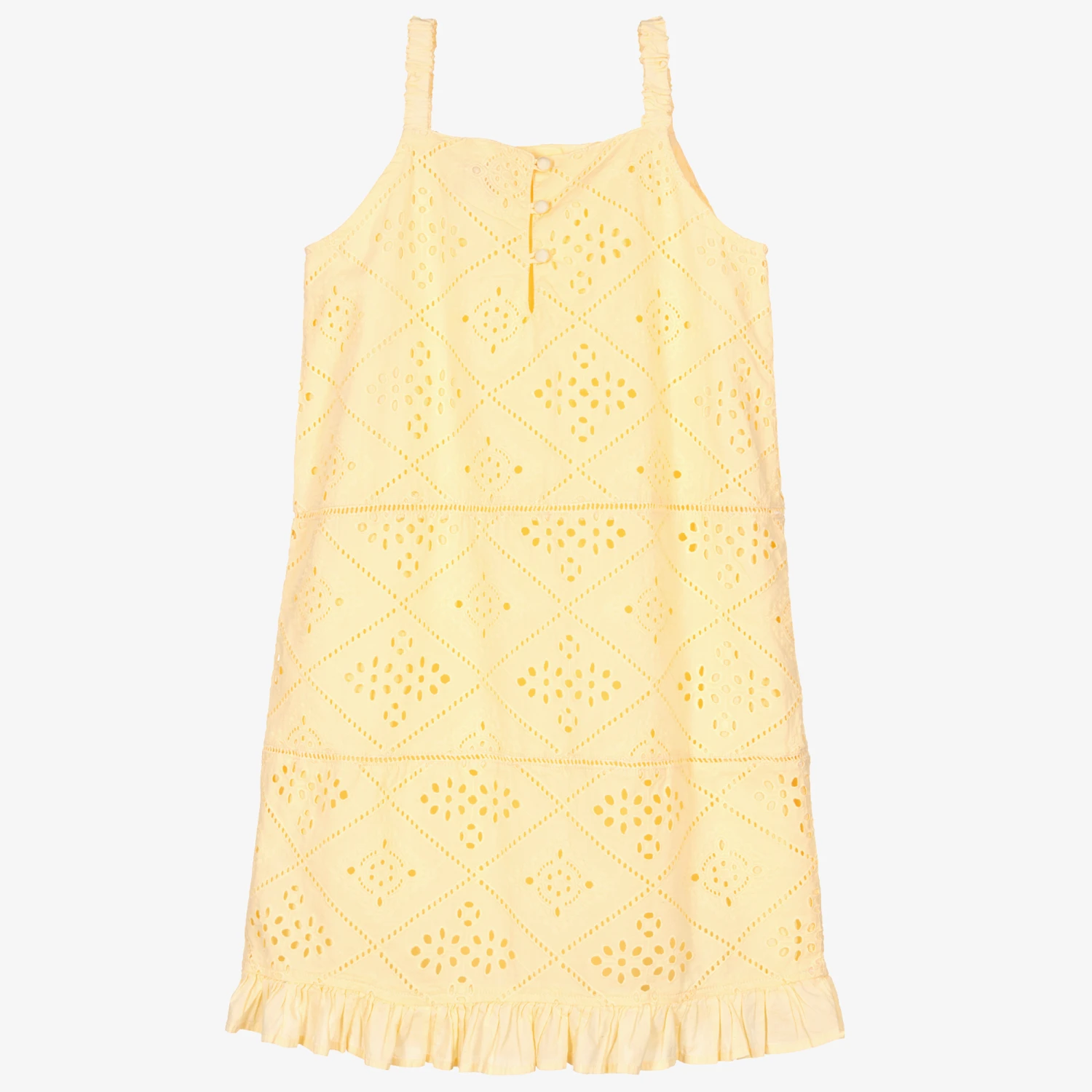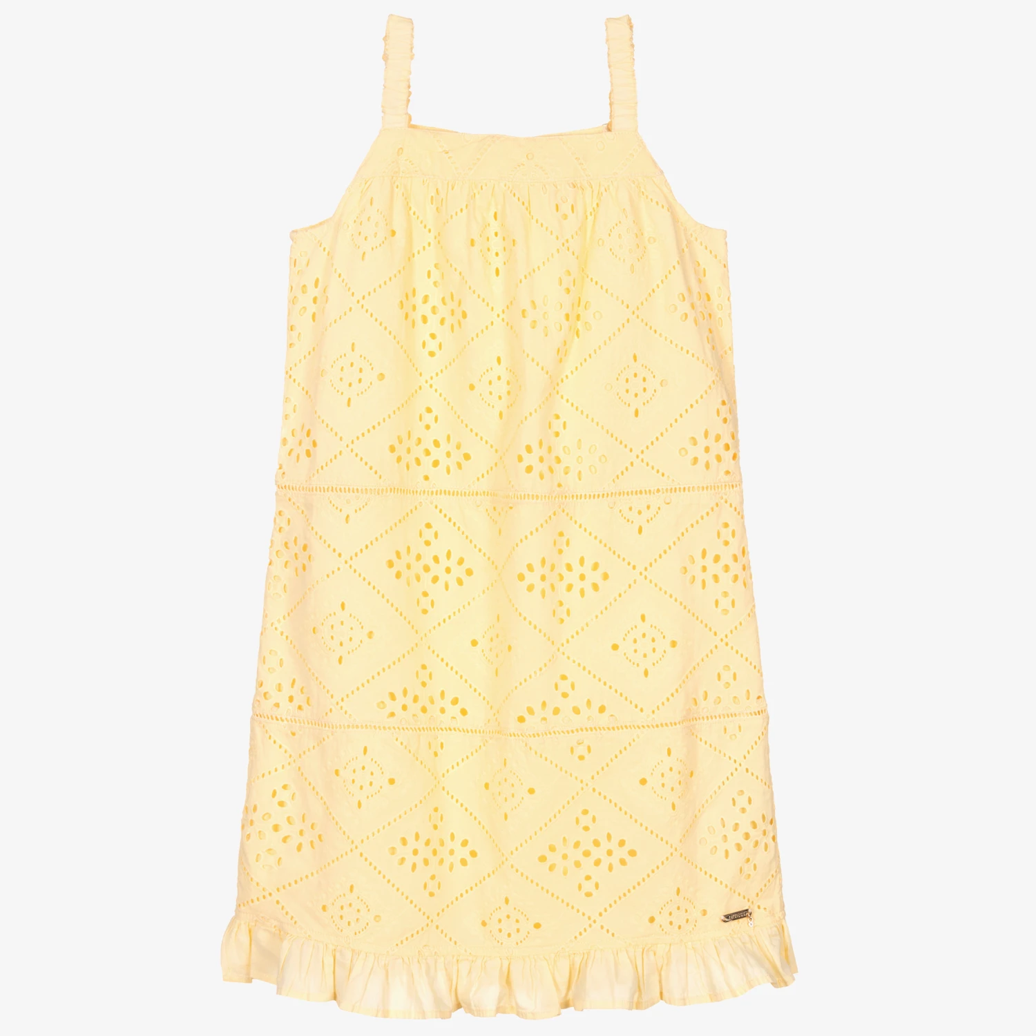 Summery pale yellow cotton dress for teen girls by Guess, made in lightweight broderie anglaise. With stretchy, elasticated shoulder straps, it is gathered below the square neckline and has a frilled hemline. There is a gold-tone logo charm on one side, with a single diamanté adding a touch of sparkle. Fully lined for comfort, it fastens with buttons around the back.