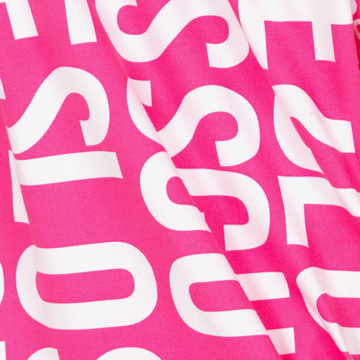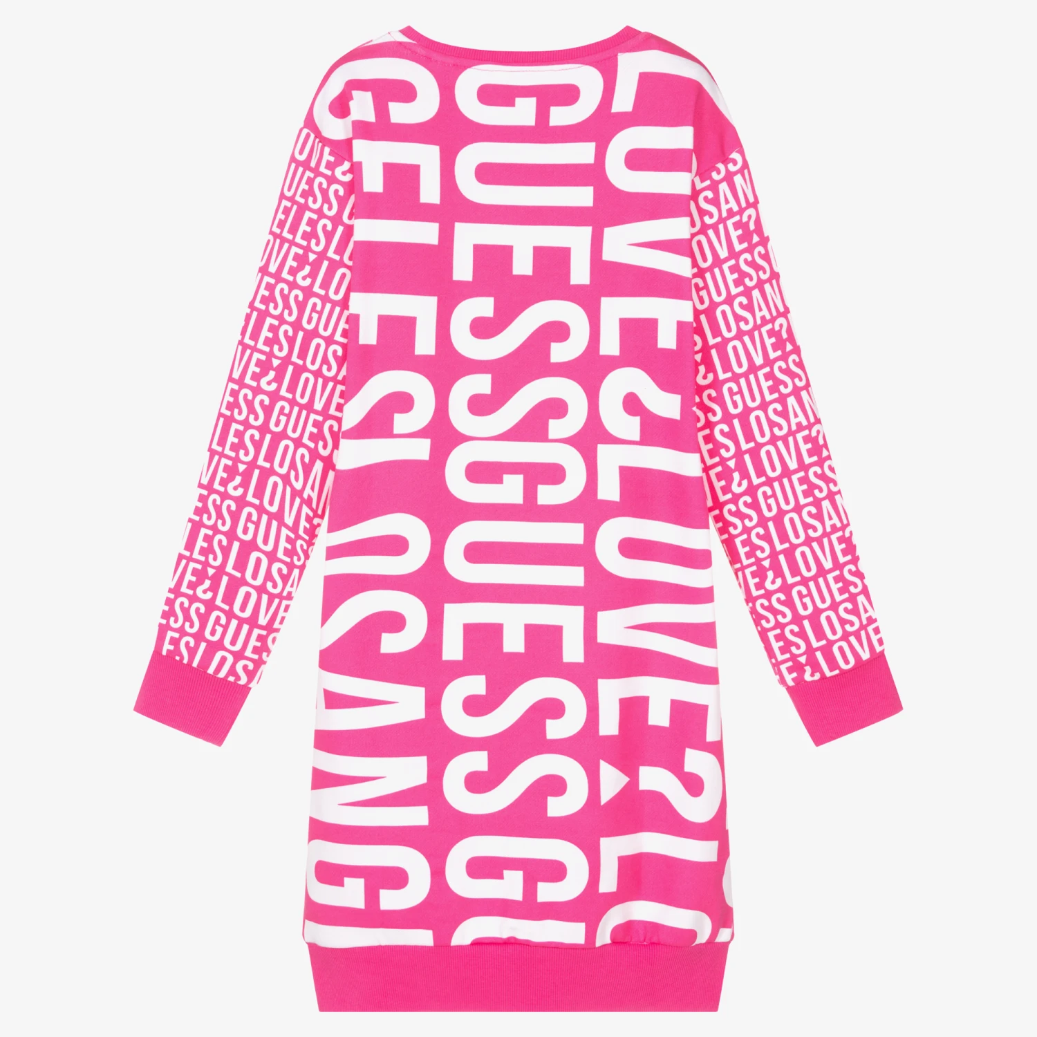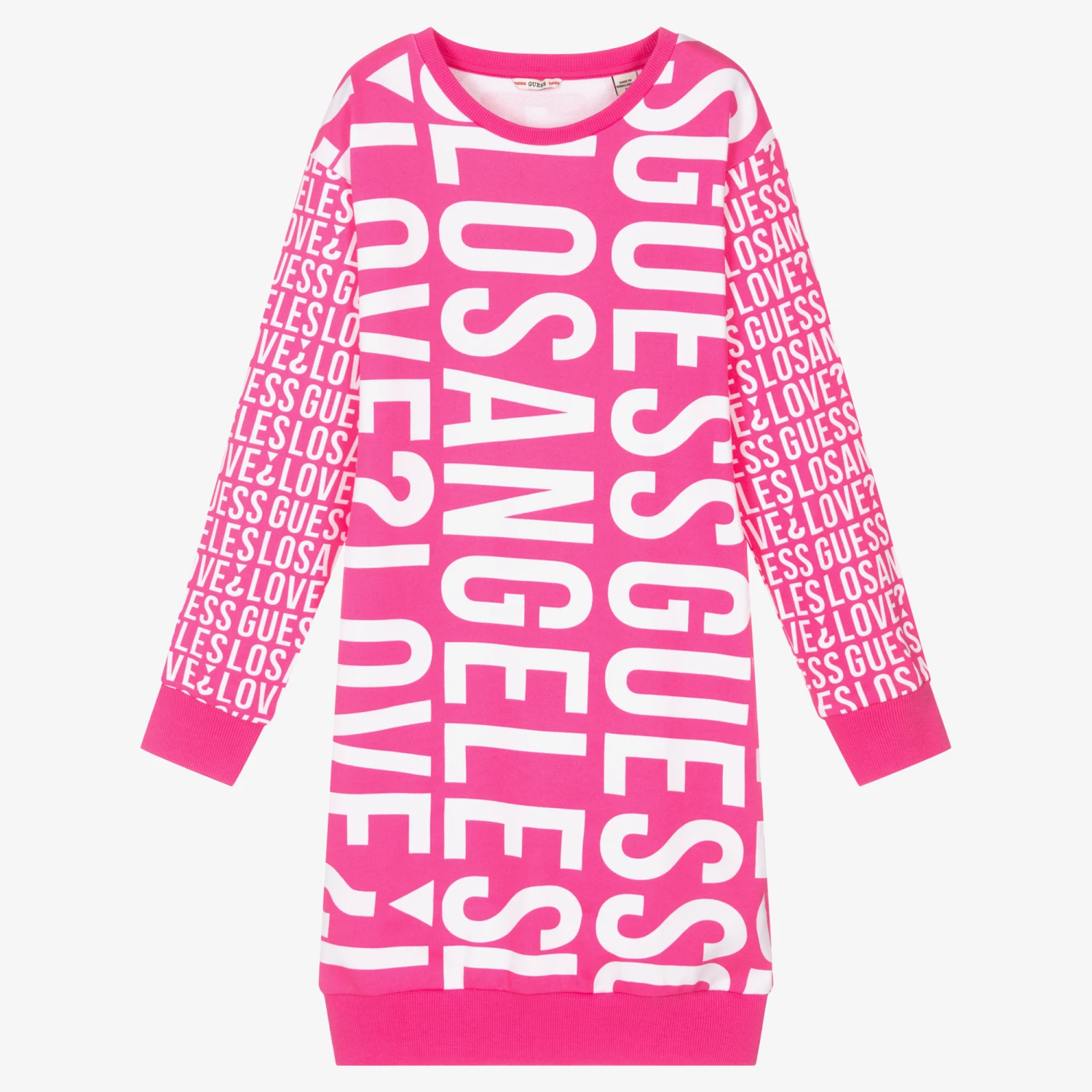 Fuchsia pink sweatshirt dress for teen girls is by Guess, made in mid-weight organic cotton jersey. This casual dress has a bold all-over logo design printed in white and ribbed trims.