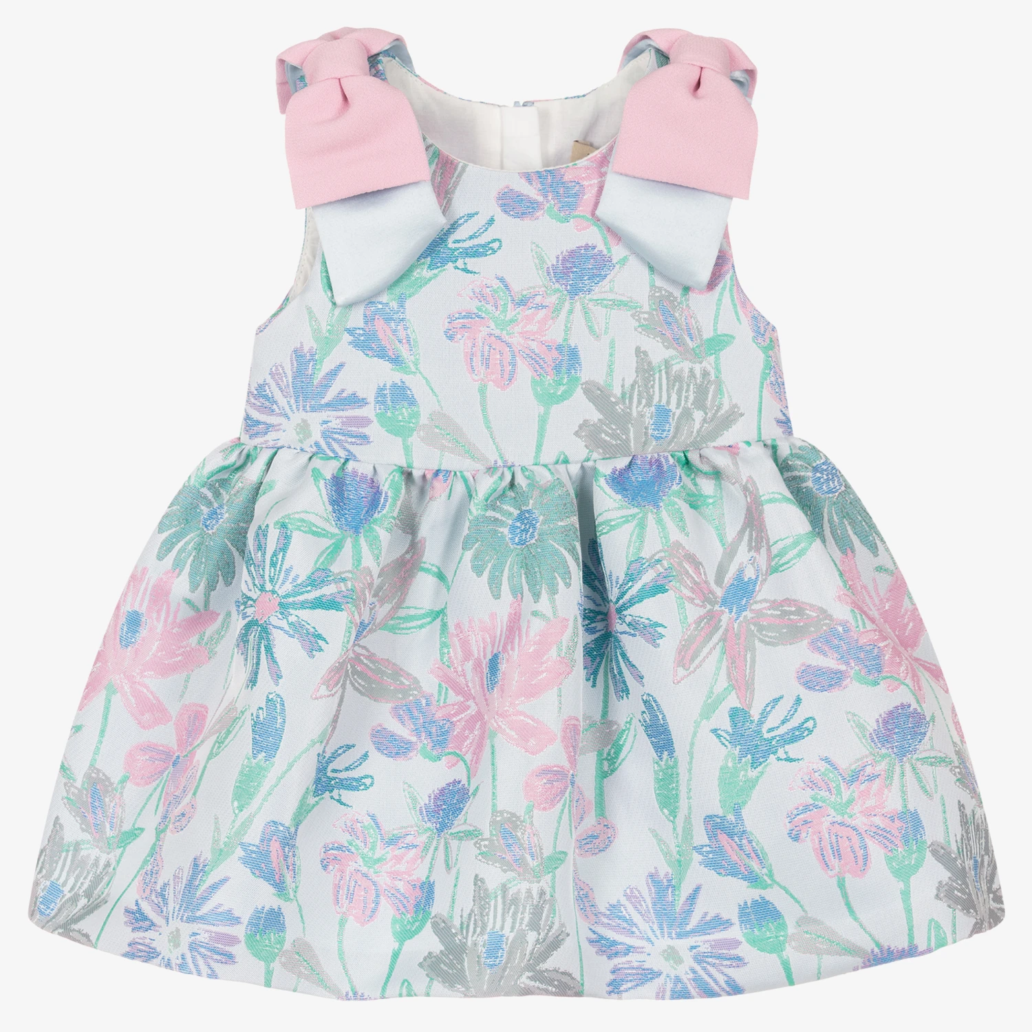 Gorgeous blue floral dress for baby girls, designed by British brand Hucklebones London. Lined in cotton voile with a layer of soft tulle for added volume, this beautiful dress has a pink, blue and green floral jacquard design with statement bows on the straps. It fastens with a concealed zip on the back and comes with matching elasticated knickers for a special look.