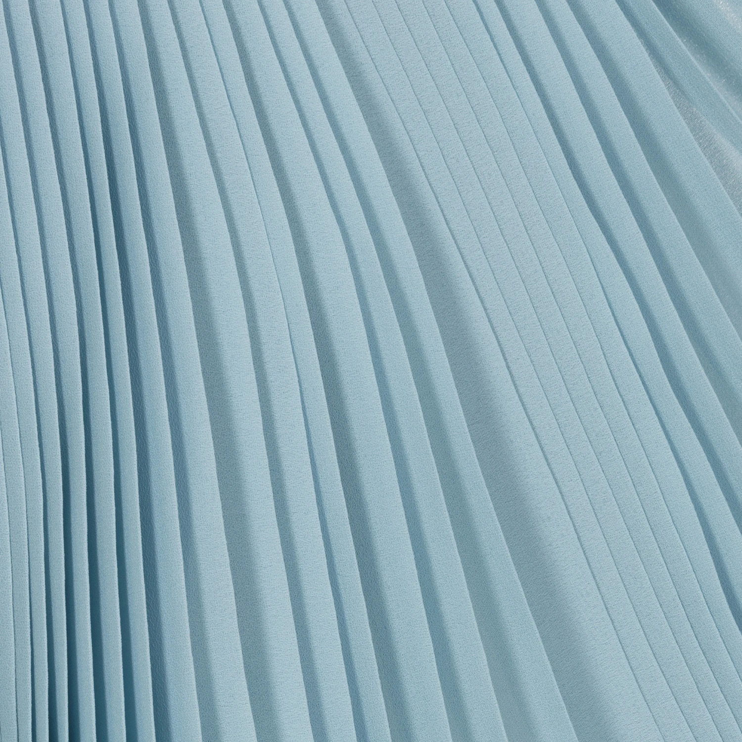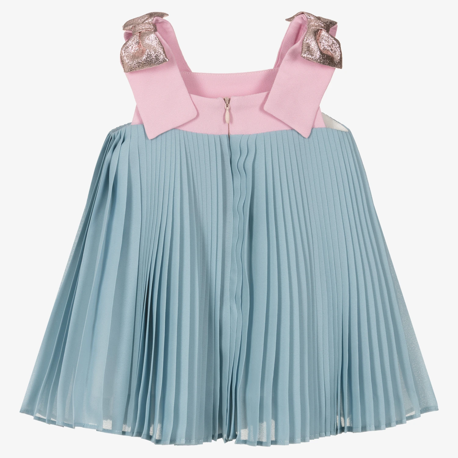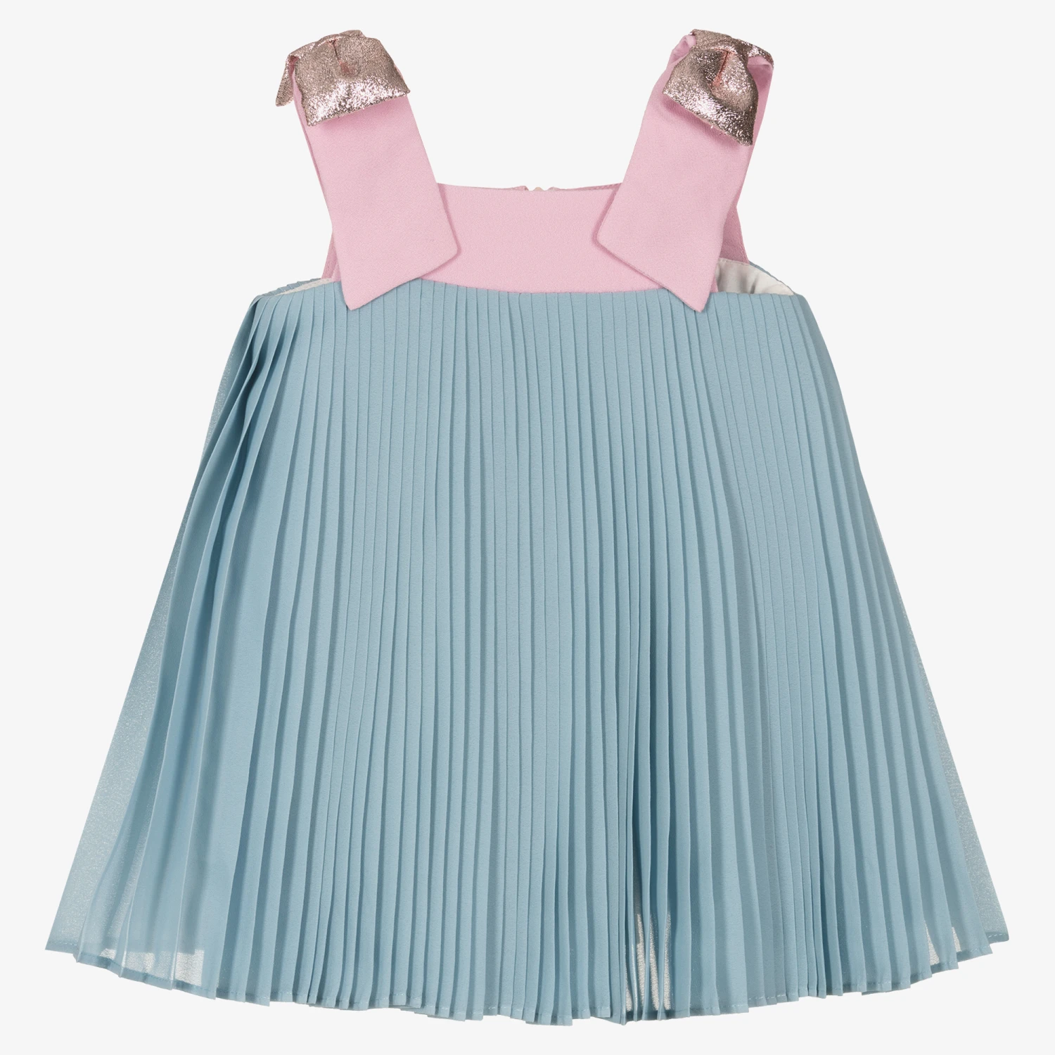 Baby girls special occasion dress from Hucklebones London, exquisitely pleated in sheer blue chiffon. An elegant trapeze design with a beautiful flared shape, it has an pink crêpe empire neckline with shimmering pink lamé bows on the shoulders. The dress is lined in lightweight cotton with a tulle layer for extra volume and fastens with a concealed zip on the back. It comes with matching lined knickers that are gently elasticated for comfort.