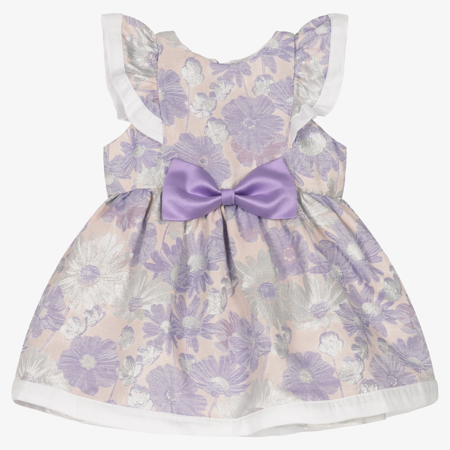 Special occasion floral jacquard dress for baby girls by Hucklebones London, with a lilac purple, pink and silver pattern. A classic style, it has a fitted bodice with lovely ruffles over the shoulders and a satin twill bow on the waistline. The full gathered skirt has tulle underlayers for added volume and the dress has a comfortable lightweight lining. There is a discreet zip fastening on the back for a neat finish and matching knickers complete the look.