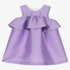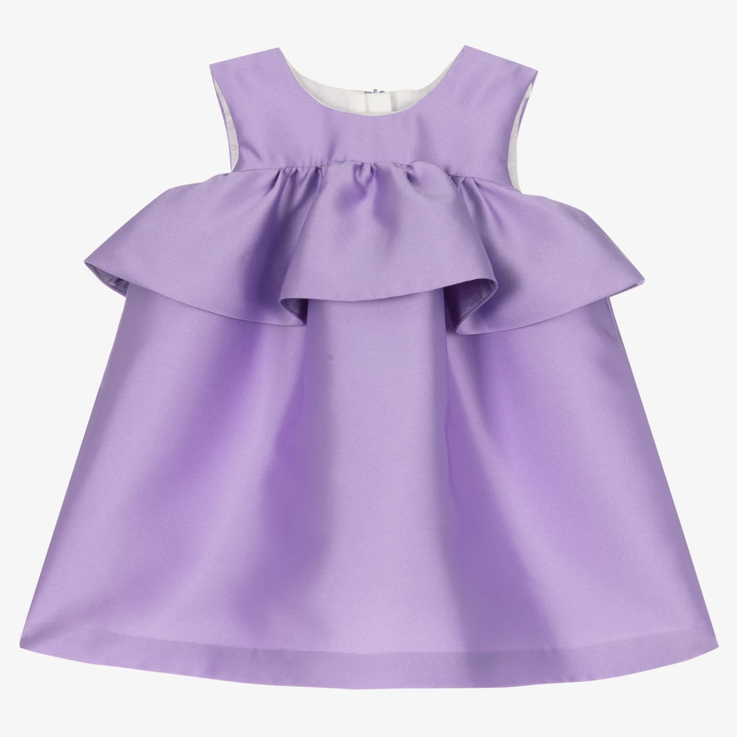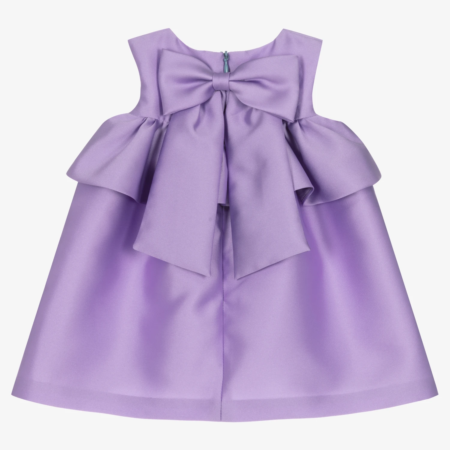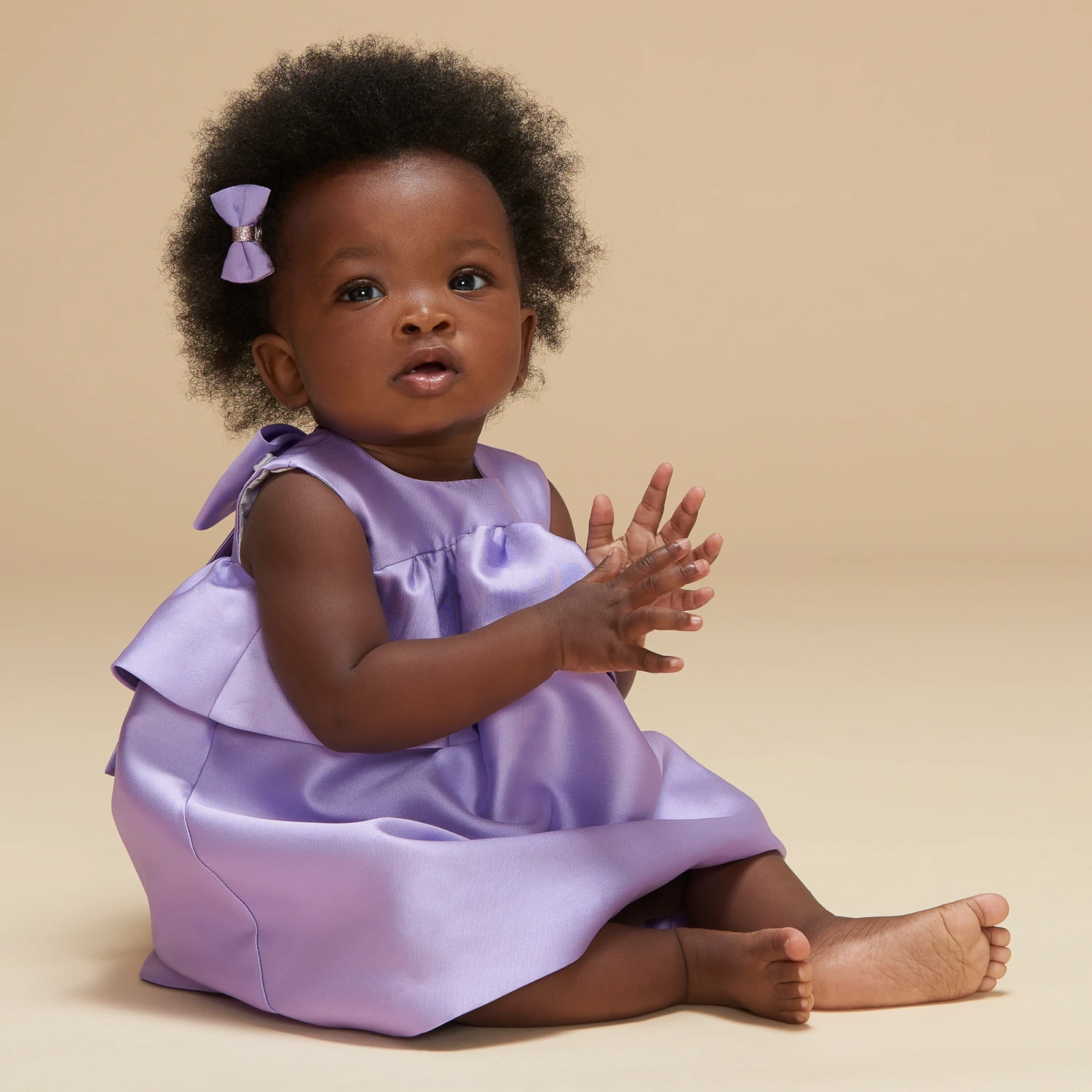 Stylish purple sleeveless dress for baby girls by British brand Hucklebones London, made in luxurious satin twill. Ideal for a special occasion, this voluminous style has a deep ruffle trim on the bodice and a statement bow detail on the back. It is fully lined in lightweight cotton for comfort and has a discreet zip fastening on the back for a neat finish. It comes with matching knickers to complete the look.