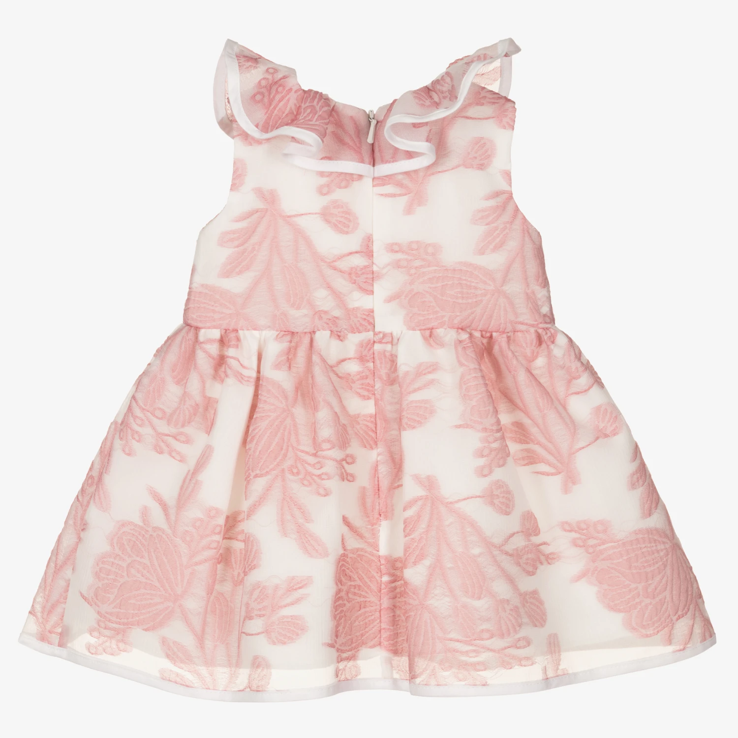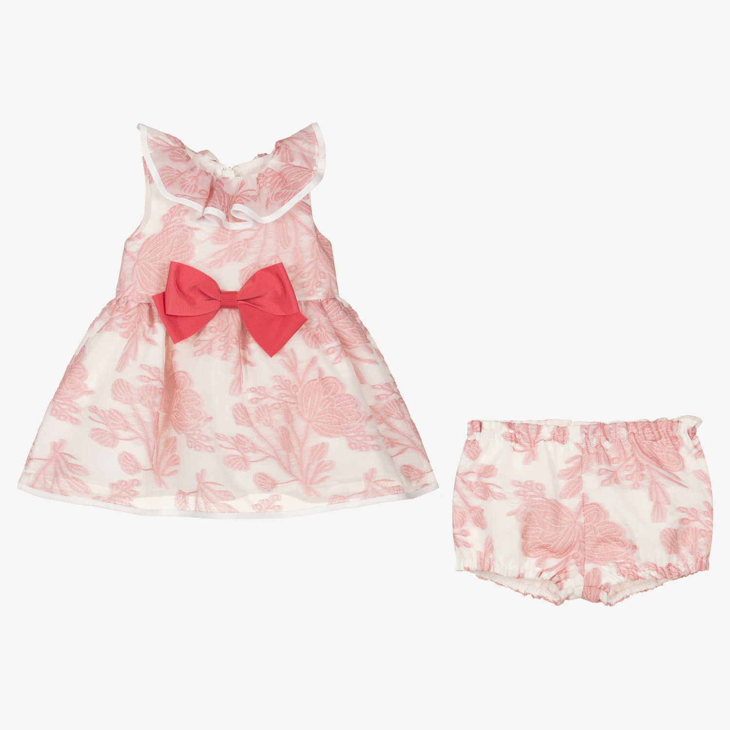 Lovely white and pink special occasion dress for baby girls, by Hucklebones London. With a gorgeous flared skirt, this dress has a sweet ruffle collar with white edging and a statement pink grosgrain bow on the waist. Created in beautifully elegant organza, it has an embroidered pink floral design all-over with a concealed zip on the back. Lined with layers of tulle for added volume, this dress pairs with matching elasticated knickers to complete the sweet set.