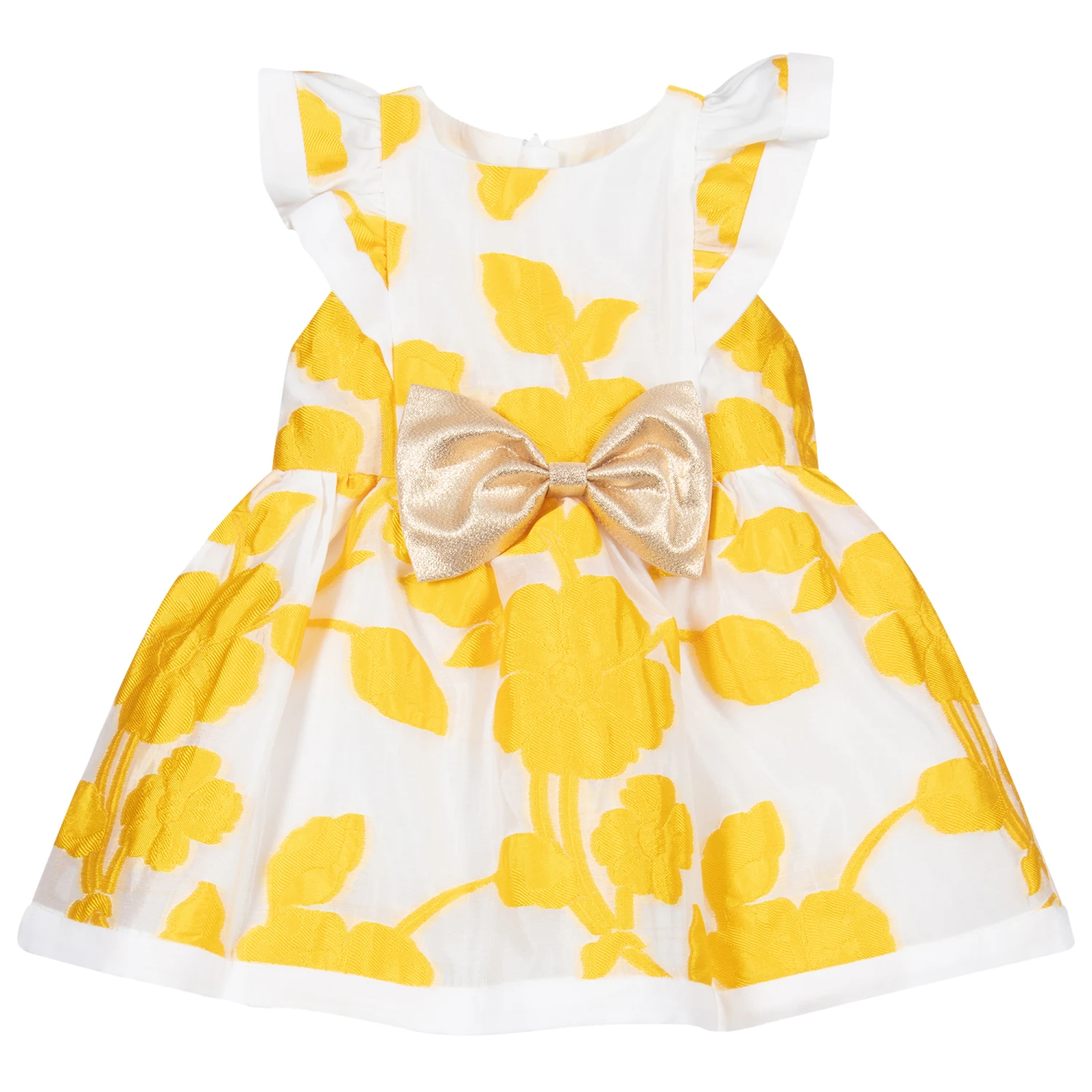 White dress set for baby girls by Hucklebones London, made in lightweight organza with a yellow floral brocade pattern. It is lined in soft, lightweight cotton and the skirt has an additional satin lining, with a tulle layer for added volume. There is a large fixed glittery gold bow at the waist and matching lined knickers.