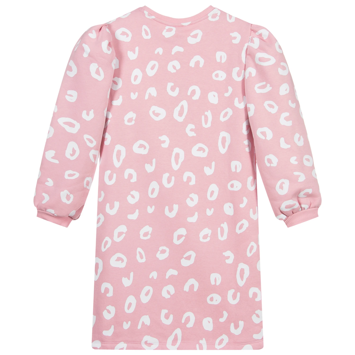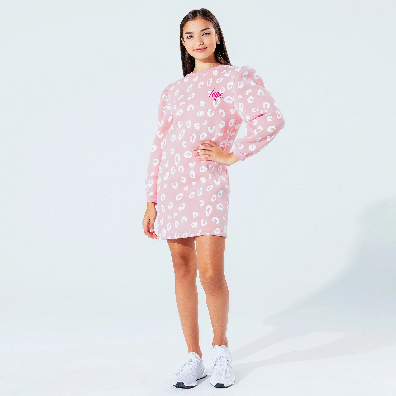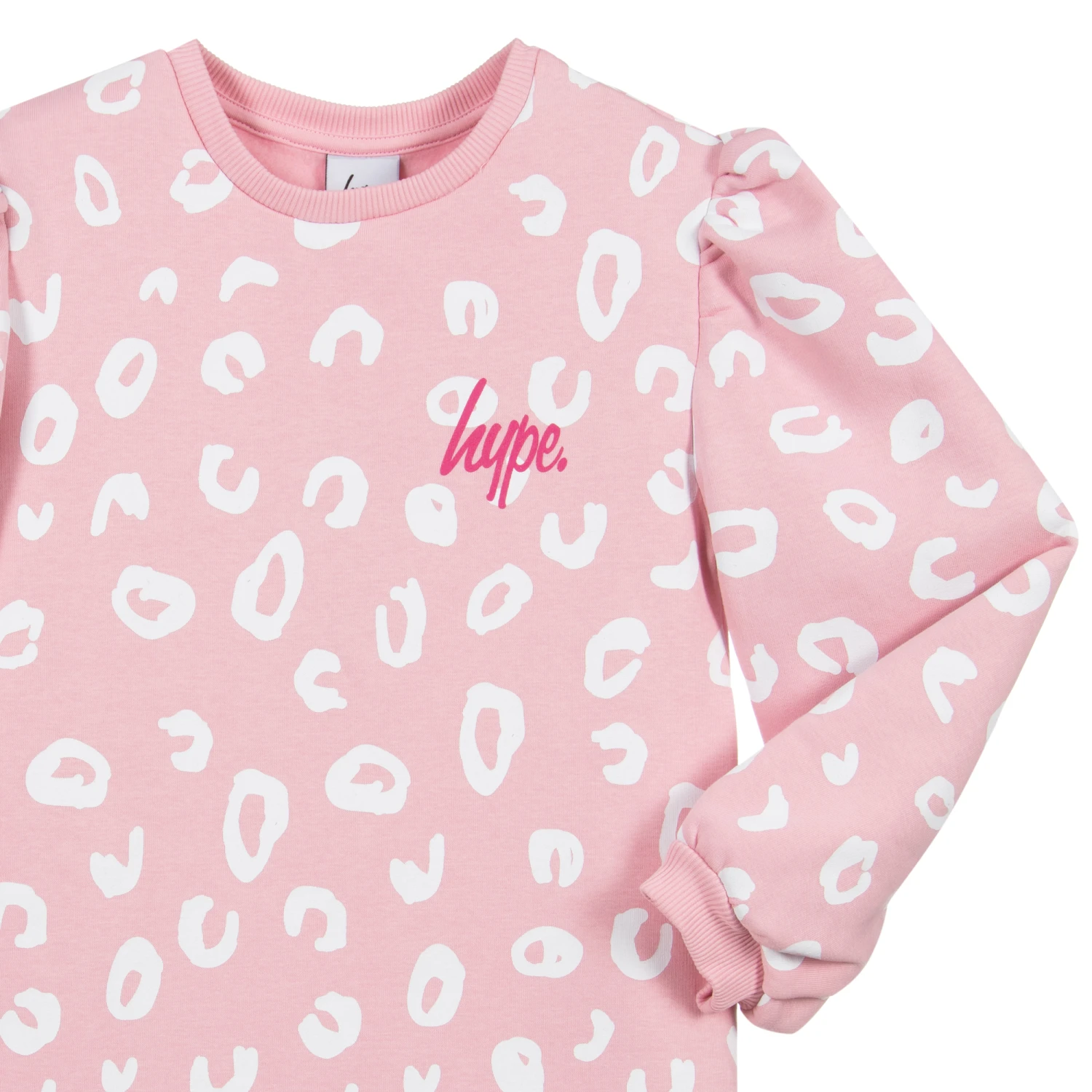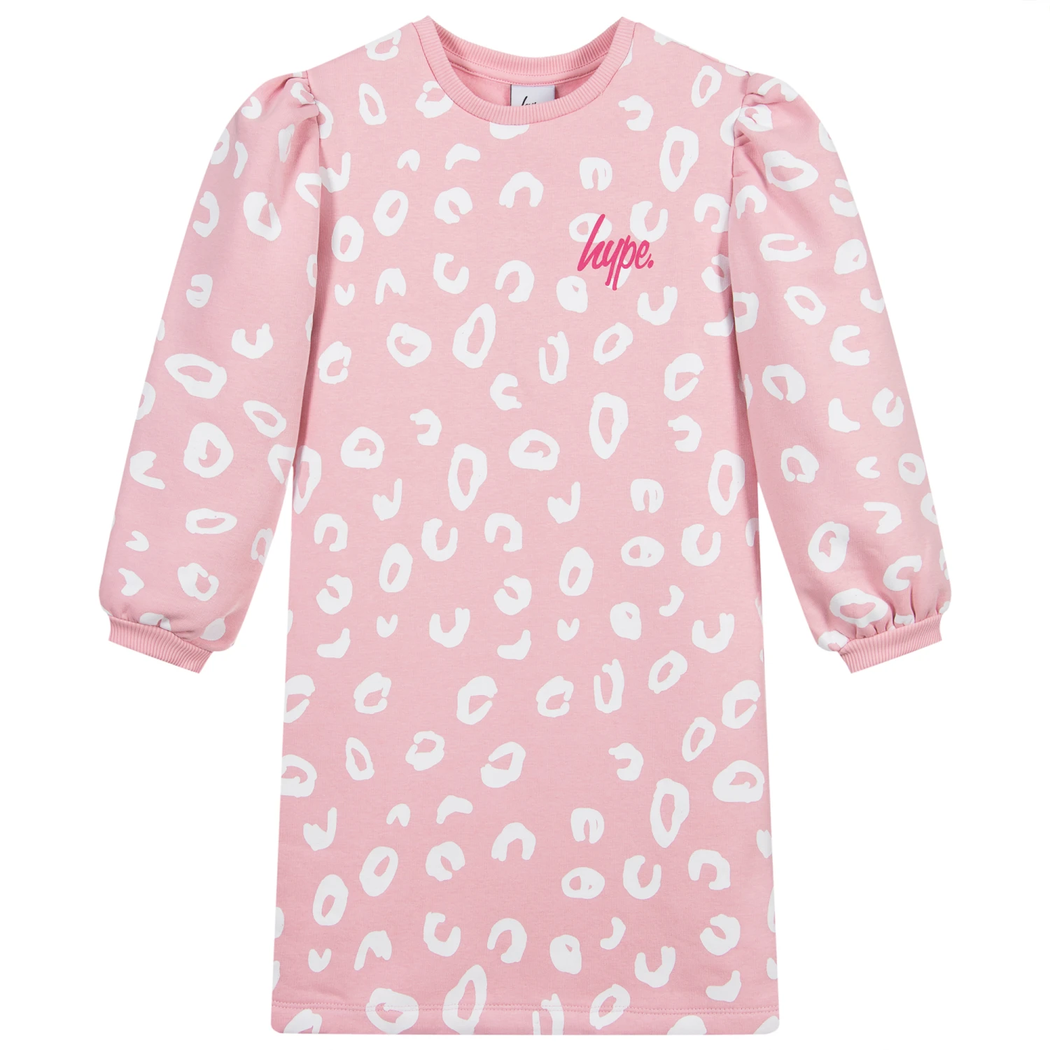 Teen girls pink sweatshirt dress by Hype kids, with a white circular print and pink logo. It is made in soft jersey with a fleecy inside, and has puffed sleeves gathered on the shoulder.