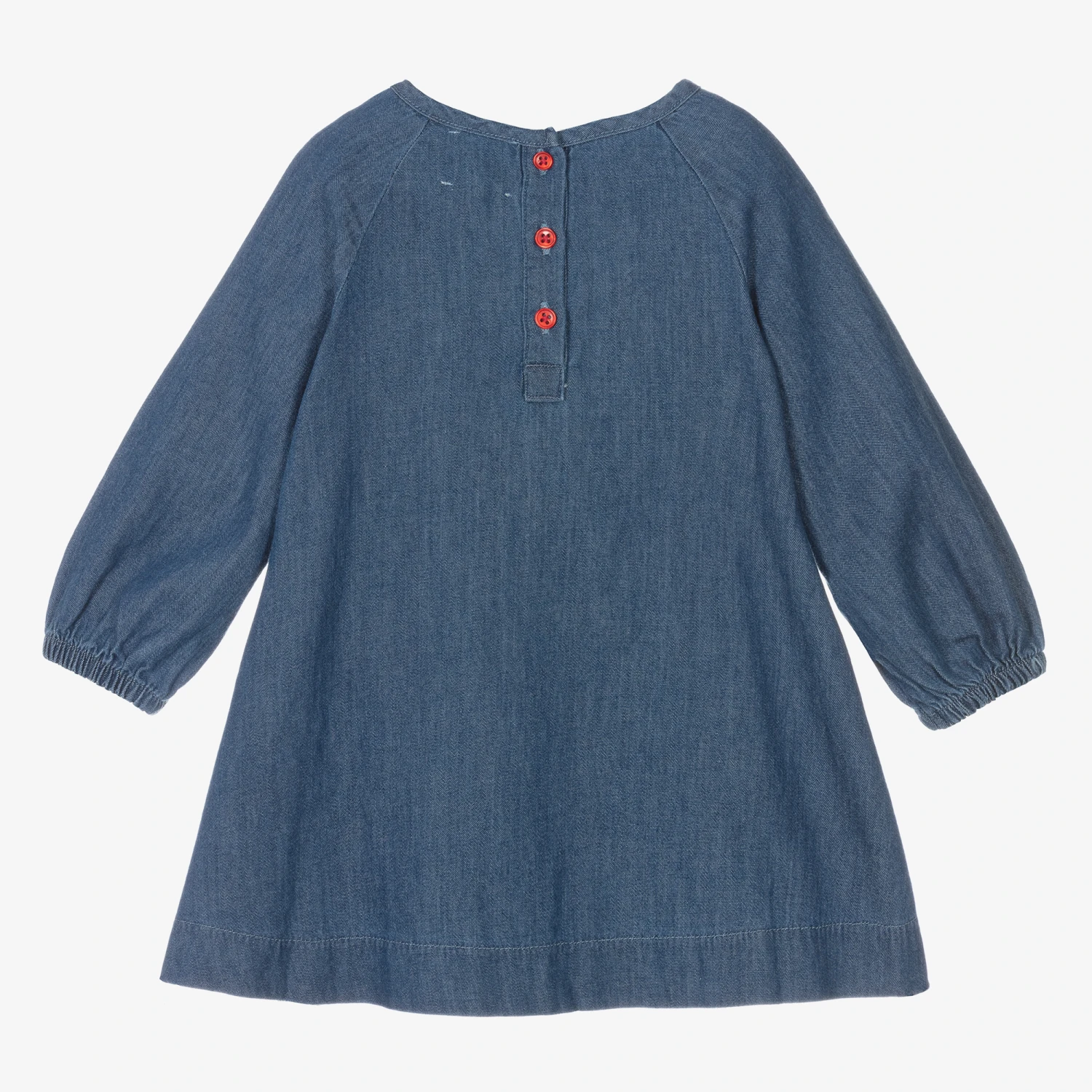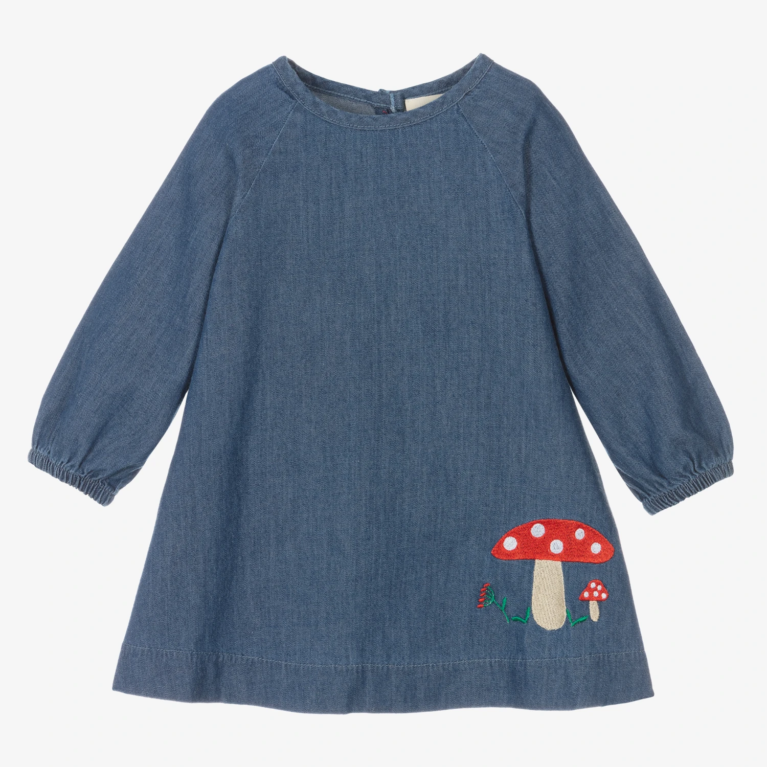 Lovely blue chambray dress for baby girls by British brand Joyday, exclusive to Childrensalon. Ideal for casual days, it is made in comfortable cotton, with gently elasticated cuffs on the raglan sleeves. A-line in style, it has a cute toadstool embroidered on one side and red button fastenings on the back.