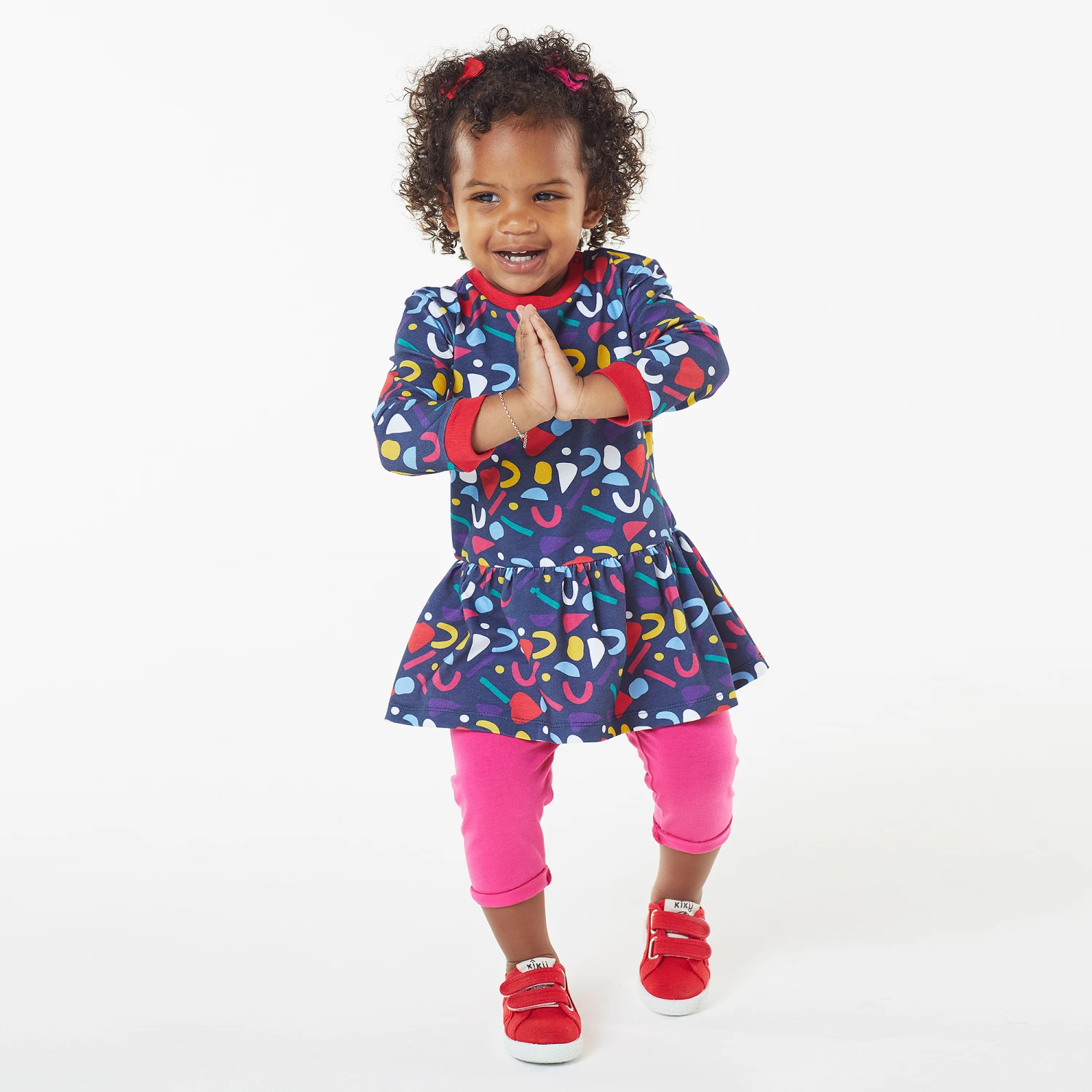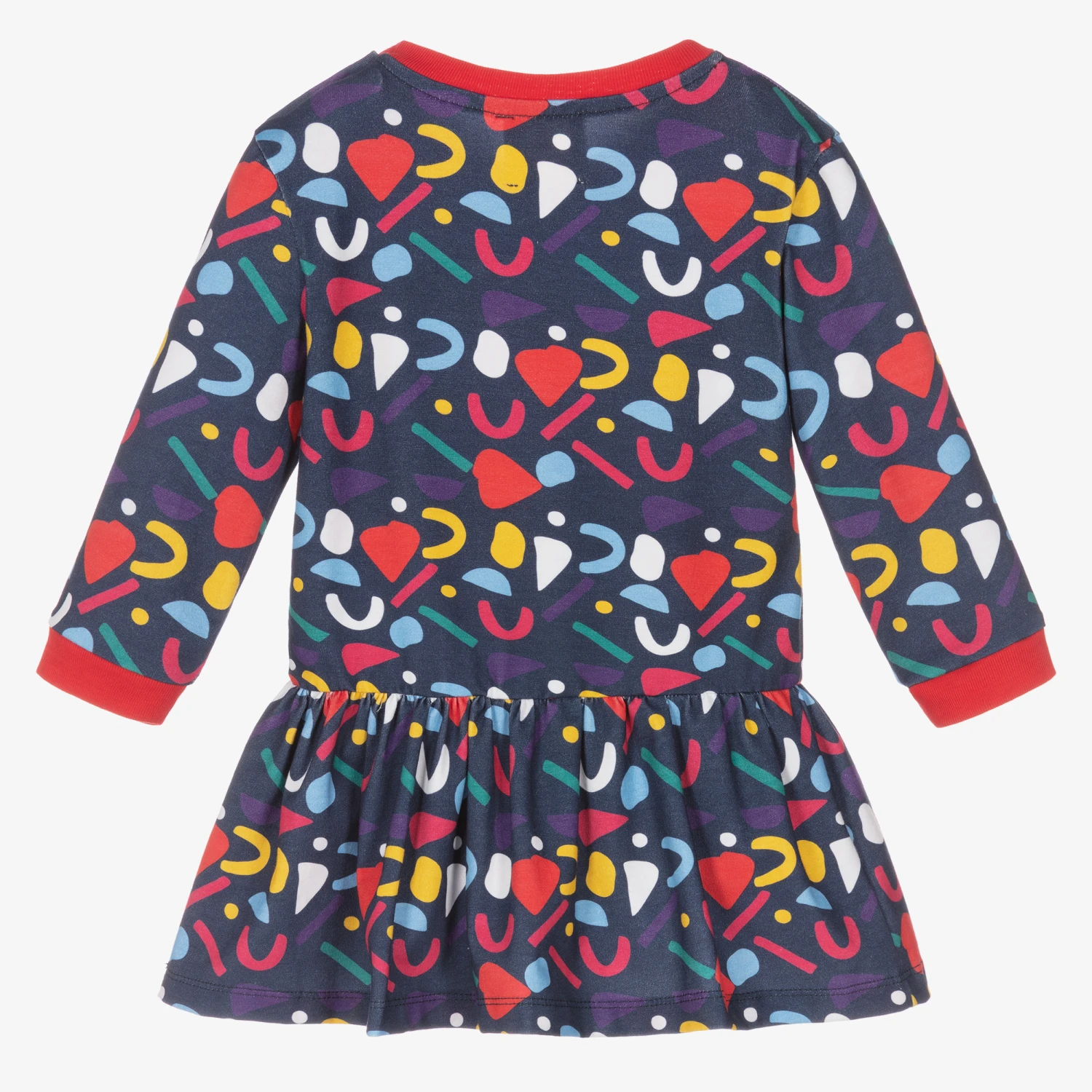 Navy blue dress for baby girls by British brand Joyday, exclusive to Childrensalon. With a colourful confetti pattern and red ribbed trims, it has a gathered, drop-waisted skirt. Made in super soft, comfortable jersey, it is easy to wear, with popper fastenings on one shoulder.