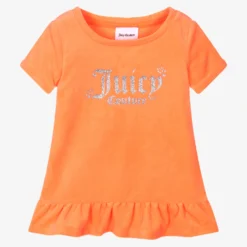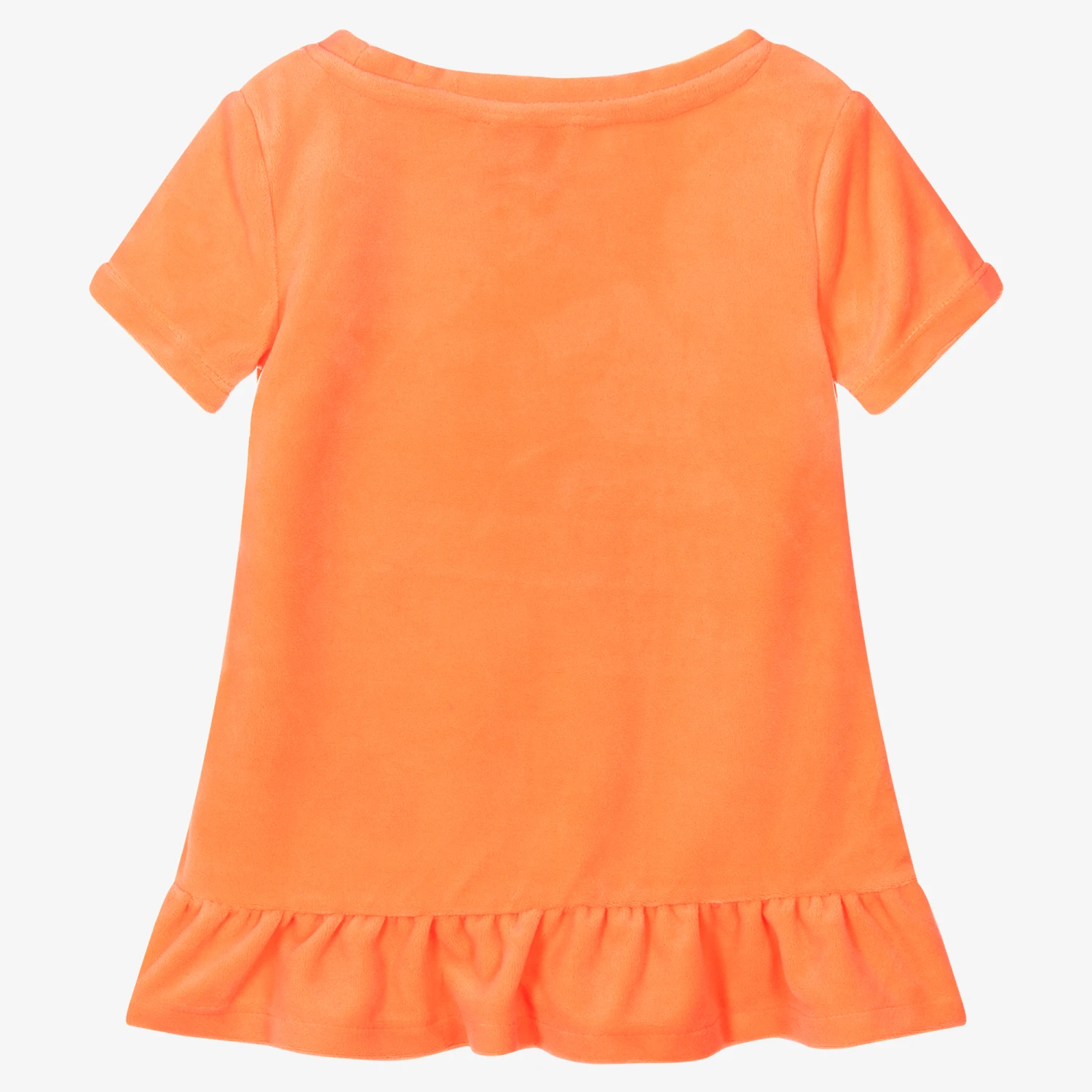 Neon orange dress for little girls made in a super soft velour. Unmistakably, Juicy Couture, it has the brand’s iconic logo printed across the chest in a glittery silver finish. With a pretty ruffle hem, this comfortable and easy to wear dress simply slips on over the head.