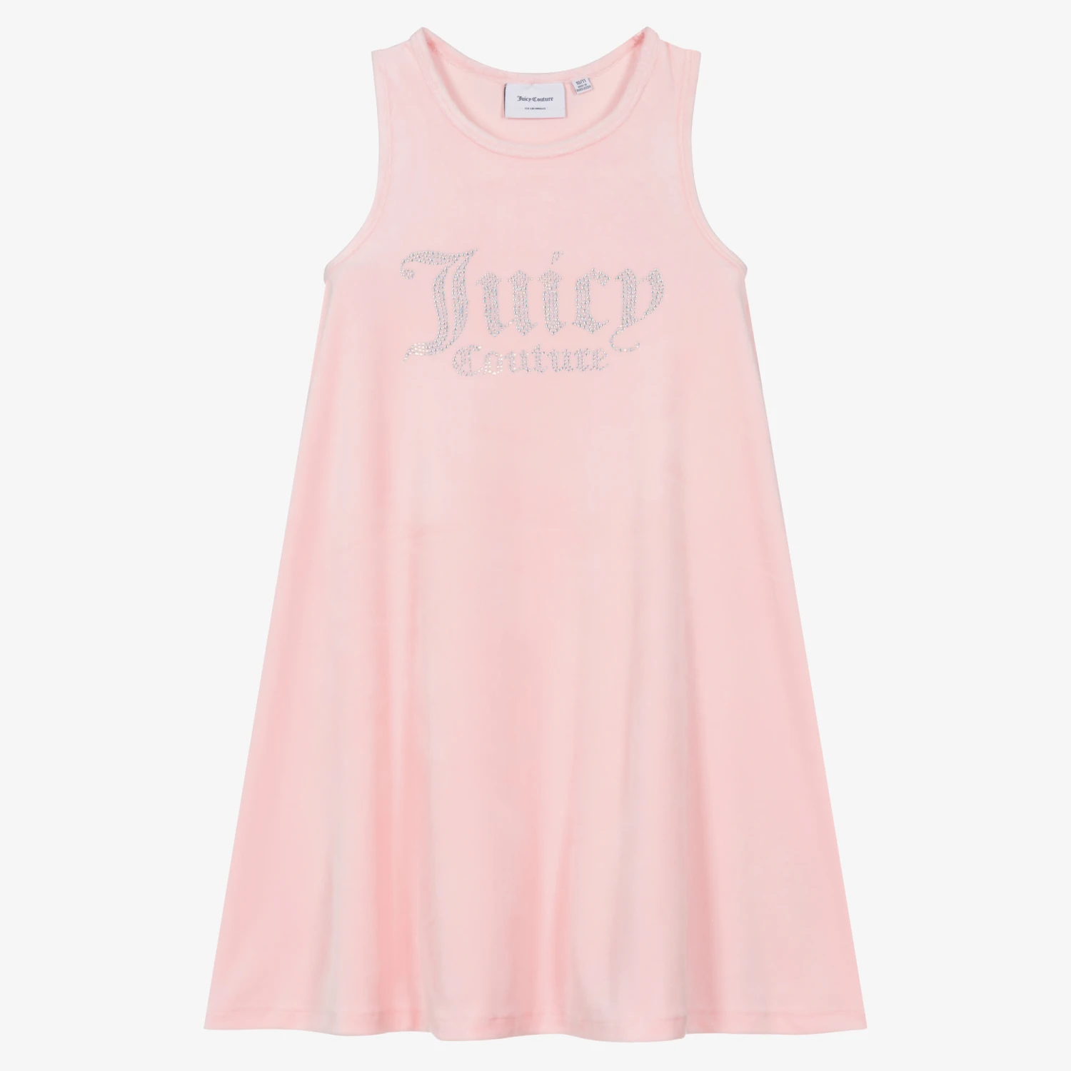 Pink sleeveless dress for teen girls by Juicy Couture, with the brand’s signature, eye-catching logo on the front in iridescent diamantés. This fun, A-line style dress is made in soft, comfortable velour for easy, relaxed wear.