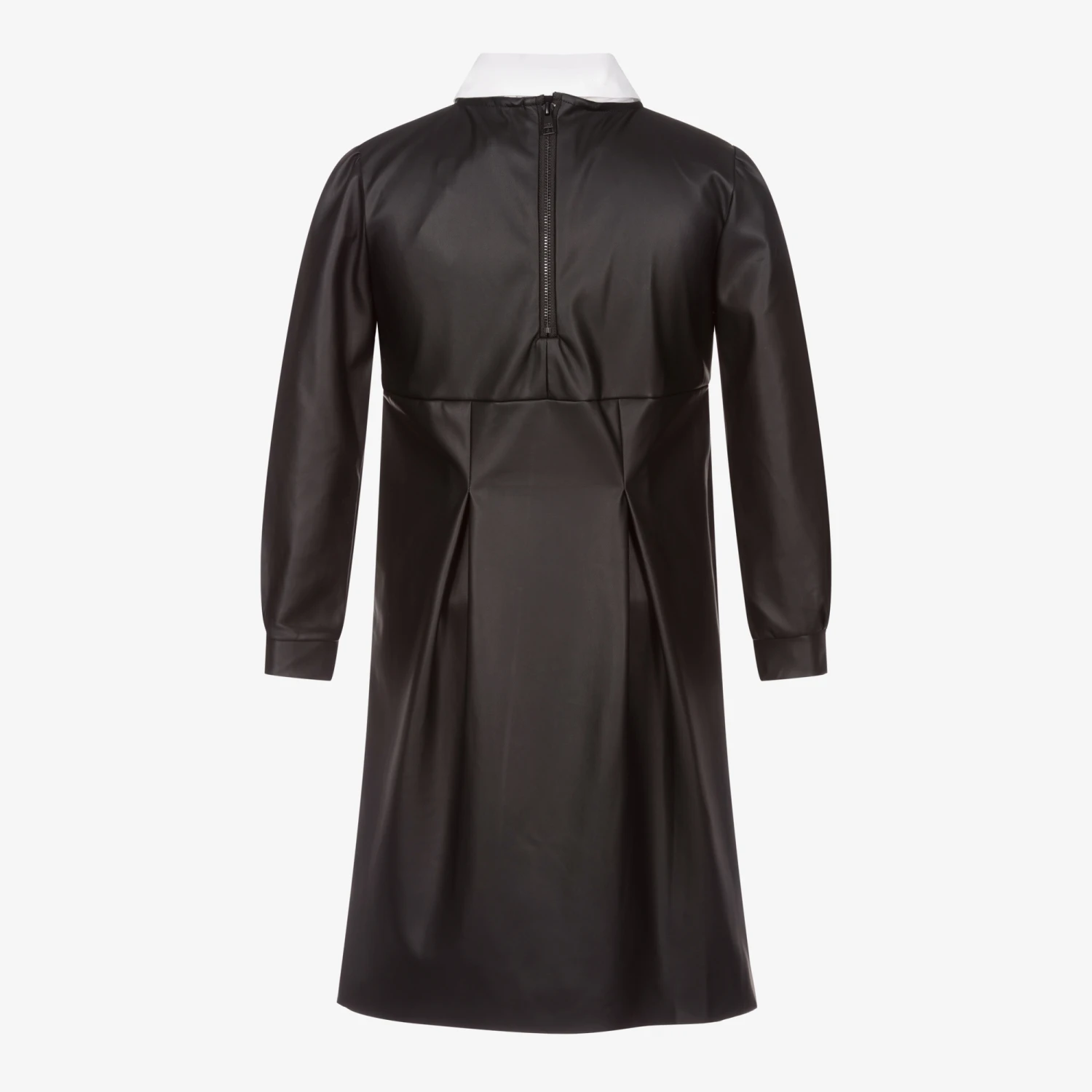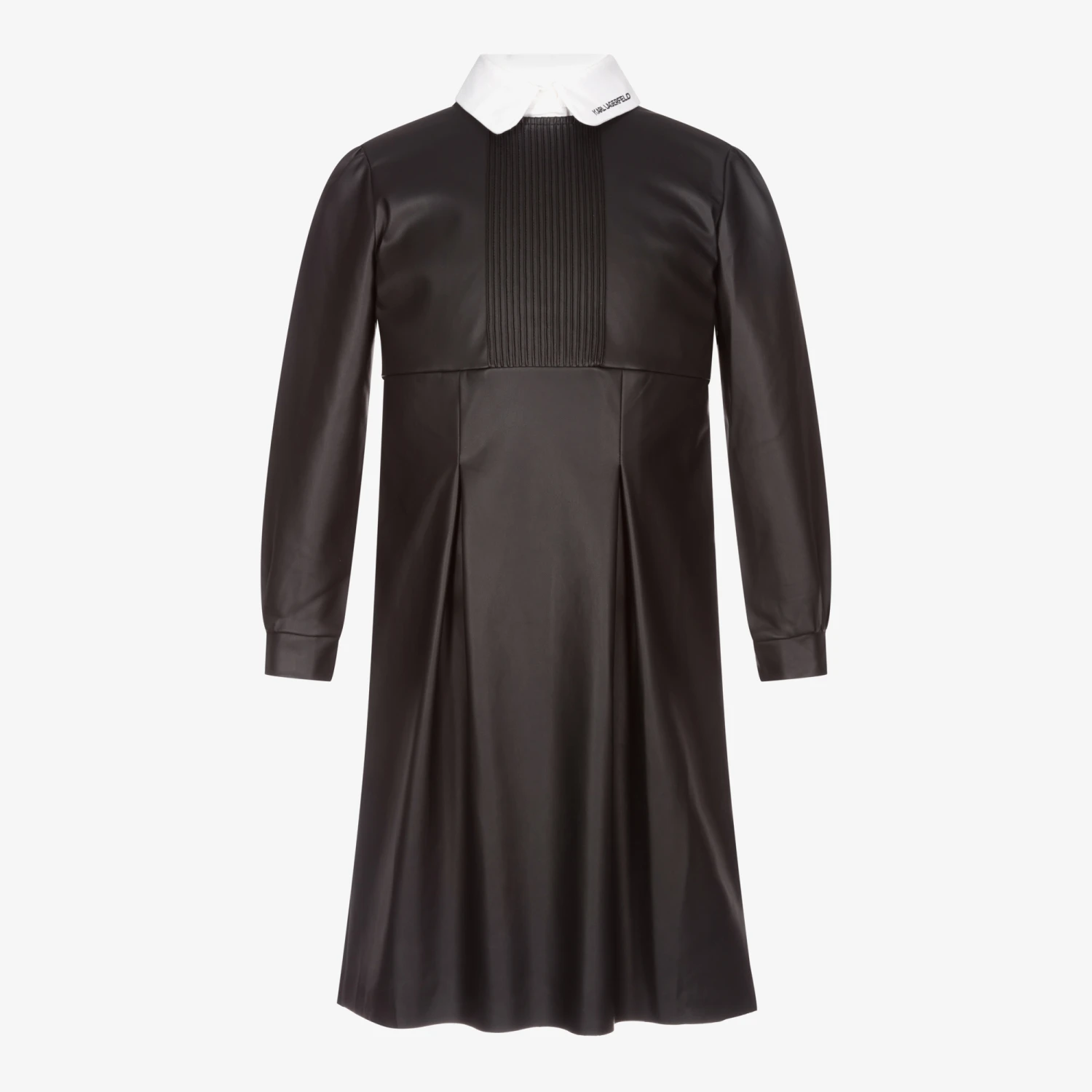 Black faux leather dress for teen girls by KARL LAGERFELD KIDS, with pin tuck detailing on the bodice. The white viscose collar is removable and has a black logo print. The dress has gently puffed sleeves, pleats on the skirt, and a zip fastening on the back.