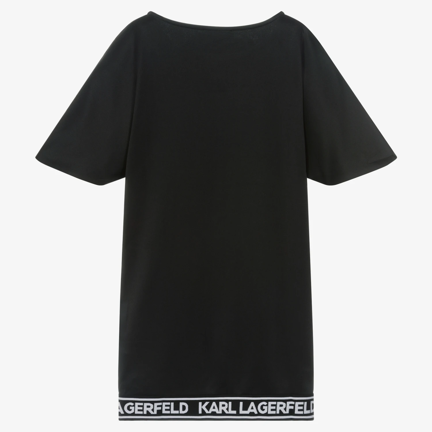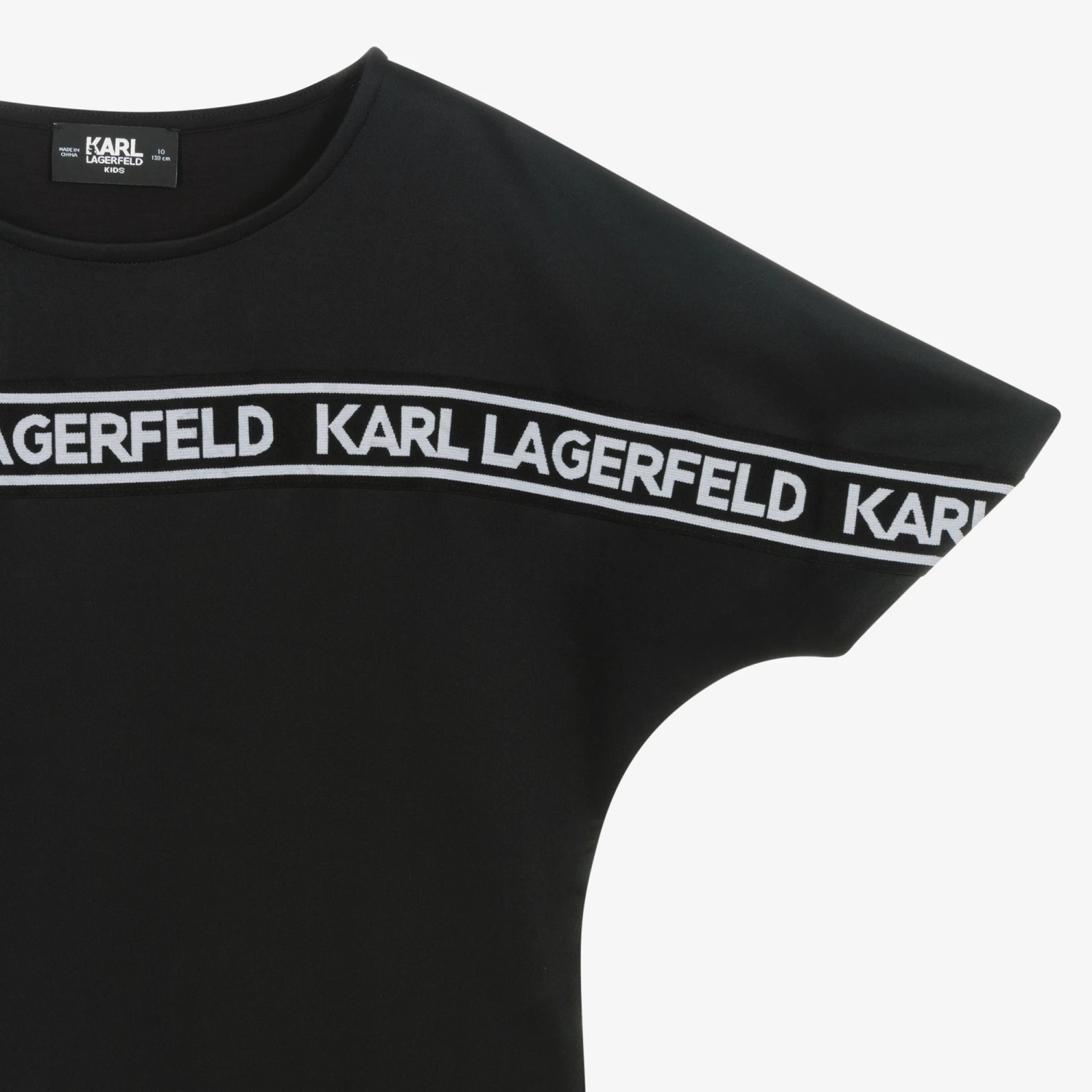 Casual black dress for teen girls by KARL LAGERFELD KIDS, with monochrome logo tape trims across the front and around the hem. Edgy and bold, it has a relaxed fitting batwing style, giving it a gentle sweatshirt look. With useful pockets on the side seams, it is made in super soft and silky double jersey for optimum comfort.