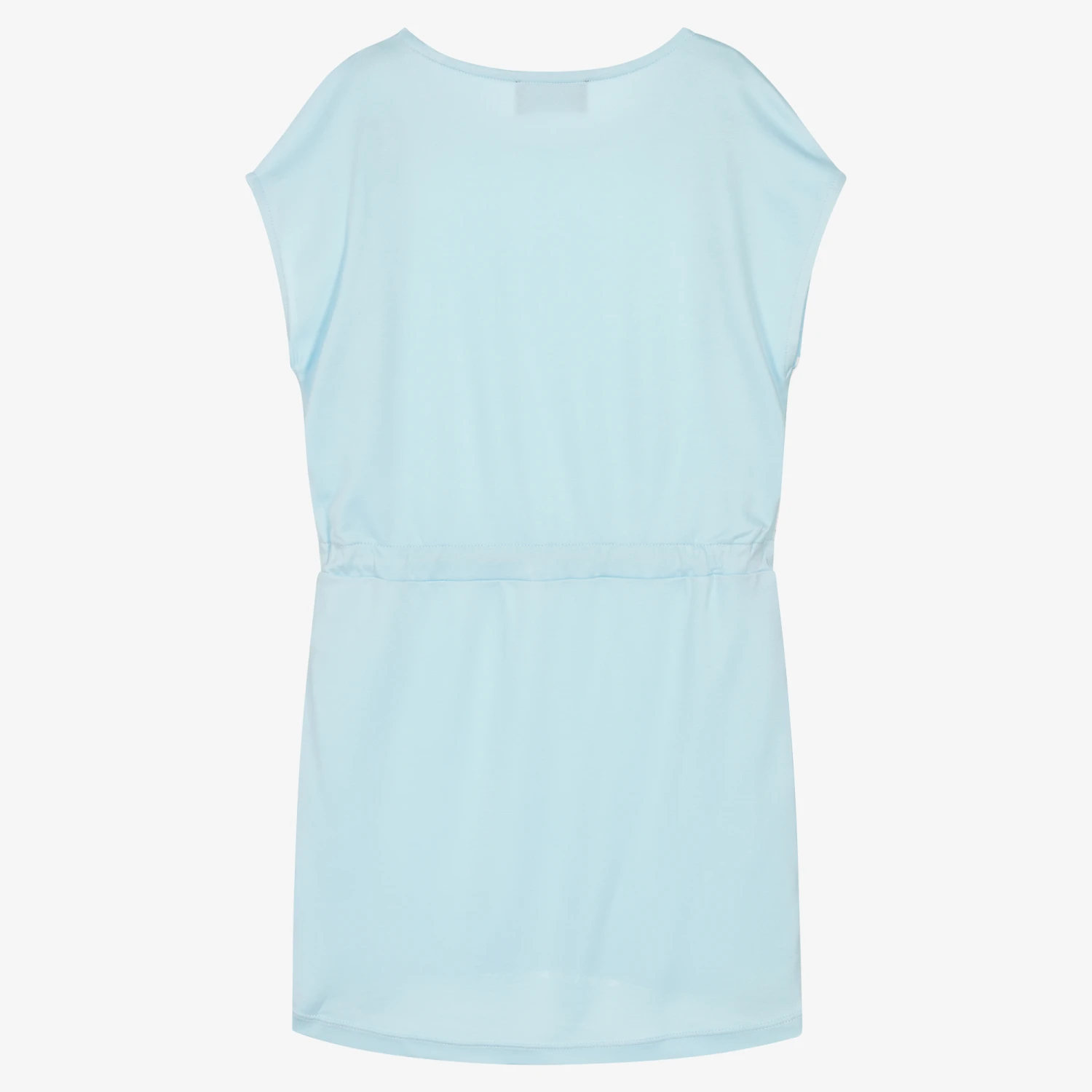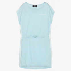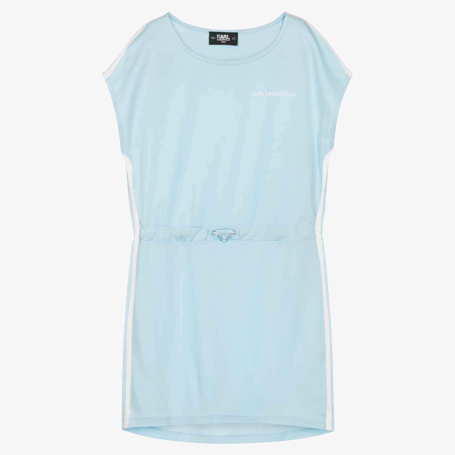 Casual pale blue dress for teen girls by KARL LAGERFELD KIDS, with a white rubberised logo on the chest. Made in super soft and lightweight modal blend jersey with a slightly longer and curved back hem, this dress is a comfortable choice for warmer days. It has a dropped waist with a faux drawstring and toggle details on the front and printed white stripes on the sides and shoulders for a sporty look.