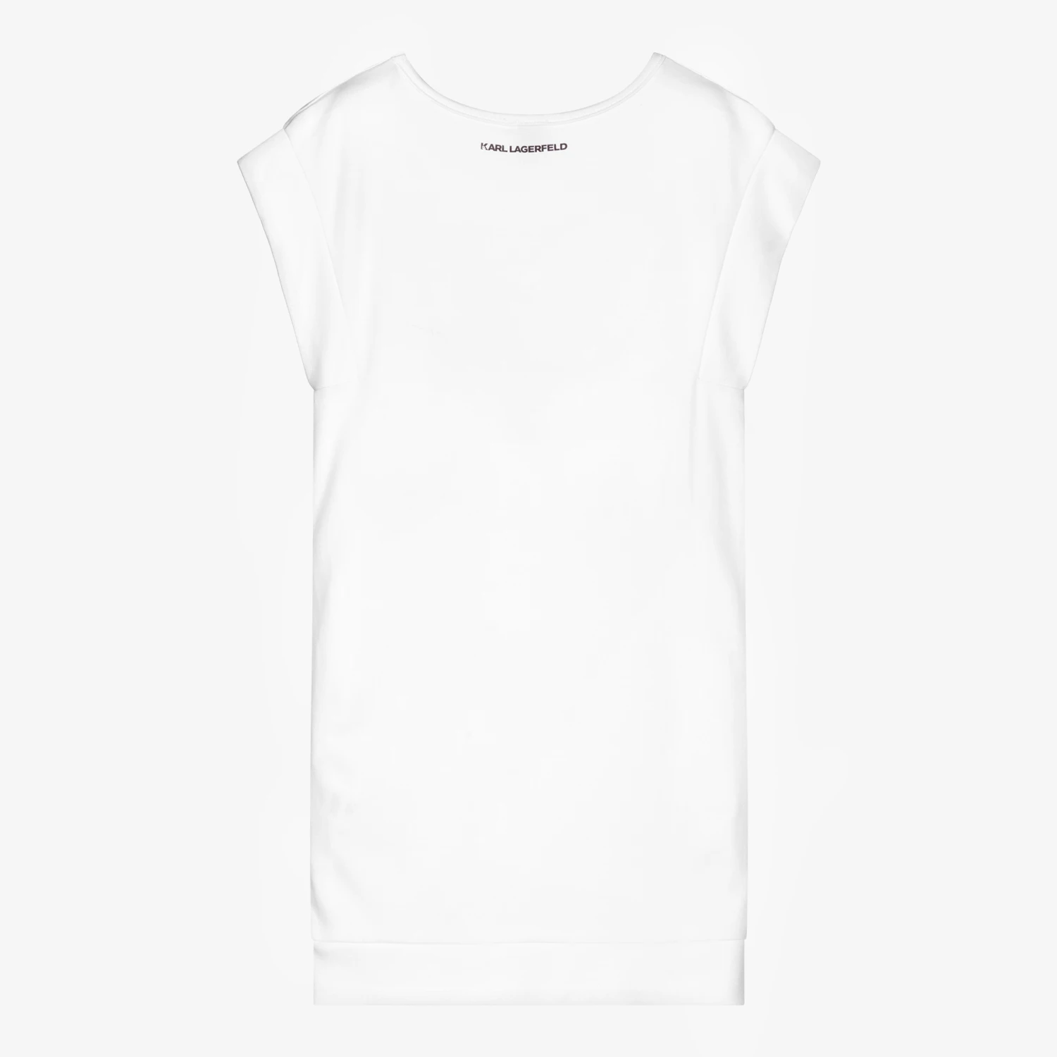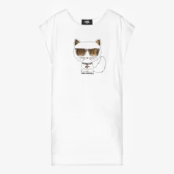 White dress for teen girls by KARL LAGERFELD KIDS, made in super soft and stretchy modal jersey. It has the Choupette print on the front, a hallmark of the brand and famously Karl Lagerfeld’s beloved cat. It has shiny gold foil, zebra print details, and the designer’s logo beneath. It has stylish capped sleeves and a black logo print on the back.