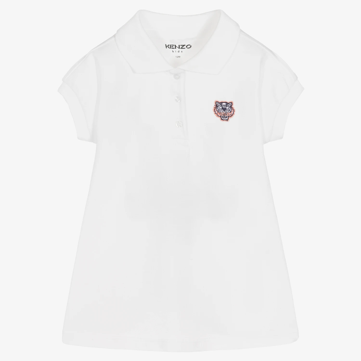 White polo dress for baby girls by KENZO KIDS, made in soft organic cotton piqué. With a classic button-up collar, it has the brand’s instantly recognisable Tiger logo appliqué on the chest.
