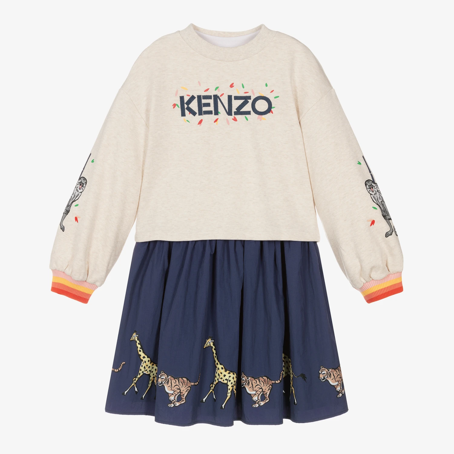 Super cool and versatile two piece dress set for teen girls by iconic French brand KENZO KIDS, with the brand’s bamboo jungle animal theme. Pulling on easily, the dress has a white cotton jersey bodice, with a signature red logo print on the chest. The navy blue skirt is silky smooth and printed with fun giraffes and tigers. Cropped and oversized, the beige marl sweatshirt has striped ribbed cuffs, a statement logo embroidered on the front, and playful grey monkeys printed on the sleeves.
