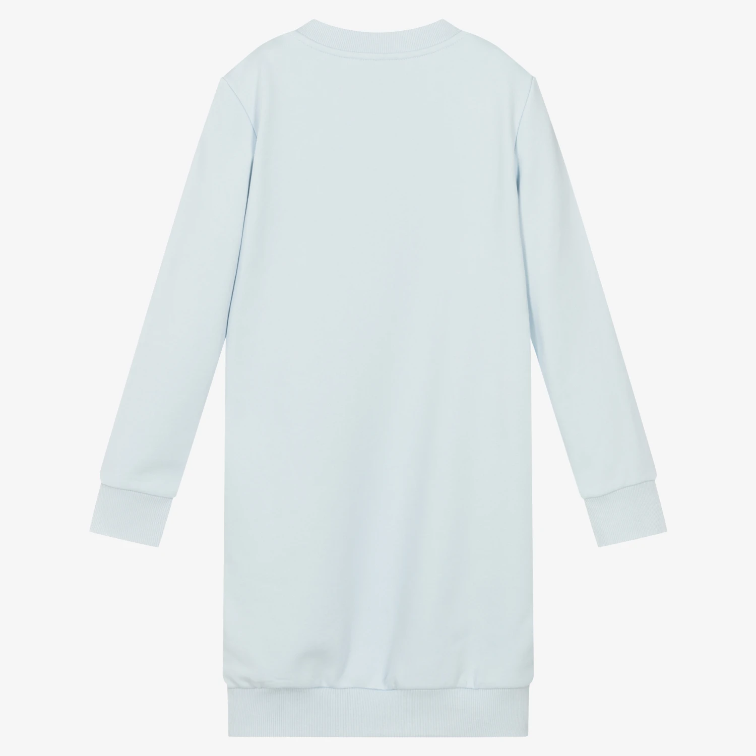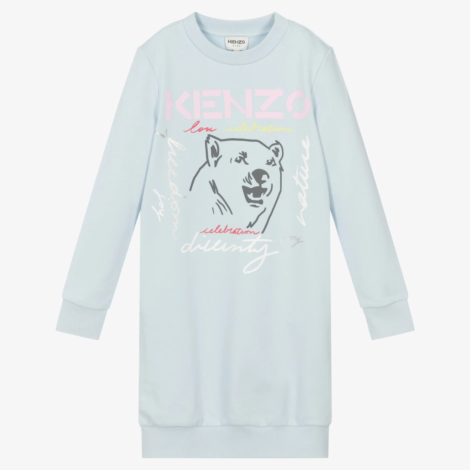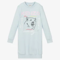 Pale blue sweatshirt dress for teen girls by KENZO KIDS. This relaxed dress has a pale pink logo print across the chest in pink, with a black polar bear below. It is made in comfortable lightweight cotton jersey with concealed side pockets and ribbed trims.