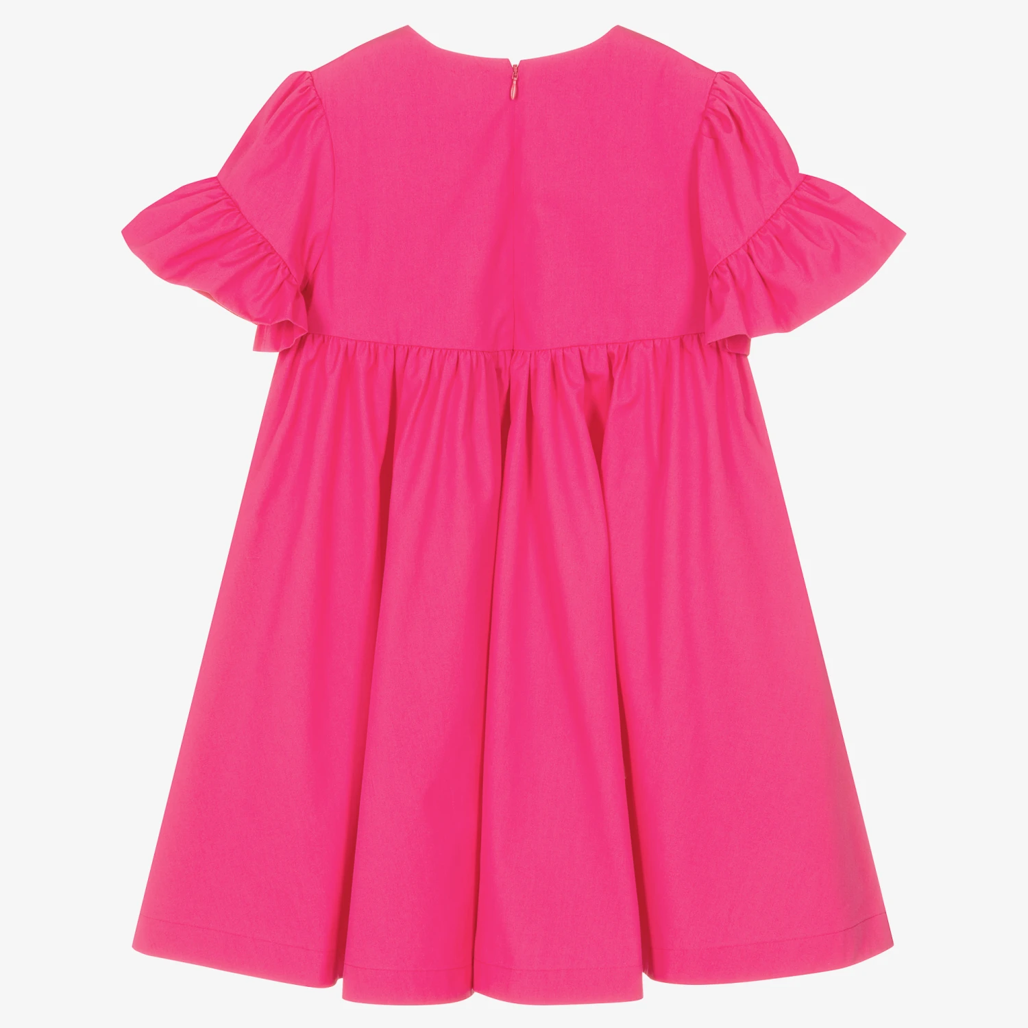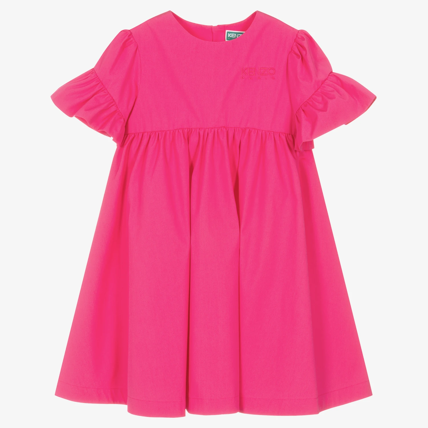 In striking fuchsia pink, this cotton poplin dress for teen girls is by KENZO KIDS. Simply chic, this flared dress has a little ruffle trim on the sleeves and a tonal logo embroidery on the chest. Wear it for both casual and smart occasions, the flattering shape is accentuated by the slightly longer back hem, with a cotton voile lining adding volume and comfort. It fastens with a seamless zip on the back.