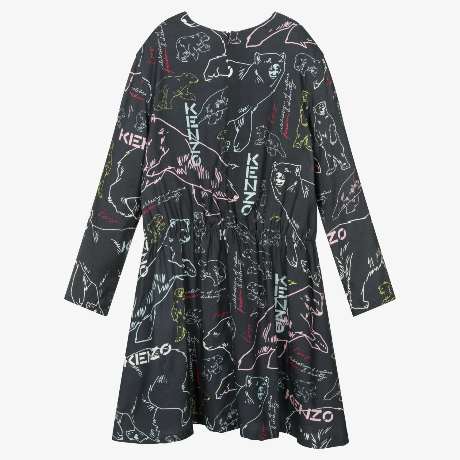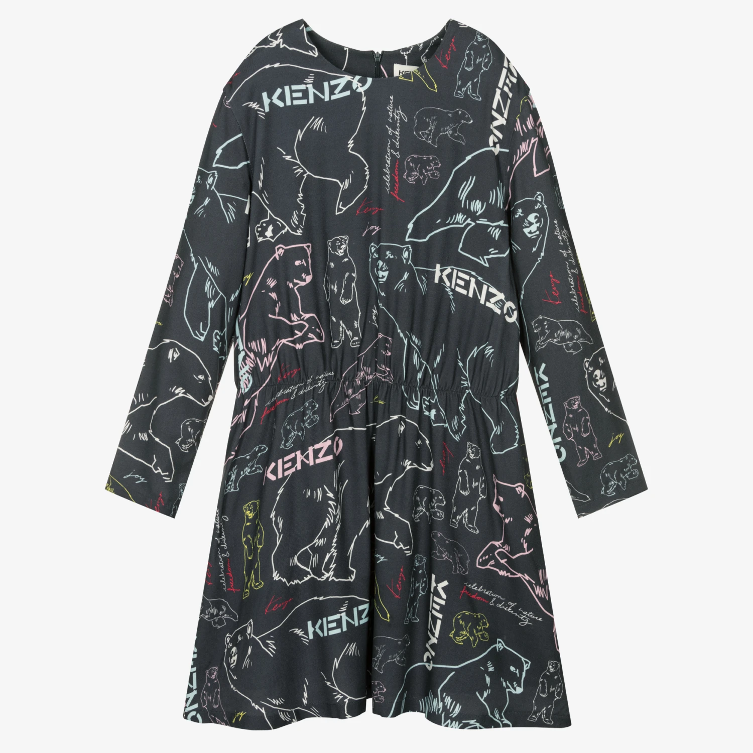 Inspired by the brand’s iconic logos, charcoal grey dress for teen girls by KENZO KIDS. Elasticated at the waist for a feminine silhouette, it features the brand’s most famous emblems printed in stylish pastel colours. Fastening with a concealed zip on the back for a chic finish, it is made in soft viscose twill and has a black voile lining, adding comfort to this stylish look.