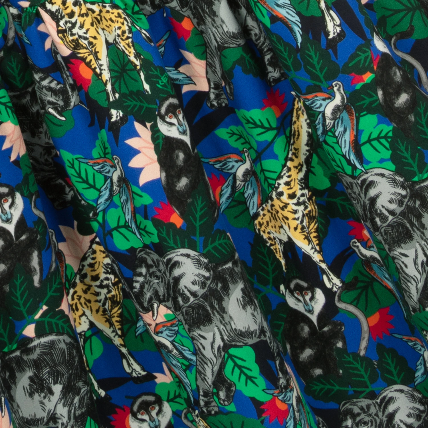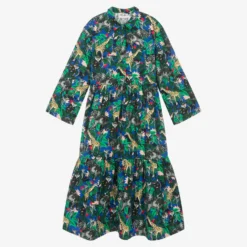 Bold blue and green maxi dress for teen girls by KENZO KIDS. Stand-out from the crowd in the tropical jungle floral and fauna print, with the brand’s logo incorporated throughout. In a chic maxi length, it has shirt dress styling with button fastenings and a pointed collar. Woven in lightweight cotton twill, the skirt has a full shape with stylish tiers.