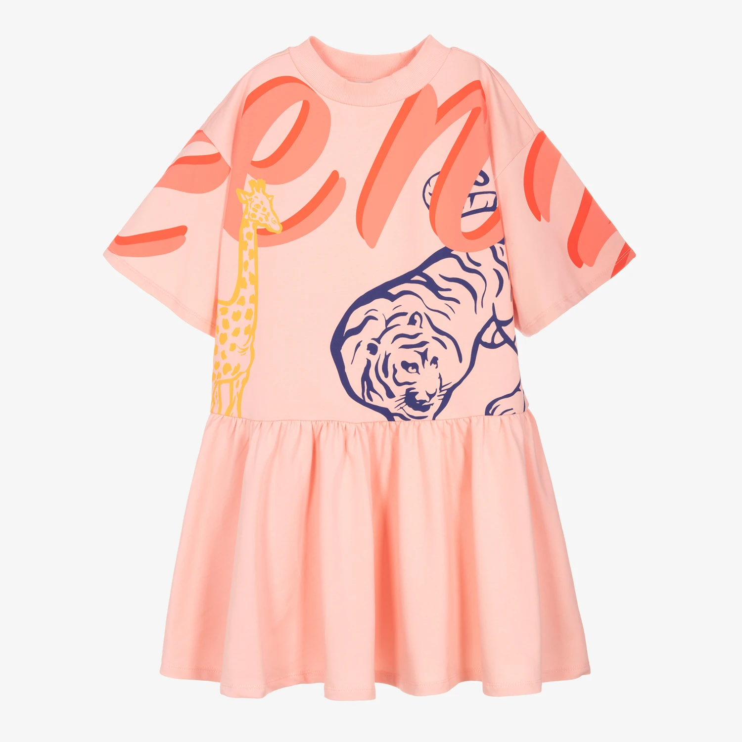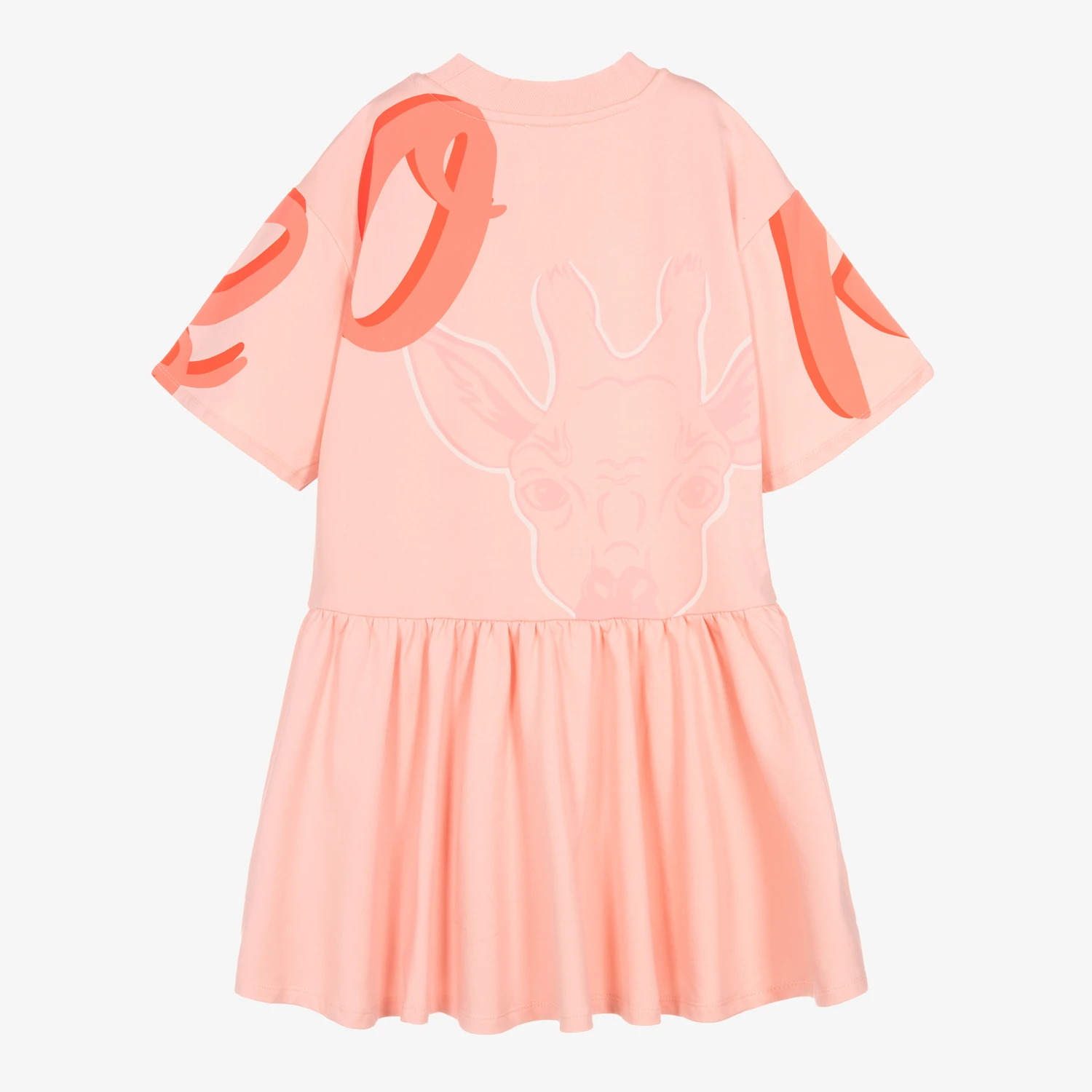 Pale pink dress for teen girls by KENZO KIDS, with the brand’s oversized Multi-iconics print in pink, blue and yellow. A comfortable relaxed style, it is made in soft cotton jersey, with a ribbed crew neck and has a dropped waist with a gathered skirt.