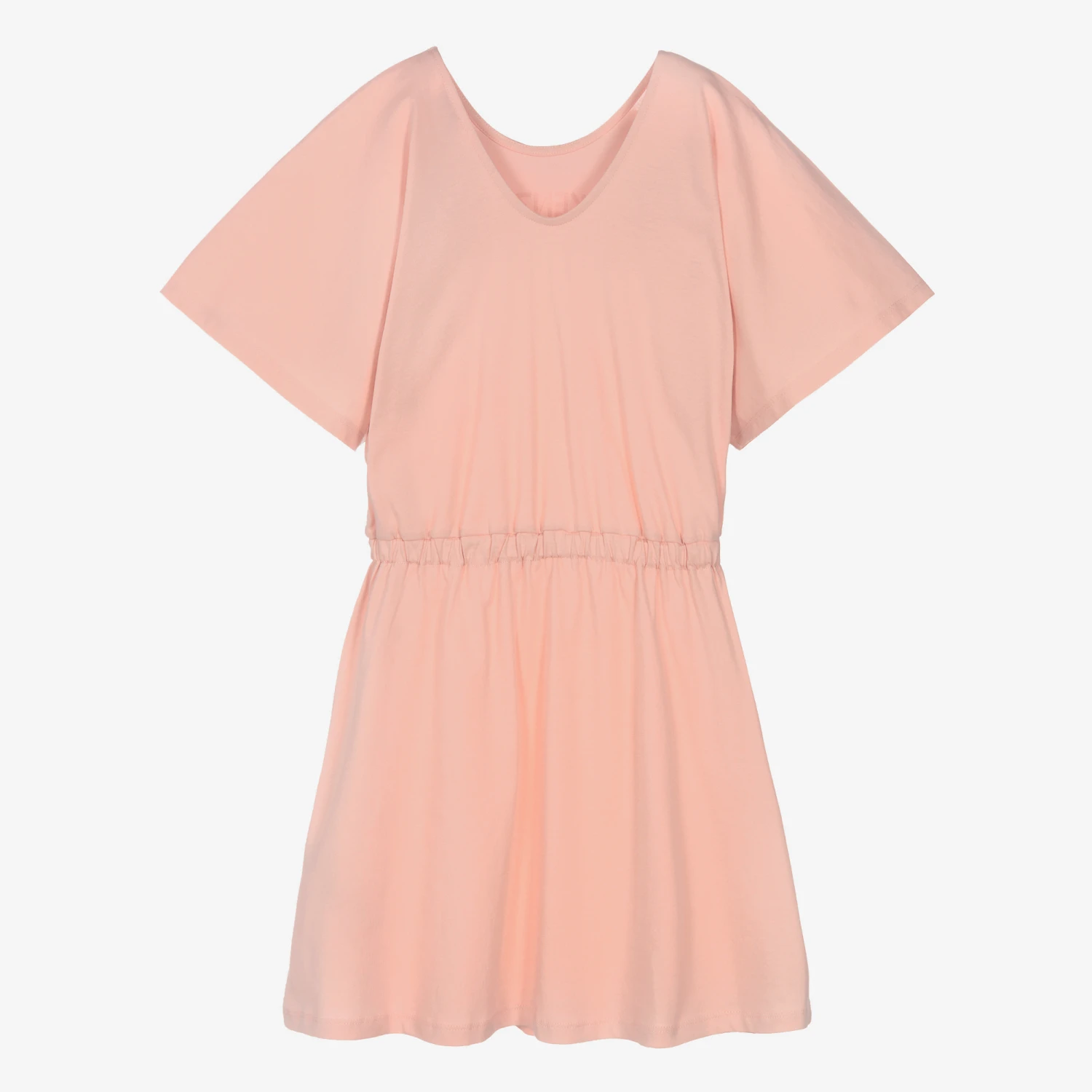 Pale pink dress for teen girls by KENZO KIDS, made in soft organic cotton jersey. In the designer’s signature style, it has a colourful Multi-Iconics logo print on the front. There are dropped shoulders and a elasticated waist, ideal for a cinched in silhouette.