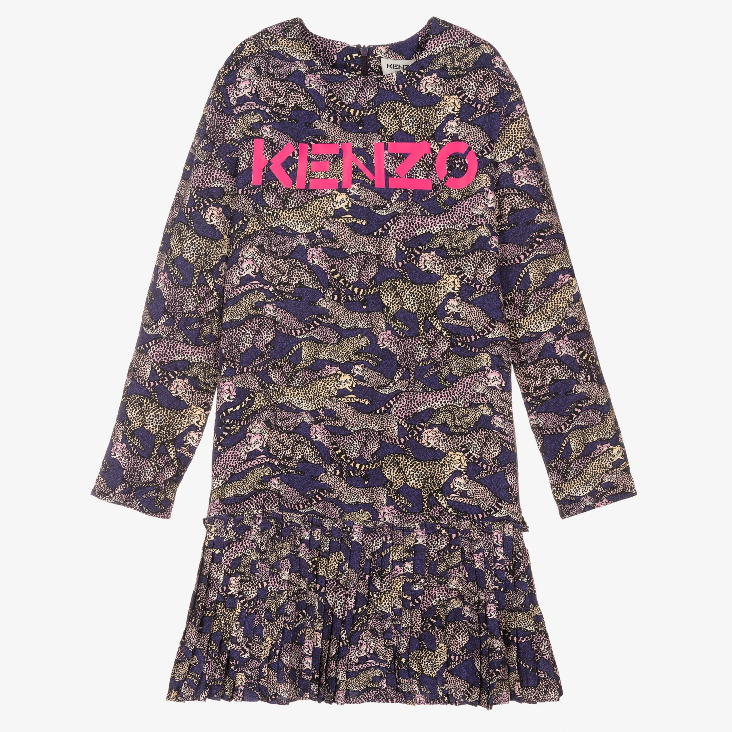 Purple dress for teen girls by KENZO KIDS, with an all over cheetah print in shades of pink and ivory, and a neon pink logo on the chest. Made in soft, mid-weight viscose, with a jersey feel and a lightweight lining for added comfort. The hem is pleated with a ruffle trim for a feminine look and there is a concealed zip fastening on the back.