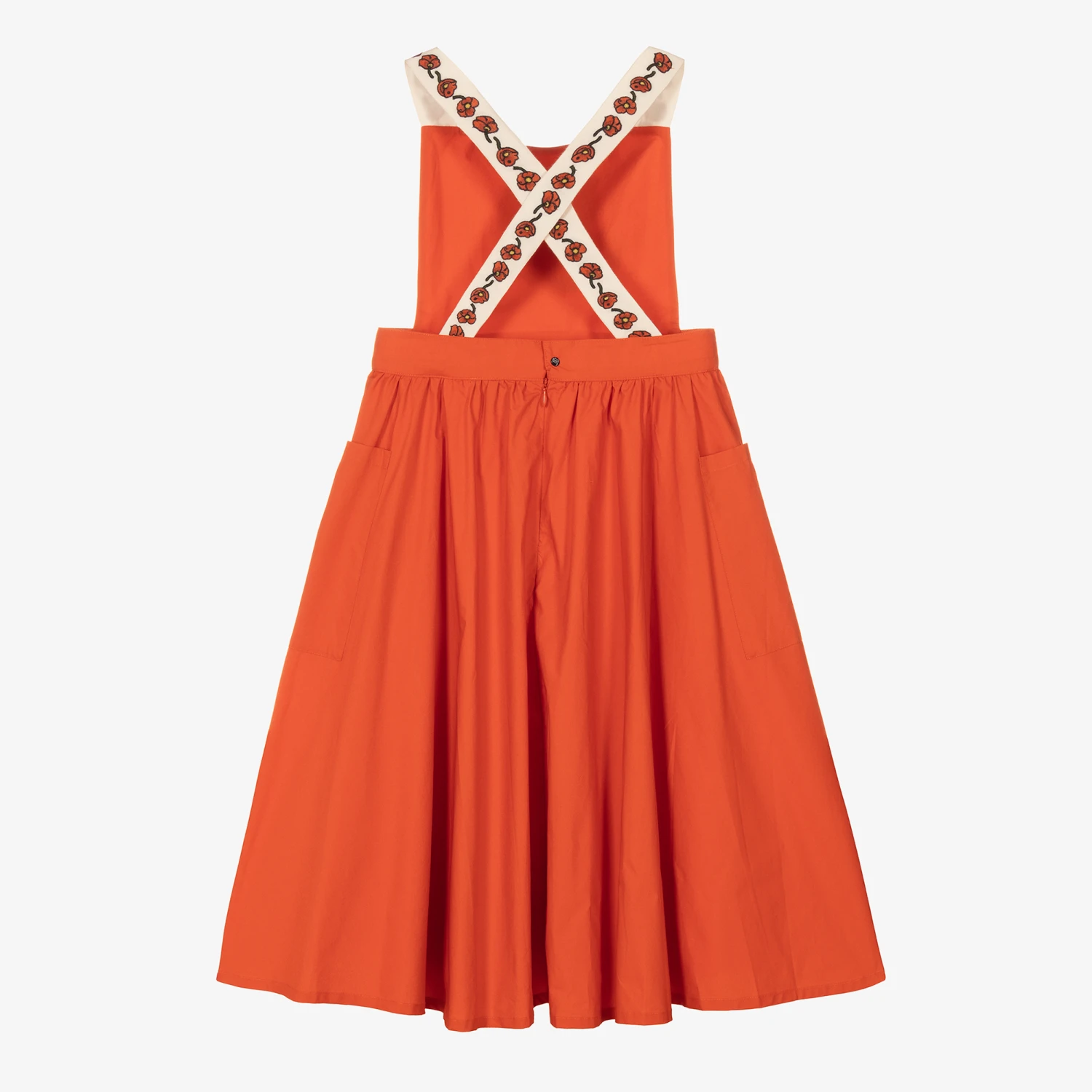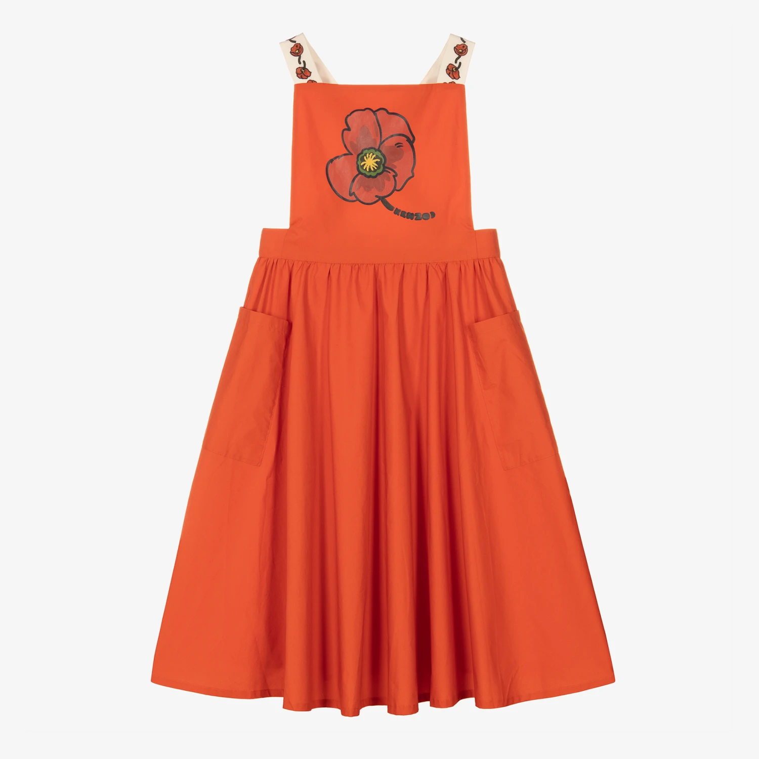 A flowy pinafore dress for teen girls by luxury brand KENZO KIDS, featuring a graphic poppy print. Innovatively designed, the brand’s logo is subtly incorporated in the stem, with poppies embroidered throughout the white straps for added boldness. The straps cross-over at the back, attaching with adjustable buttons to create a confident fit. Lightweight for summer styling, this poplin dress has pouch pockets, with a zip and popper fastening at the back.
